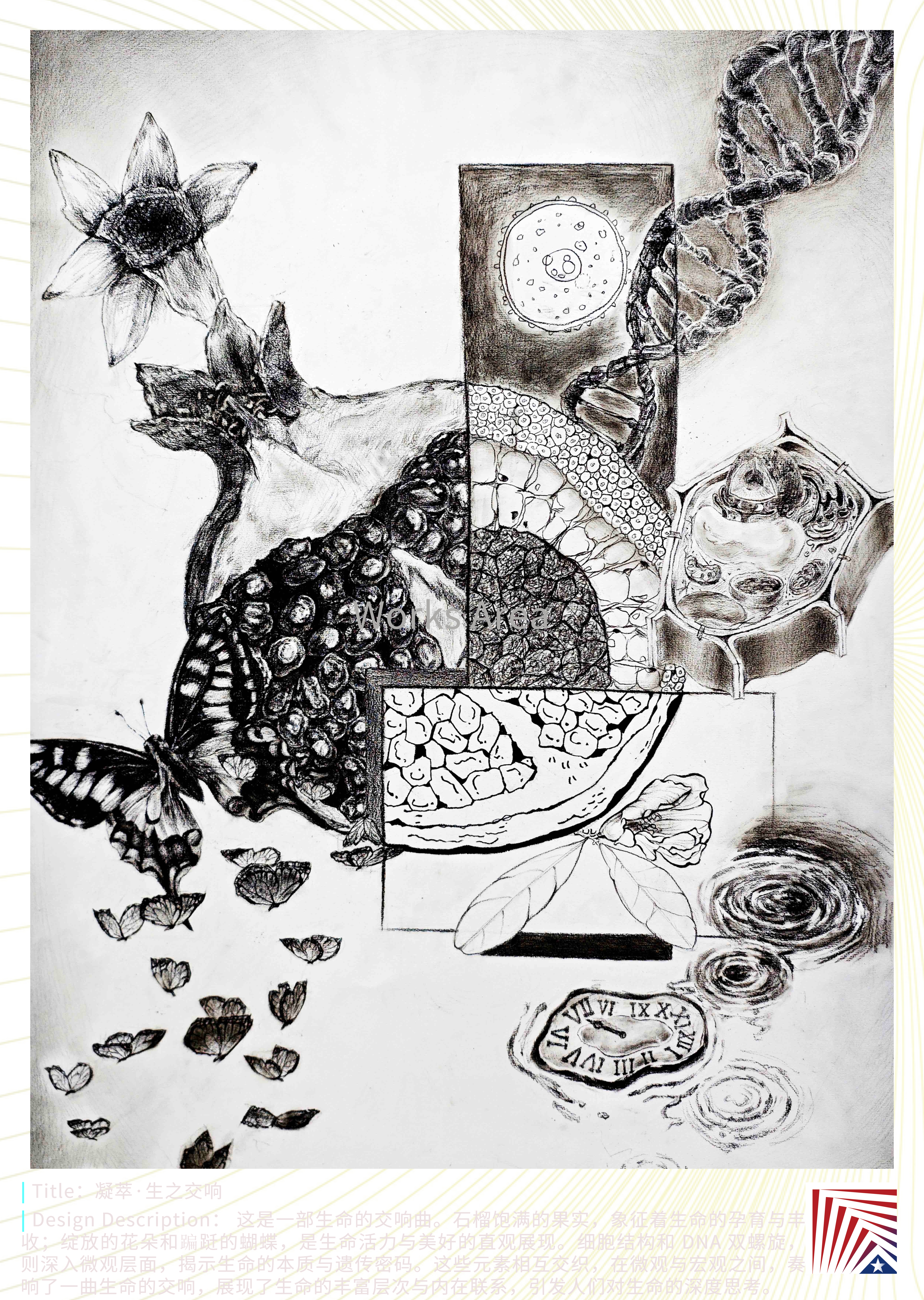 作品说明:这幅作品是一部生命的交响曲。石榴饱满的果实,象征着生命的孕育与丰收;绽放的花朵和蹁跹的蝴蝶,是生命活力与美好的直观展现。细胞结构和 DNA 双螺旋,则深入微观层面,揭示生命的本质与遗传密码。这些元素相互交织,在微观与宏观之间,奏响了一曲生命的交响,展现了生命的丰富层次与内在联系,引发人们对生命的深度思考。
