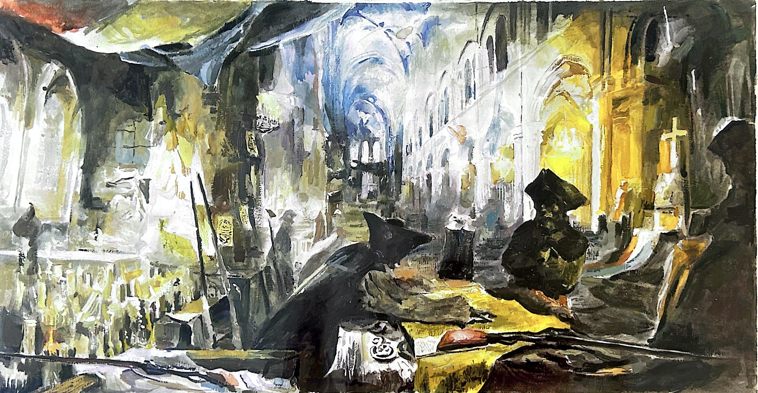 色彩运用上,黄、白、灰、黑交织,既展现出建筑内部的古朴与沧桑,又传递出一种神圣感。画家通过粗犷而富有表现力的笔触,勾勒出空间的立体感与纵深感,使观者仿佛置身于这静谧且略带神秘的场所。整体而言,作品似在捕捉宗教场所中那份超脱尘世的虔诚与静谧,唤起人们内心深处对精神信仰的敬畏与思索。
