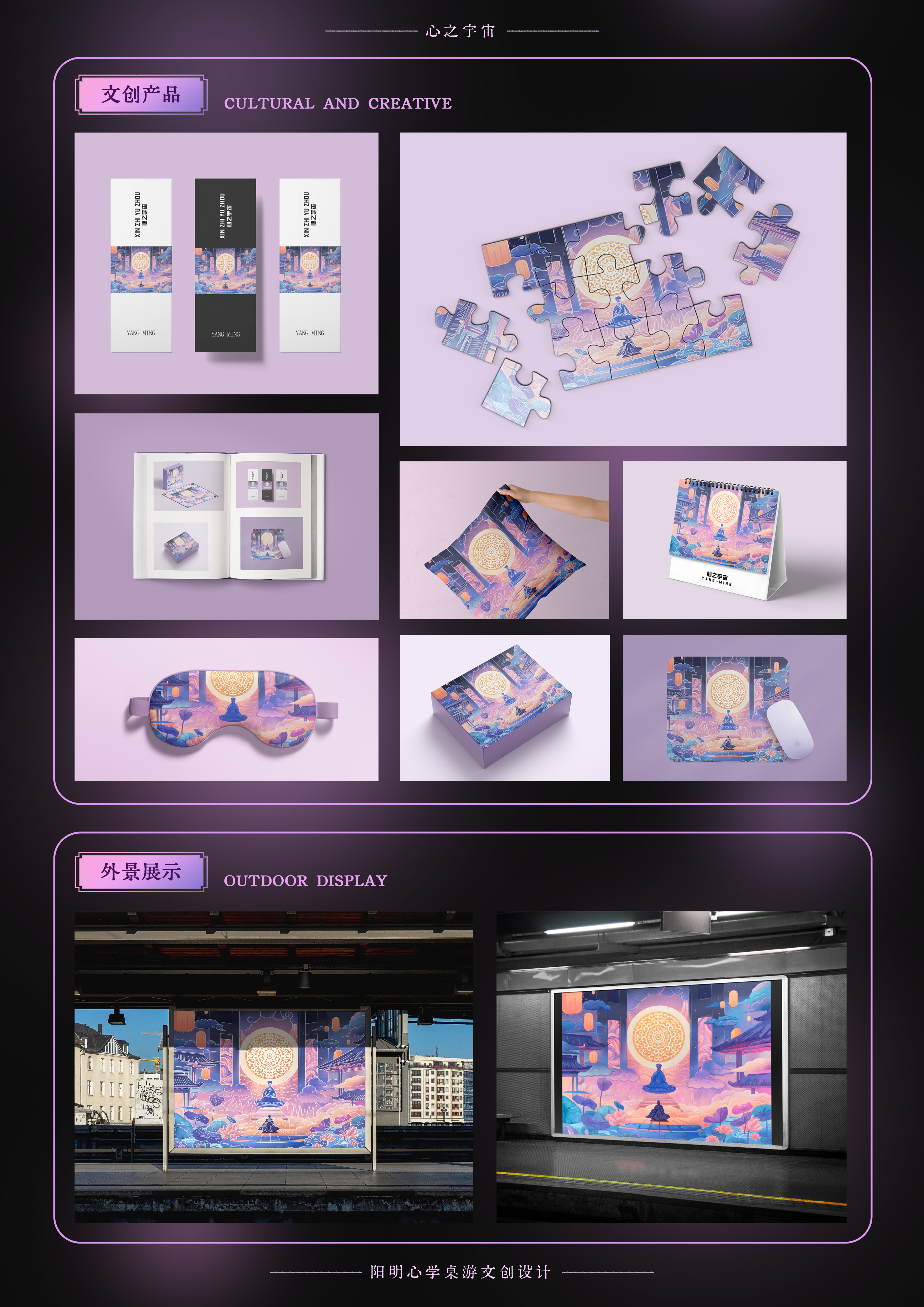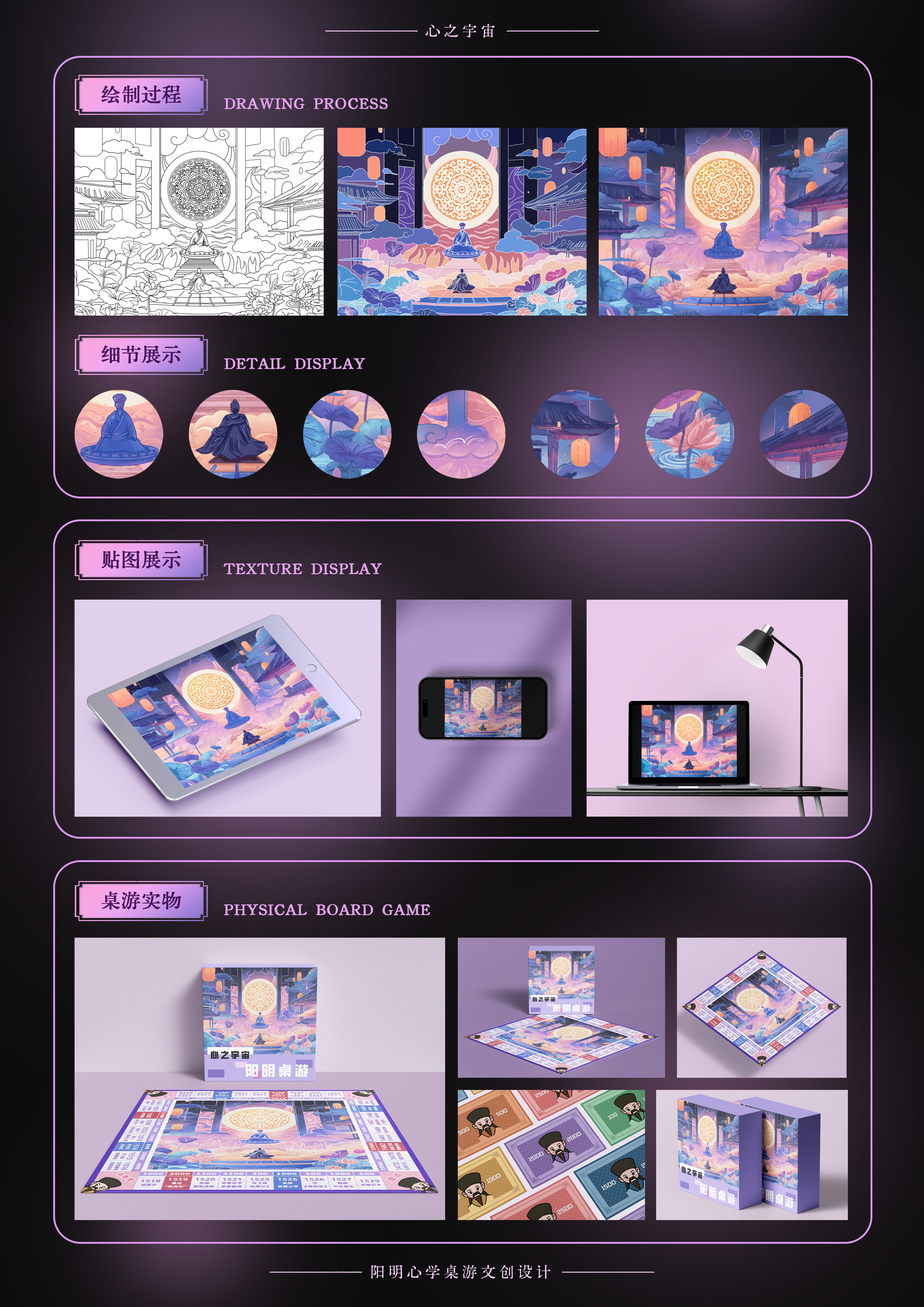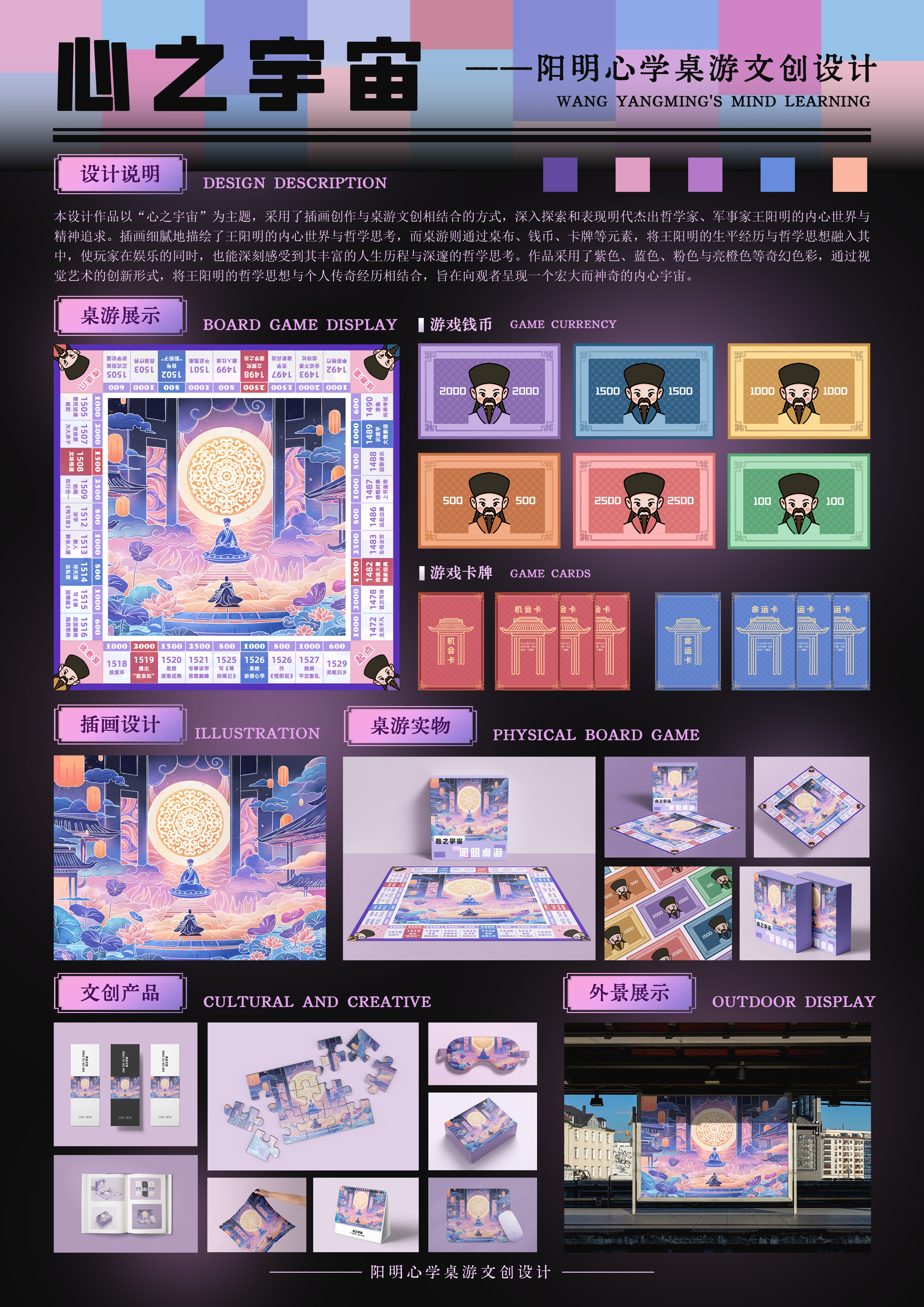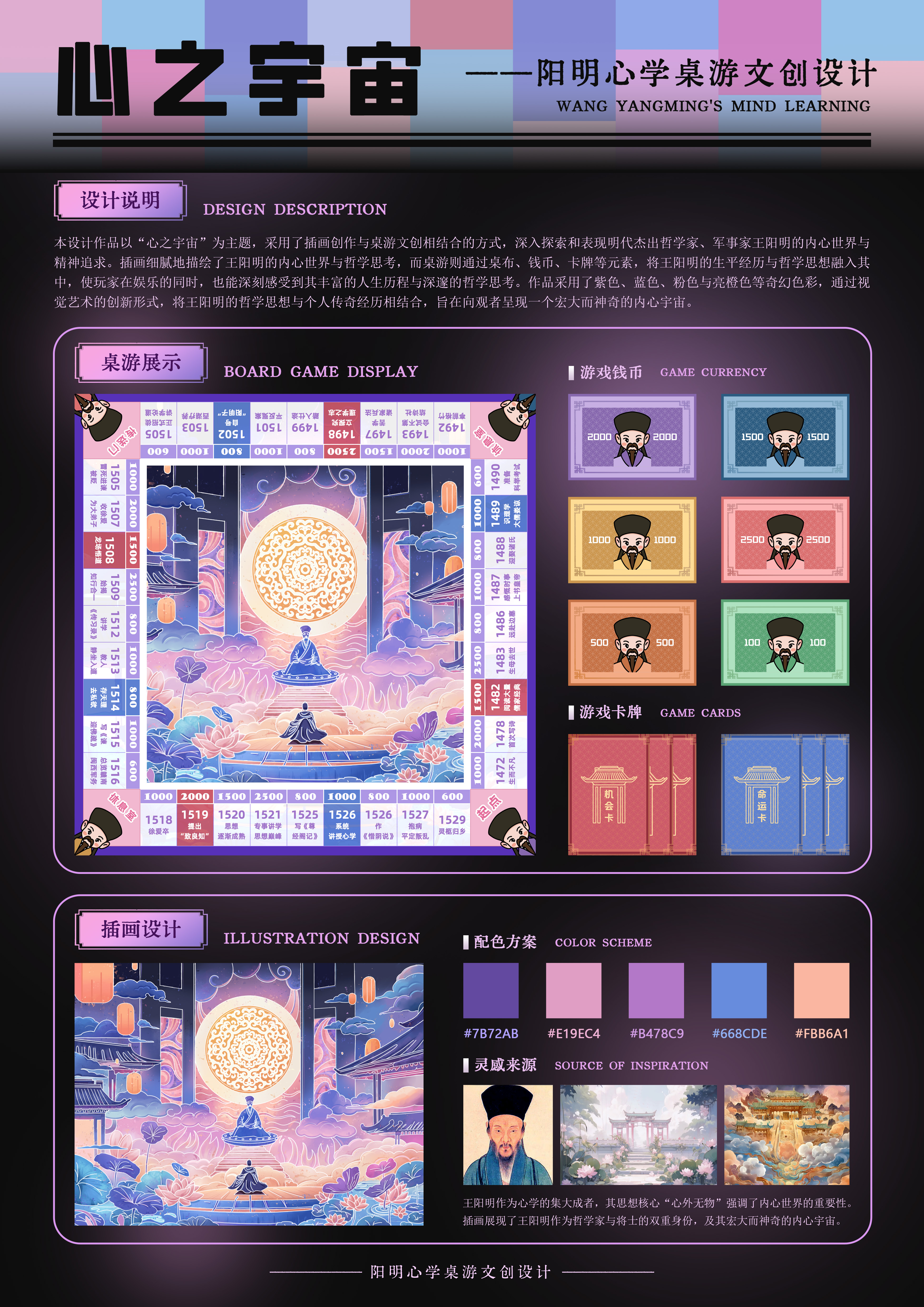 作品说明:本设计作品以“心之字宙”为主题,采用了插画创作与桌游文创相结合的方式,深入探索和表现明代杰出哲学家、军事家王阳明的内心世界与