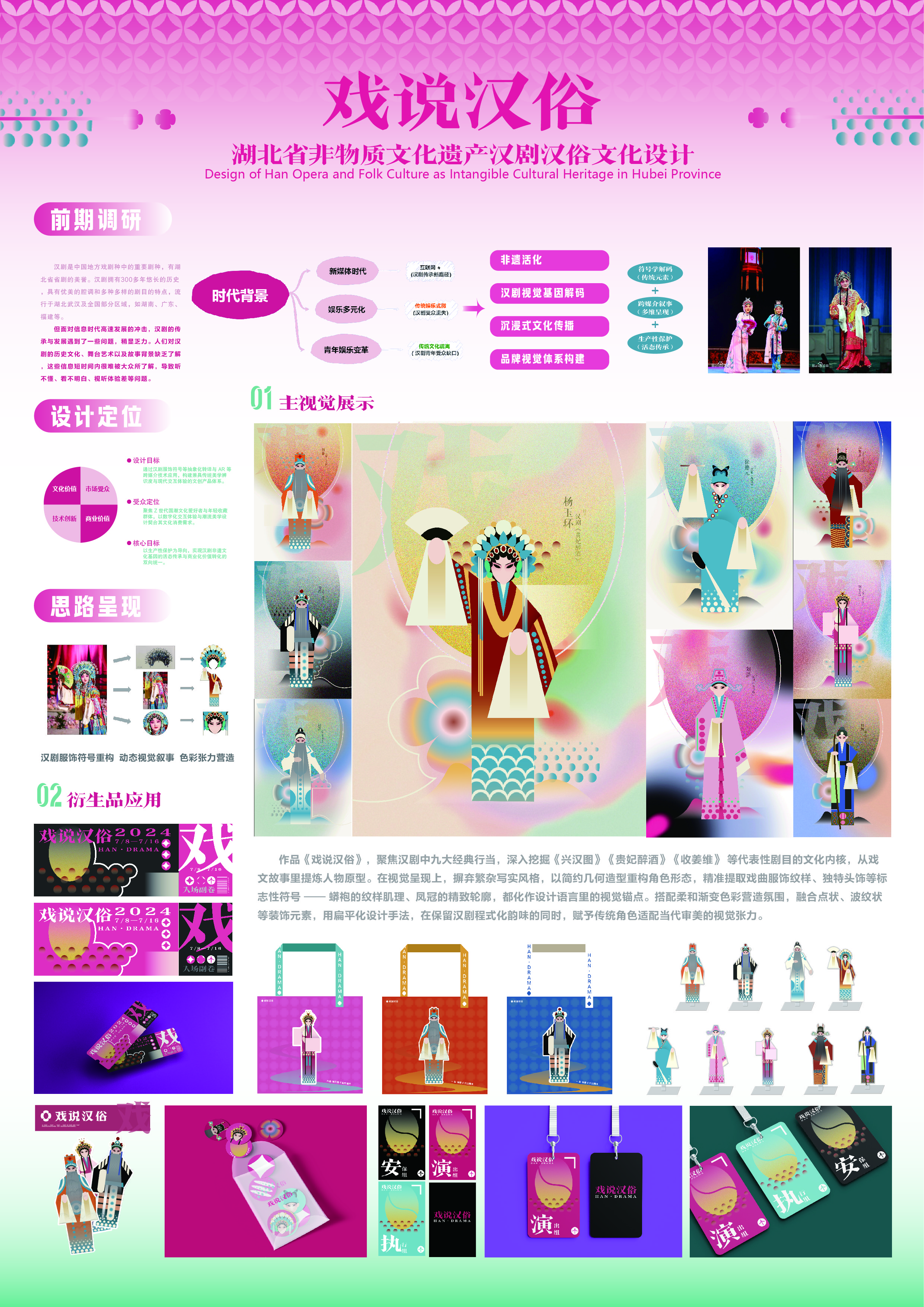 作品说明:作品《戏说汉俗》,聚焦汉剧中九大经典行当,深入挖掘《兴汉图》《贵妃醉酒》《收姜维》 等代表性剧目的文化内核,从戏文故事里提炼人物原型。在视觉呈现上,摒弃繁杂写实风格,以简约几何造型重构角色形态,精准提取戏曲服饰纹样、独特头饰等标志性符号 —— 蟒袍的纹样肌理、凤冠的精致轮廓,都化作设计语言里的视觉锚点。搭配柔和渐变色彩营造氛围,融合点状、波纹状等装饰元素,用扁平化设计手法,在保留汉剧程式化韵味的同时,赋予传统角色适配当代审美的视觉张力。