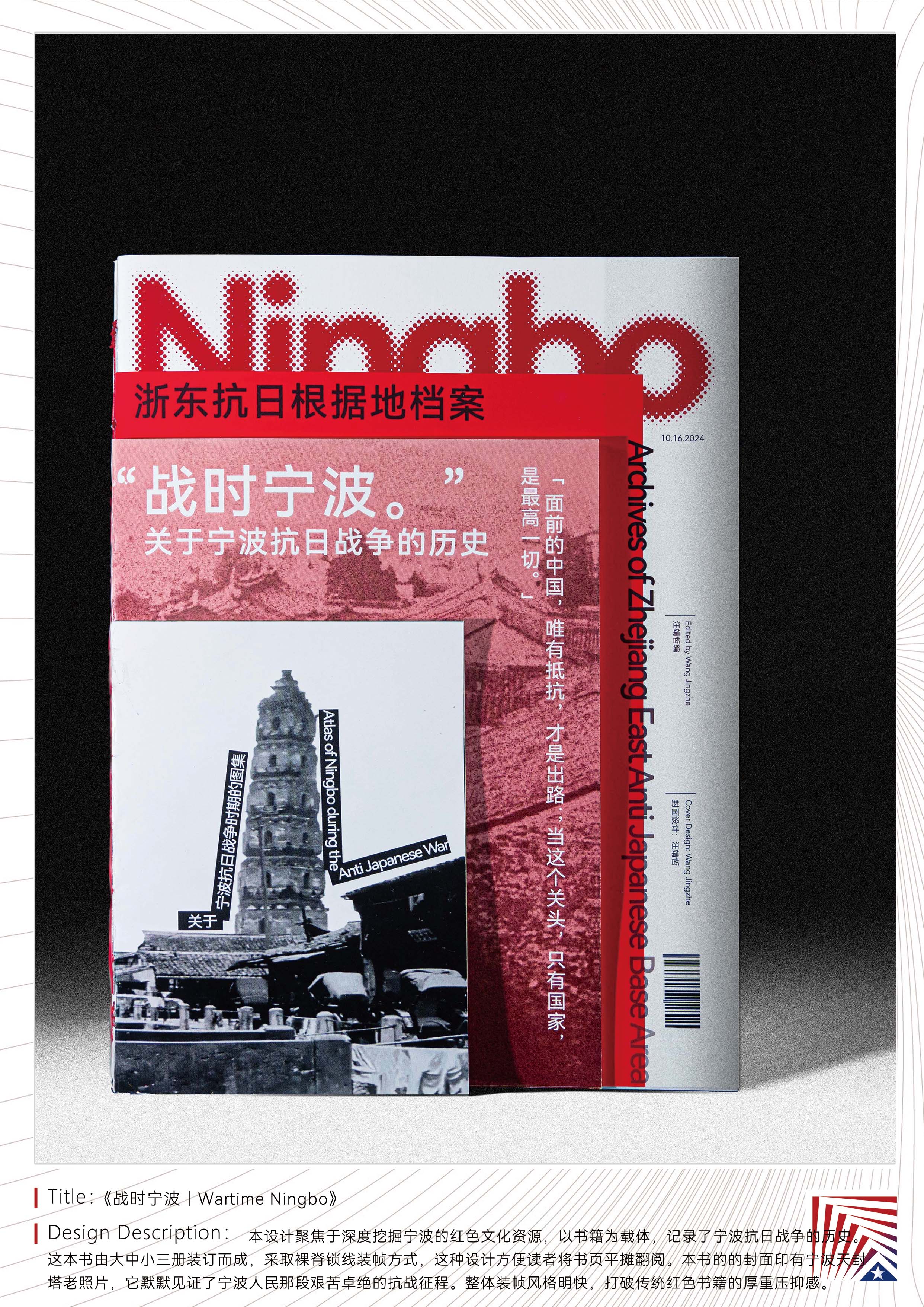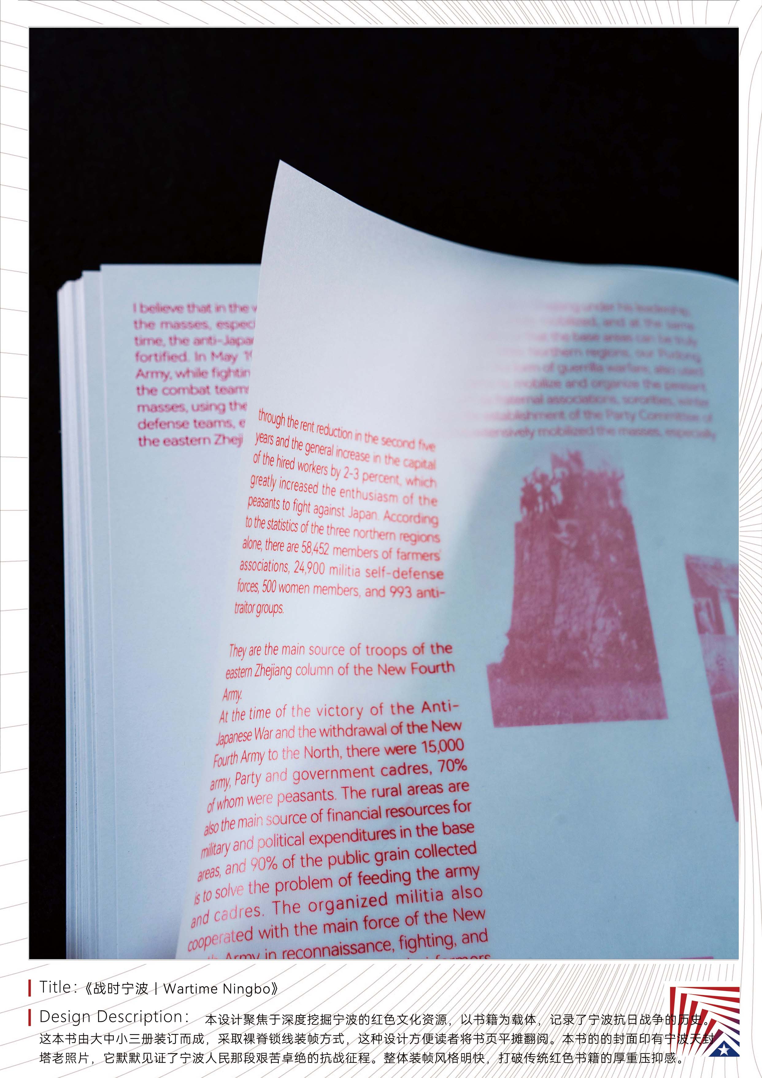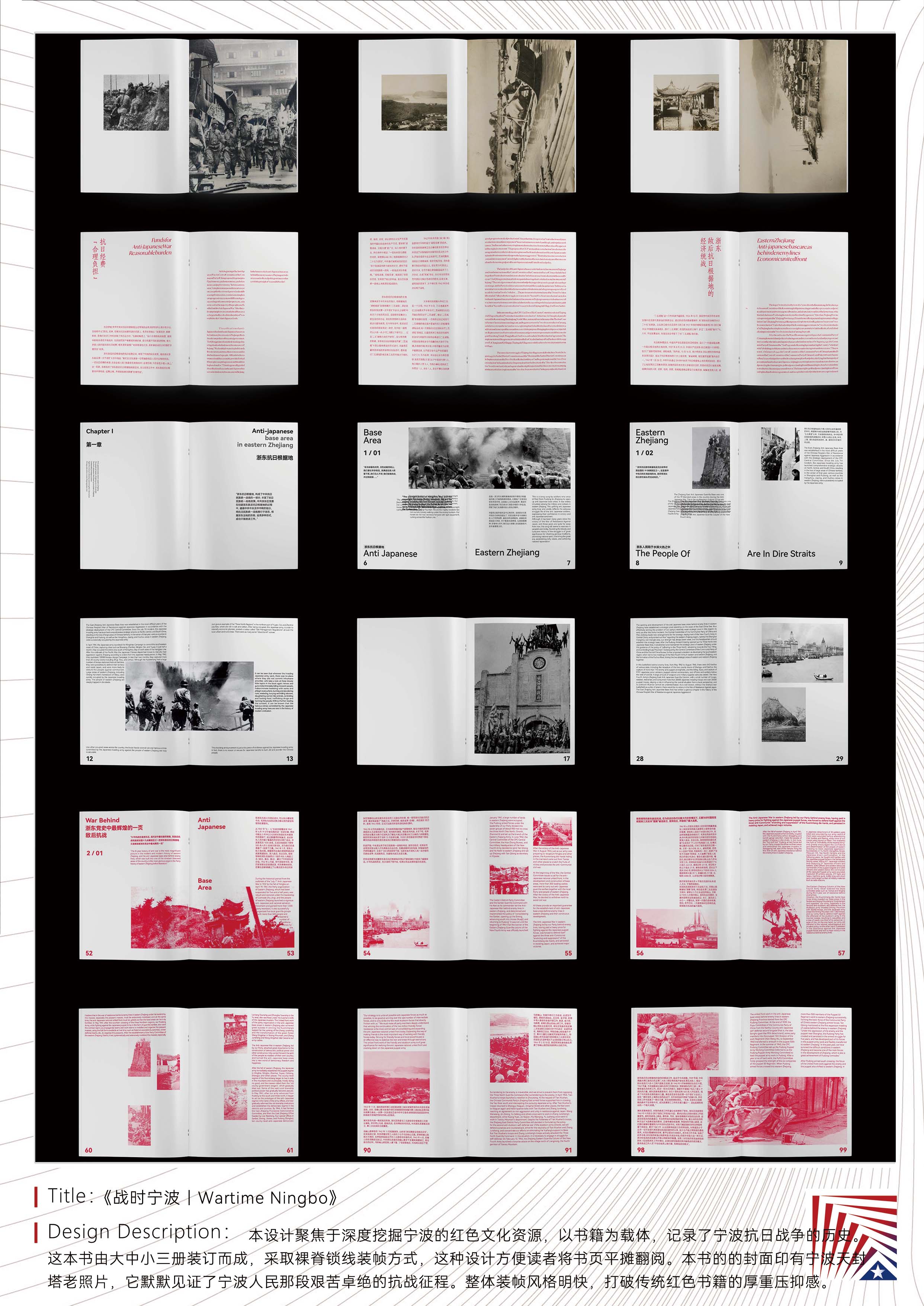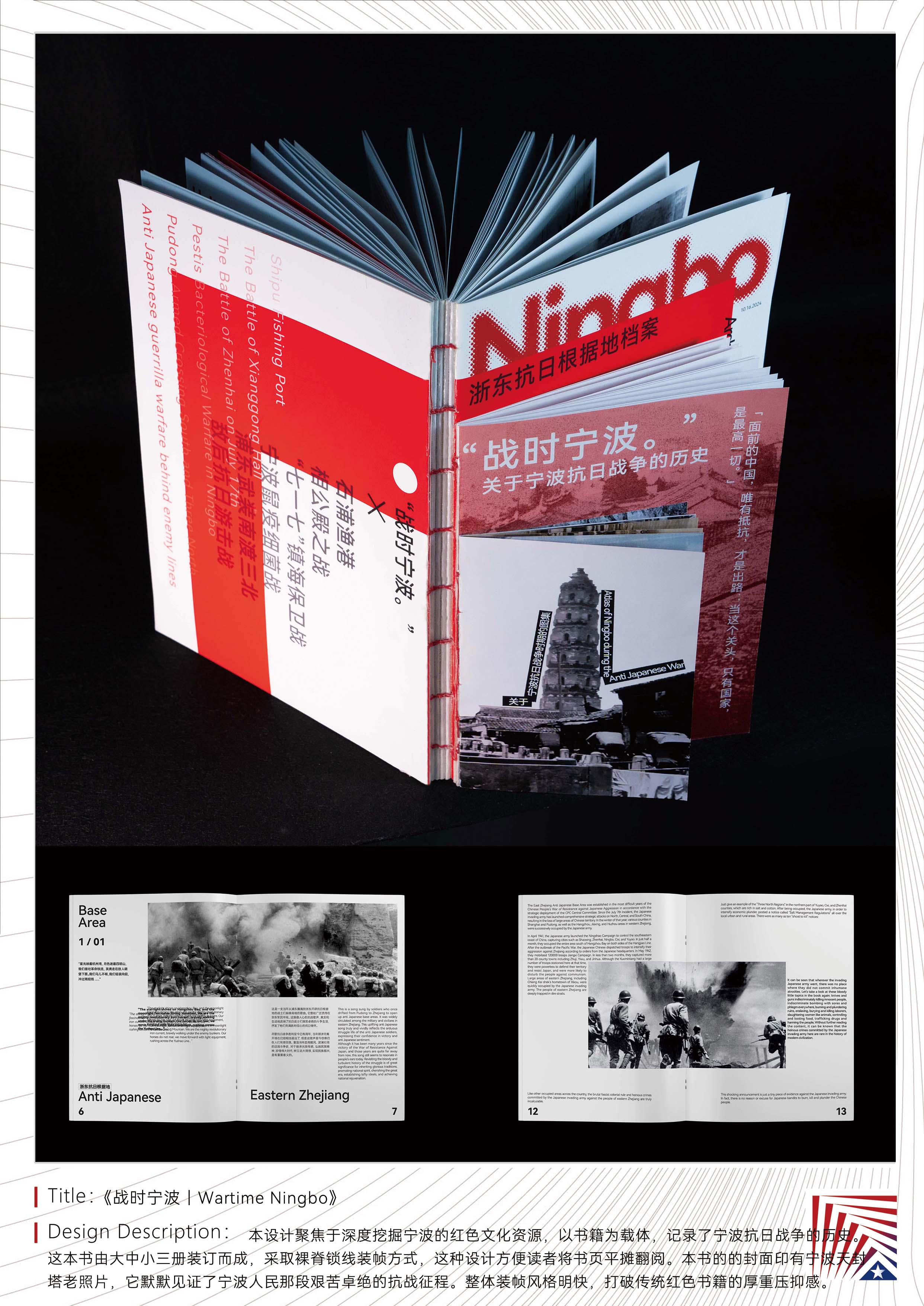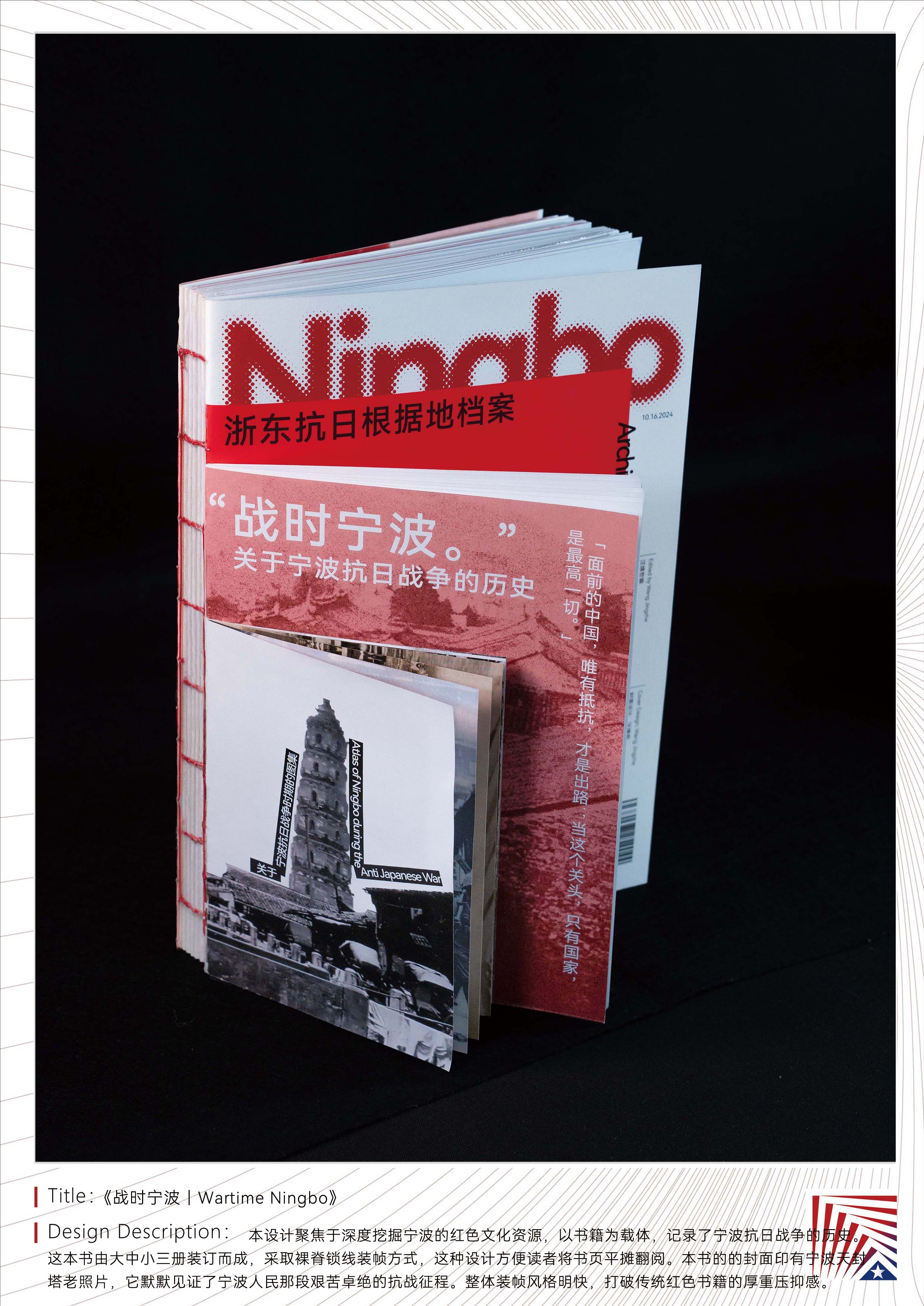 作品说明:本设计聚焦于深度挖掘宁波的红色文化资源,以书籍为载体,记录了宁波抗日战争的历史。这本书由大中小三册装订而成,采取裸脊锁线装帧方式,这种设计方便读者将书页平摊翻阅。本书的的封面印有宁波天封塔老照片,它默默见证了宁波人民那段艰苦卓绝的抗战征程。整体装帧风格明快,打破传统红色书籍的厚重压抑感。