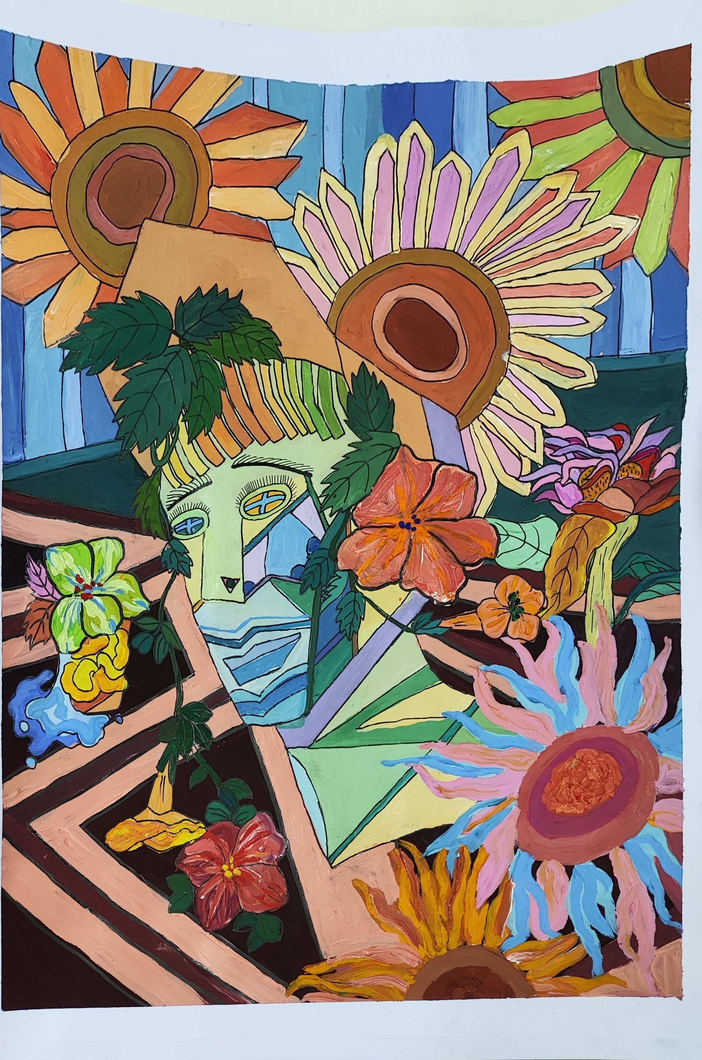 作品说明:这幅作品以立体主义手法解构了晴日午茶的传统意象。画中女性形象汲取毕加索《哭泣的女人》的几何碎片化处理,将优雅的茶具与扭曲的面部轮廓形成荒诞对话。凌霄花的血色藤蔓自破碎的瓷杯攀缘而上,与向日葵的金色光斑在棱角分明的空间里角逐。冷暖色调的碰撞中,钴蓝阴影与赭石色块在画面边缘持续角力,既延续了立体派对多维空间的探索,又通过植物图腾的介入构建出新的生命隐喻——那些看似撕裂的面部线条实则暗合凌霄花茎的生长轨迹,而茶杯里沸腾而出的波浪正倾斜而下。这种视觉悖论恰如其分地展现了现代生活中的情感张力:在理性解构与感性绽放的临界点,永恒定格着属于都市女性的存在主义茶会。