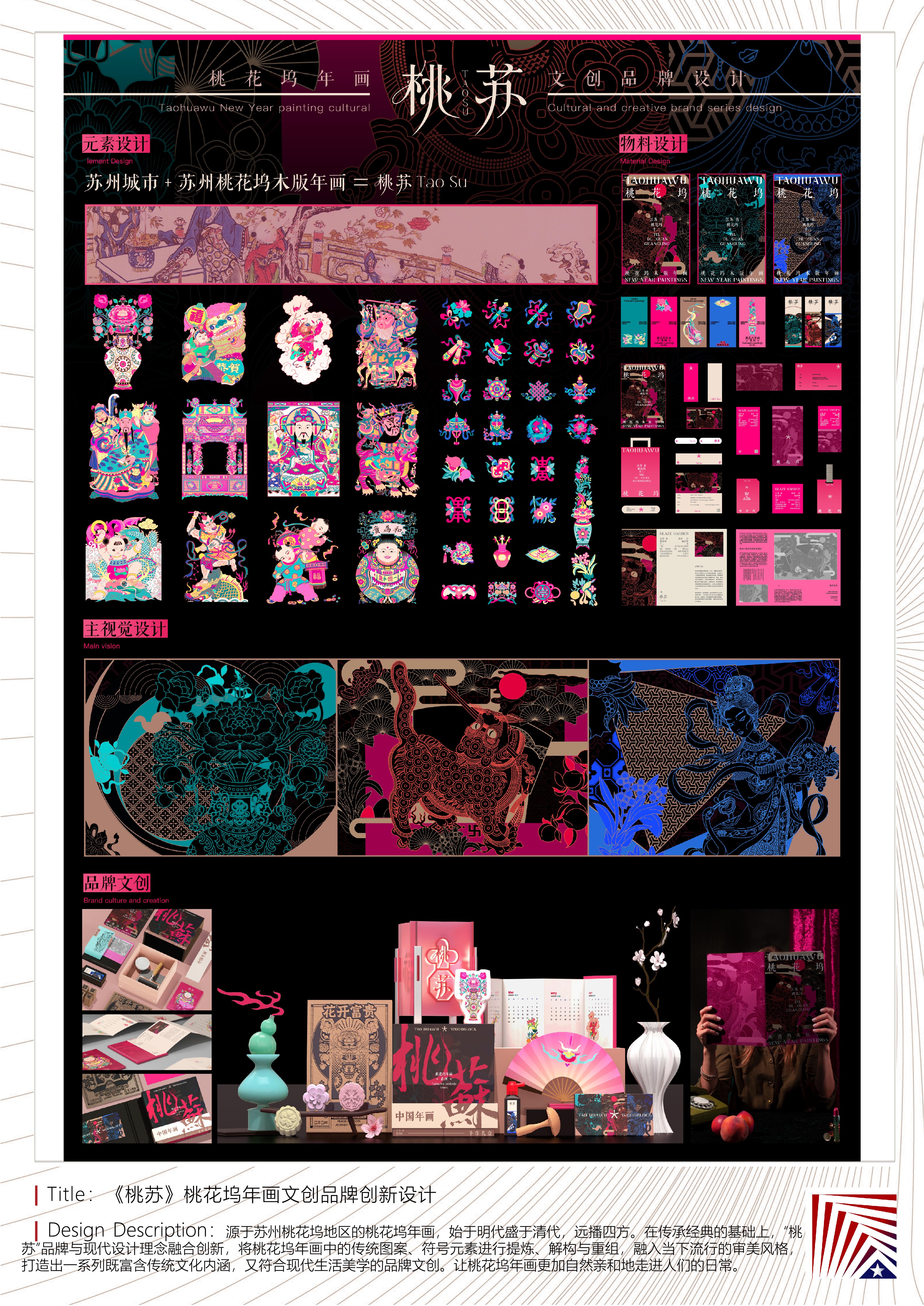 作品说明:源于苏州桃花坞地区的桃花坞年画,始于明代盛于清代,远播四方。在传承经典的基础上,“桃苏”品牌与现代设计理念融合创新,将桃花坞年画中的传统图案、符号元素进行提炼、解构与重组,融入当下流行的审美风格,打造出一系列既富含传统文化内涵,又符合现代生活美学的品牌文创。让桃花坞年画更加自然亲和地走进人们的日常。
