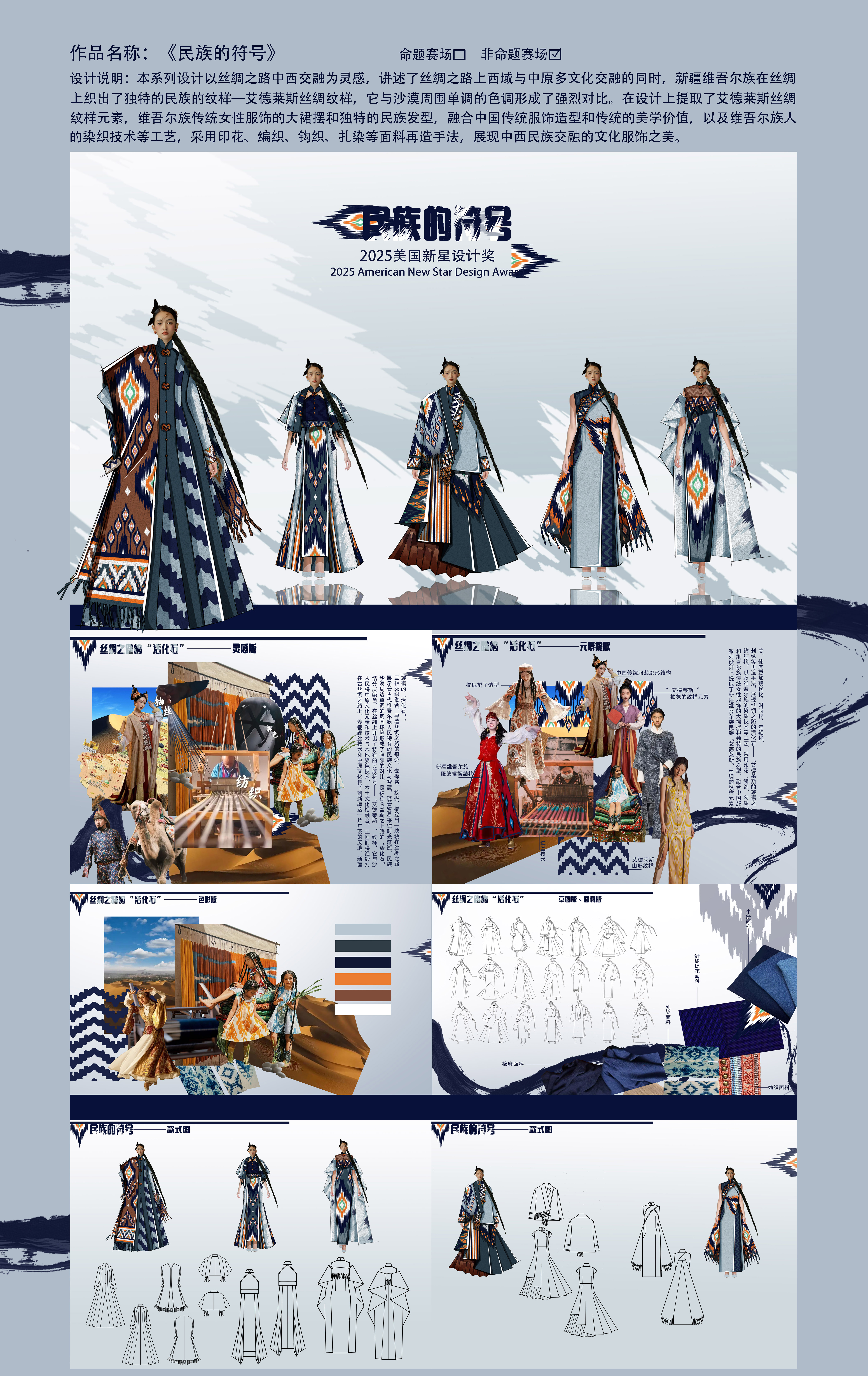 作品说明:设计说明:本系列设计以丝绸之路中西交融为灵感,讲述了丝绸之路上西域与中原多文化交融的同时,新疆维吾尔族在丝绸上织出了独特的民族的纹样一艾德莱斯丝绸纹样,它与沙漠周围单调的色调形成了强烈对比。在设计上提取了艾德莱斯丝绸纹样元素,维吾尔族传统女性服饰的大裙摆和独特的民族发型,融合中国传统服饰造型和传统的美学价值,以及维吾尔族人的染织技术等工艺,采用印花、编织、钩织、扎染等面料再造手法,展现中西民族交融的文化服饰之美。