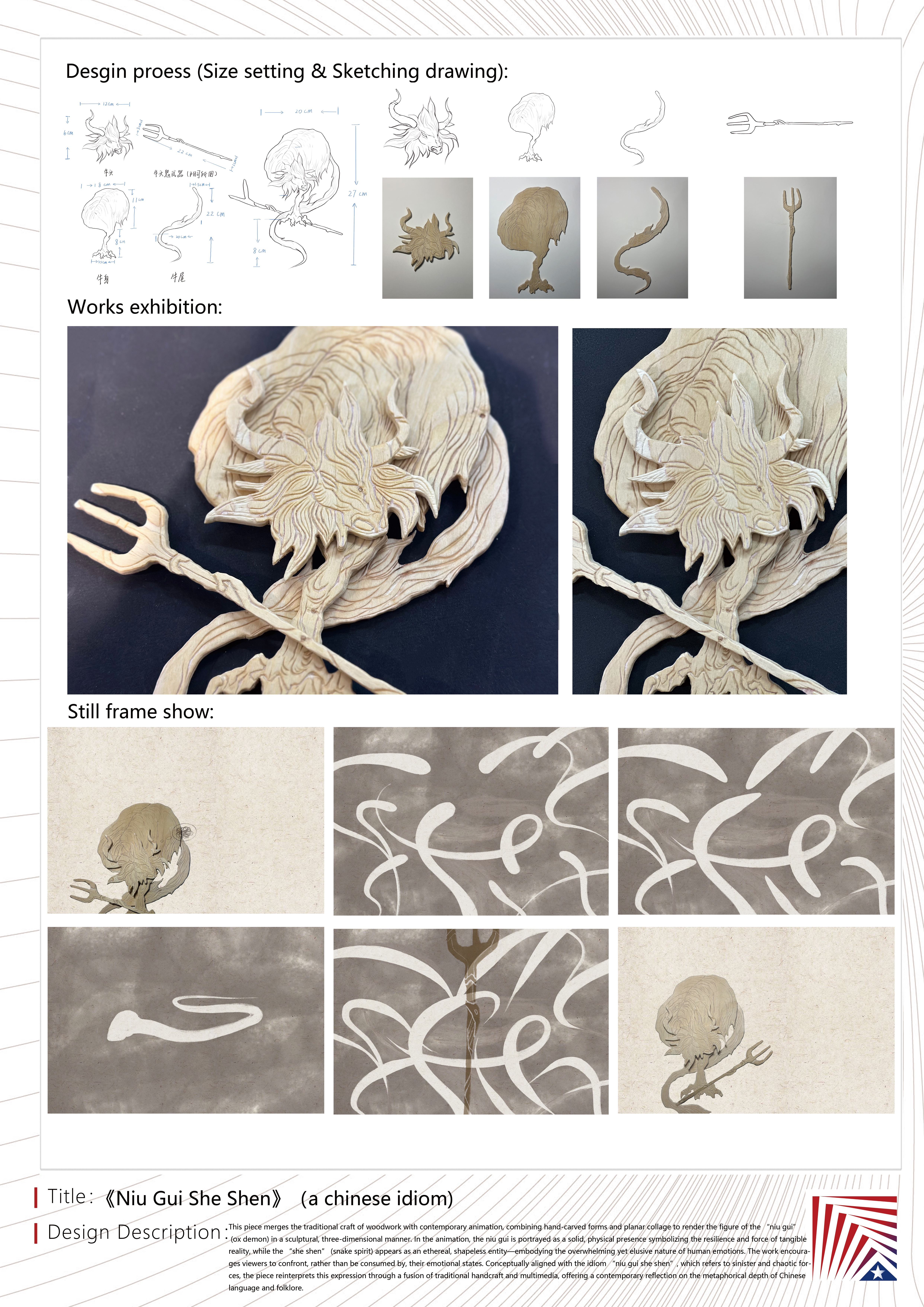 作品说明:作品将木艺与动画两种表现形式相结合,利用手工雕刻与平面拼接的方式,将“牛鬼”通过立体的方式呈现。在动画中“牛鬼”作为实体,表现现实力量的坚强。“蛇神”作为虚体,表达了情绪是一种庞大却又虚无的力量,人们需要积极地面对各种情绪,不要被情绪所压倒,动画的表达也与该成语的意思相近。作品以“牛鬼蛇神”为主题,通过传统手作与多媒体相融合的创新形式,进行了对中国成语的诠释与再创。