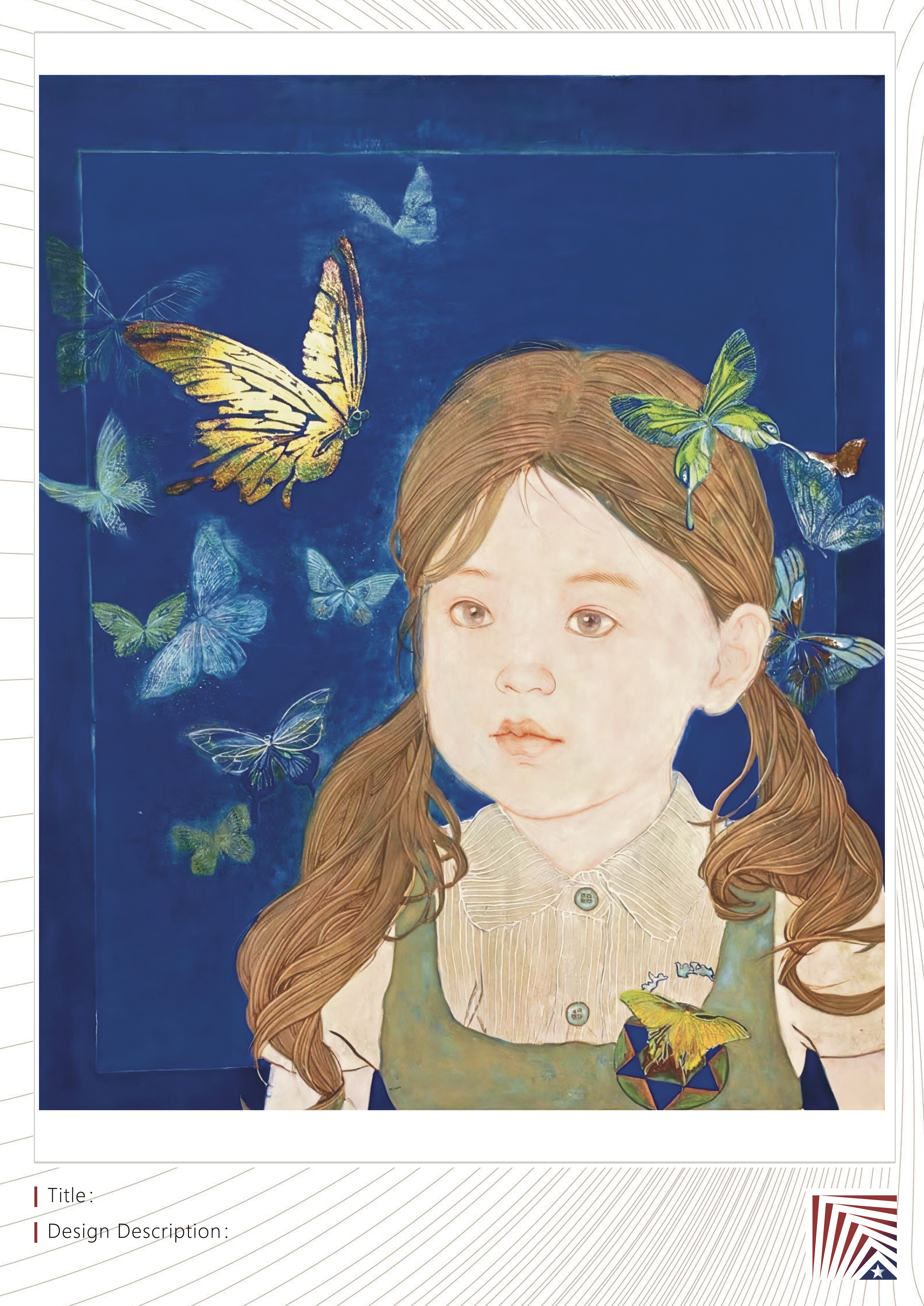 作品说明:画面右侧,一个眼眸清澈的小女孩静静伫立,仿佛从梦境中走出。她稚嫩的脸庞沐浴在柔和的光晕里,周身笼罩着一片宁静的蓝——那是纯粹幻想凝结的底色。在这片深邃而梦幻的蓝色帷幕下,许多蝴蝶翩然起舞,薄如轻纱的翅膀闪烁着星屑般的微光。两只蝴蝶悄然停驻:一只轻点在她发间;另一只安静地伏在她绿色的衣裙上。小女孩连呼吸都放得极轻,仿佛生怕惊扰了这场无声的交谈。她的眼神纯净而好奇,仿佛整片静谧的蓝色和蝴蝶零星的低语,都落入了她澄澈的童梦之中,凝固成那个无声却喧腾的蝶语世界。