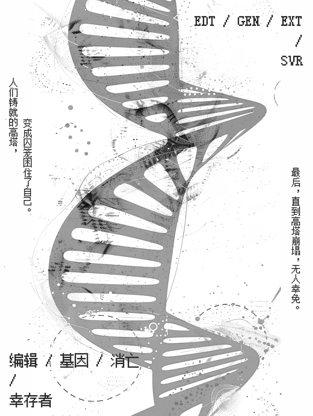 作品说明:生成式 AIGC 短片《EDT / GEN / EXT / SVR》,虚构了一个遥远未来的场景:自然人类的后代,再次经历漫长的基因突变、适应性进化,重新演化出智慧文明,从而回看之前的人类历史,吸取祖先的惨痛教训。此视频以纪录片形式回望那段因肆意使用基因编辑技术而走向灭亡的人类历史。短片通过多模态人工智能技术生成影像,融合虚构档案与时空错位的叙事结构,以冷静而克制的语气,展开一段关于“自我设计”与“物种终结”的反思。