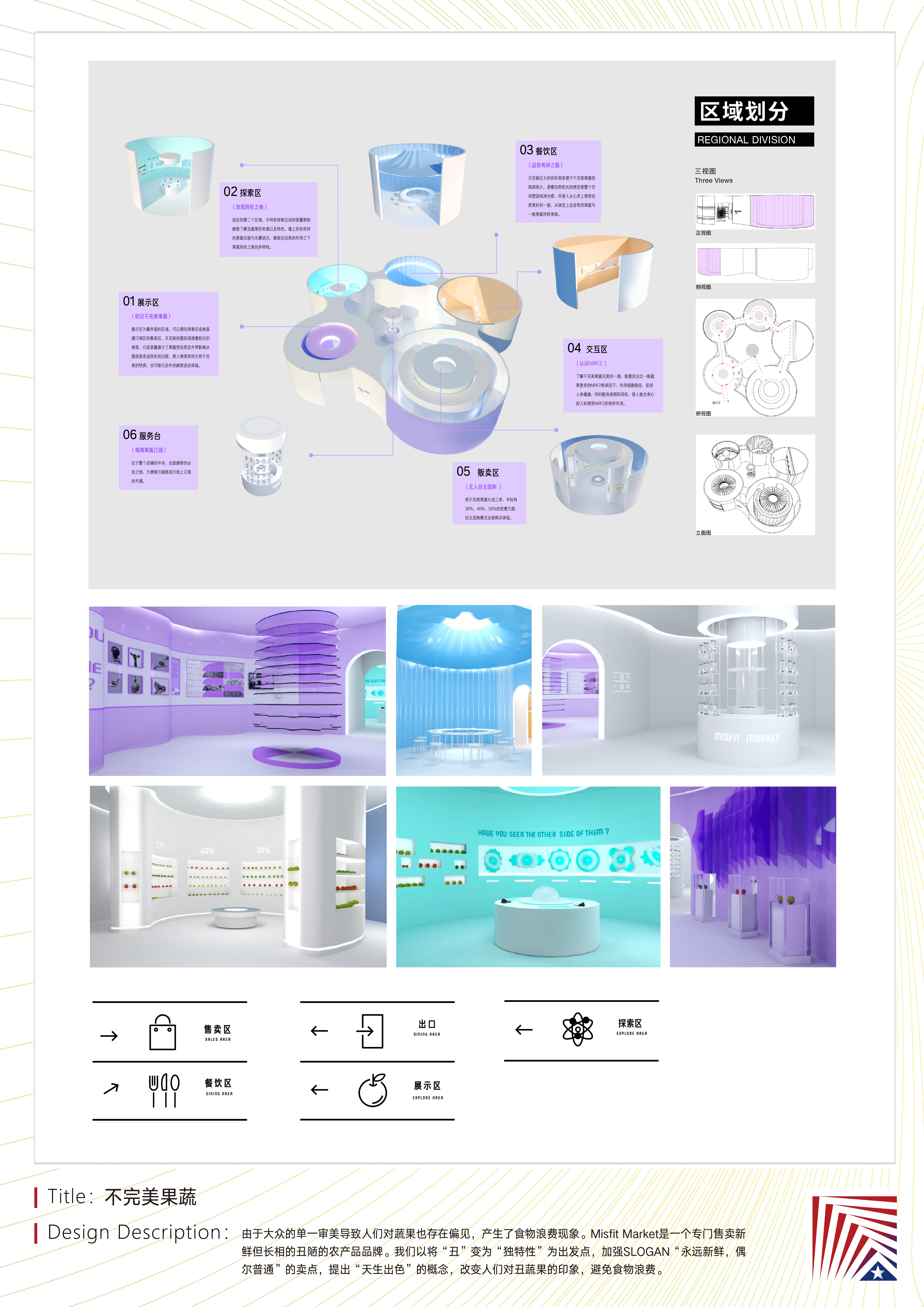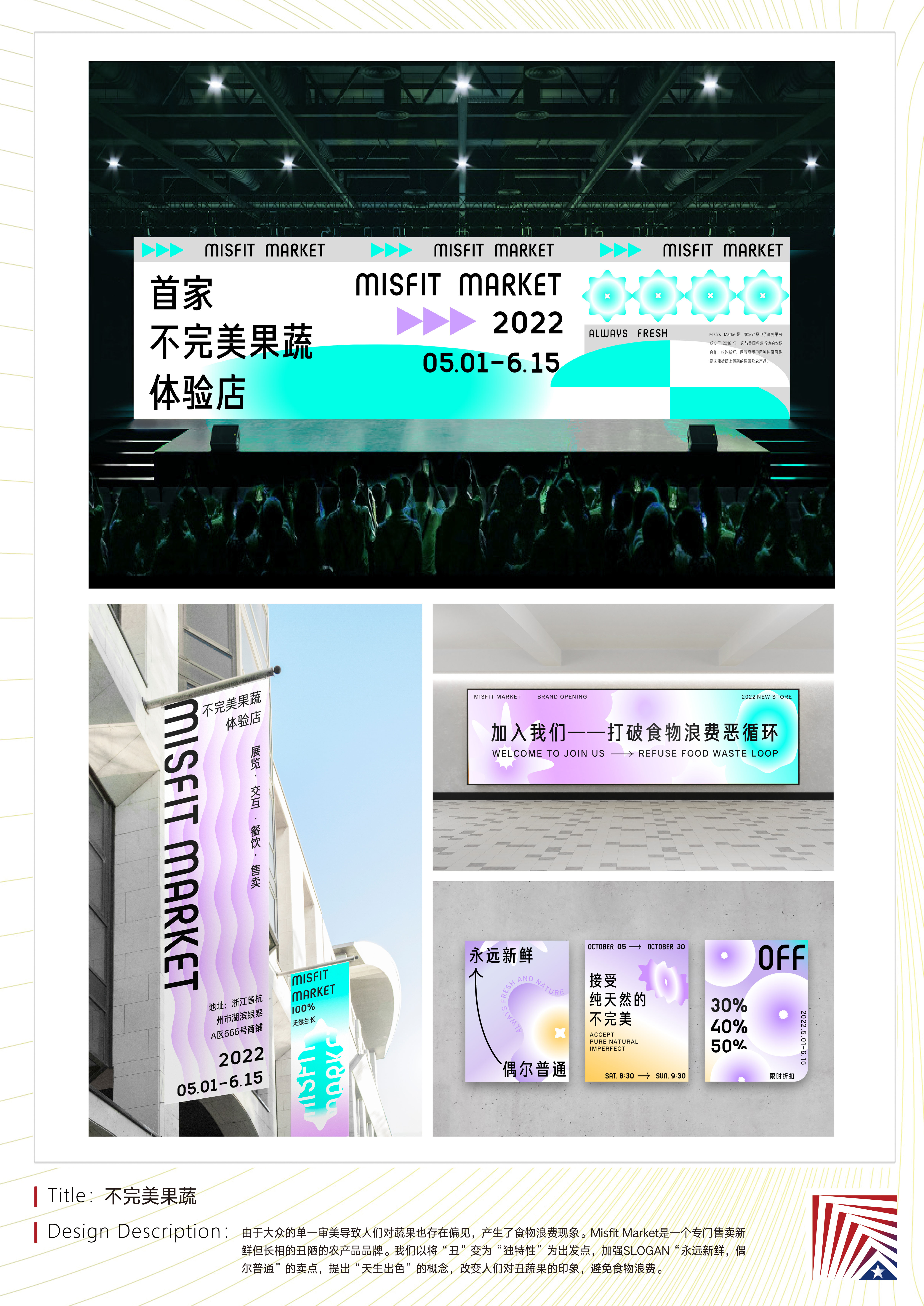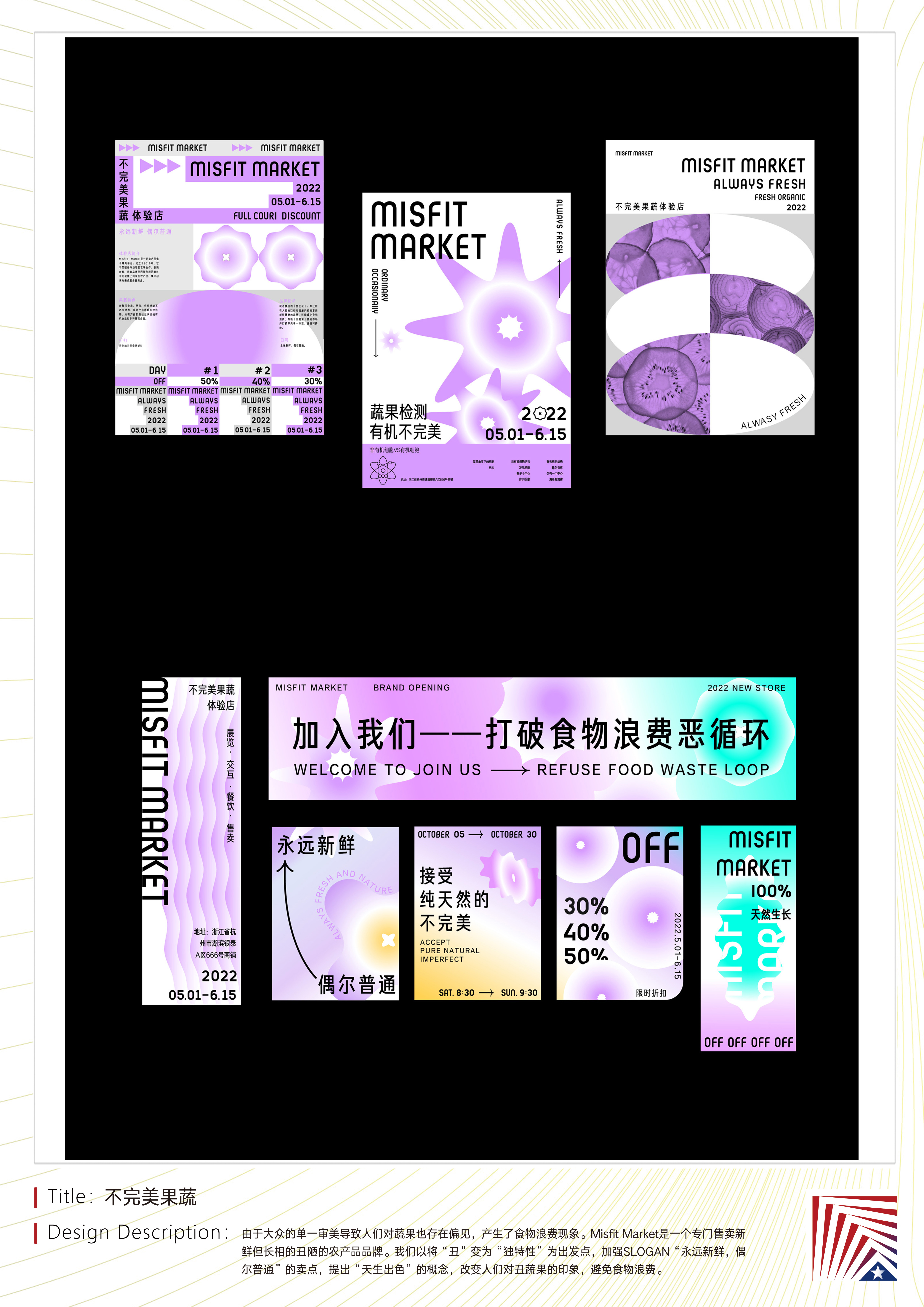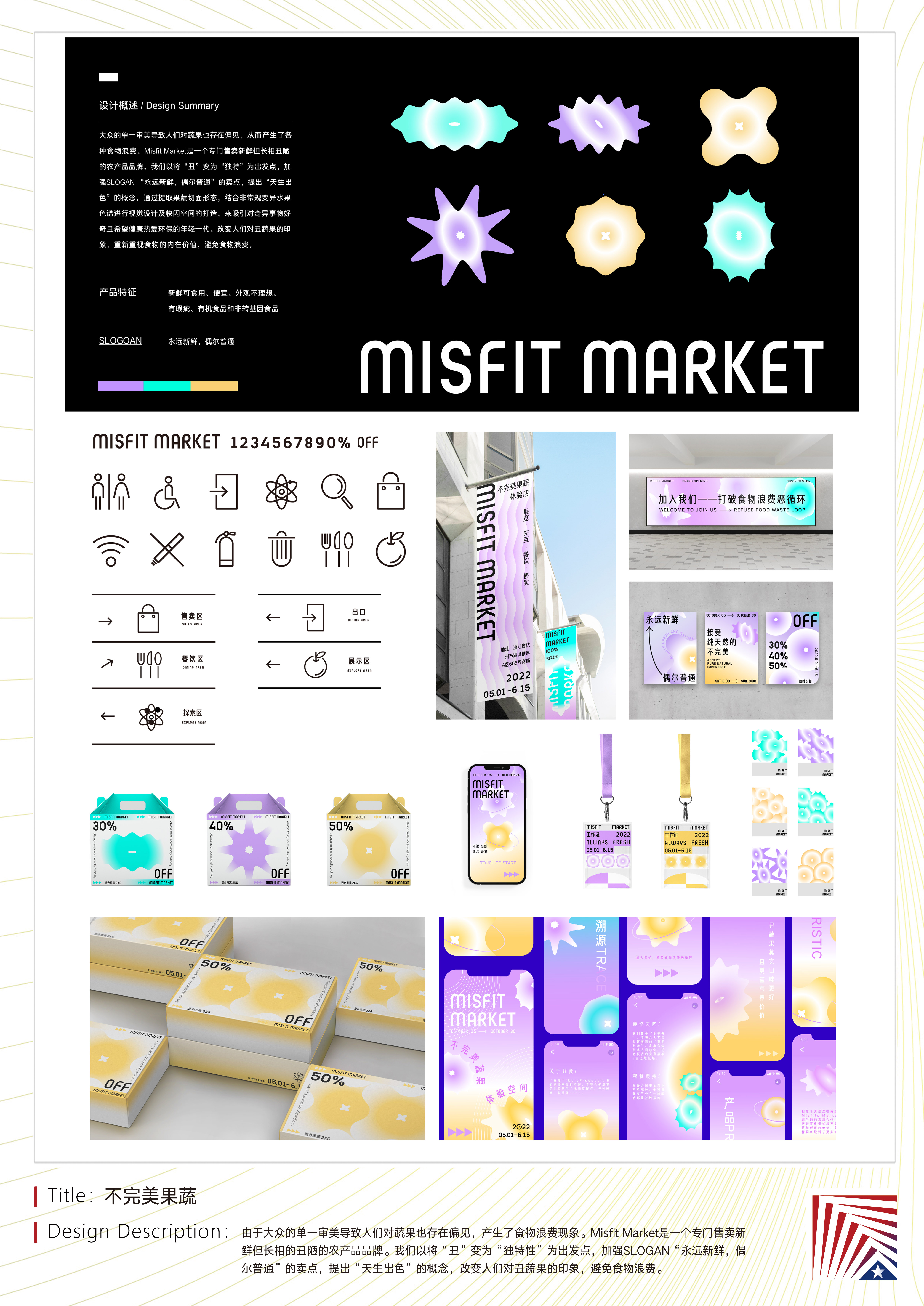 作品说明:由于大众的单一审美导致人们对蔬果也存在偏见,产生了食物浪费现象。Misfit Market是一个专门售卖新鲜但长相的丑陋的农产品品牌。我们以将“丑”变为“独特性”为出发点,加强SLOGAN“永远新鲜,偶尔普通”的卖点,提出“天生出色”的概念,改变人们对丑蔬果的印象,避免食物浪费。