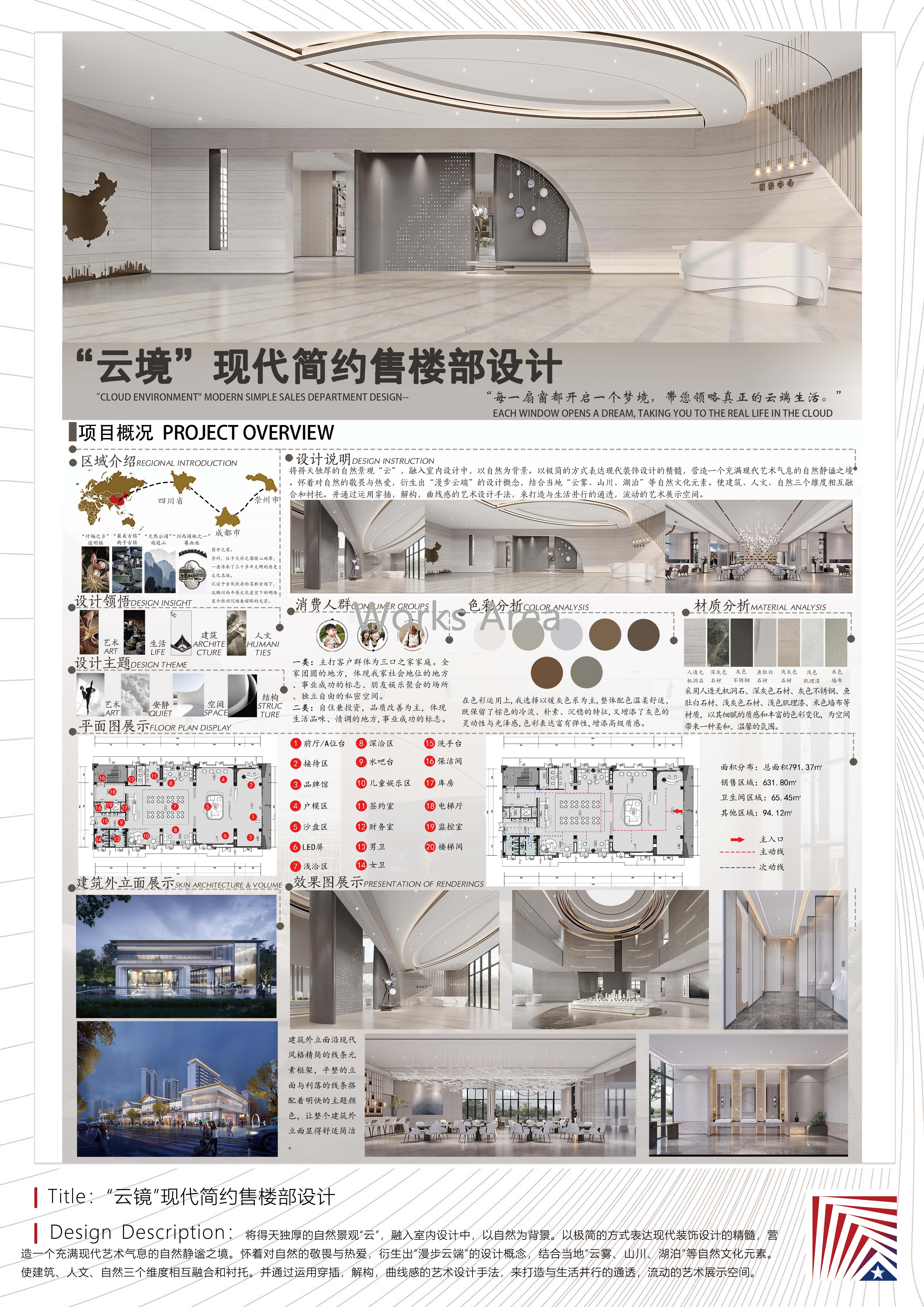 作品说明:将得天独厚的自然景观“云”,融入室内设计中,以自然为背景。以极简的方式表达现代装饰设计的精髓,营造一个充满现代艺术气息的自然静谧之境。怀着对自然的敬畏与热爱,衍生出“漫步云端”的设计概念,结合当地“云雾、山川、湖泊”等自然文化元素。使建筑、人文、自然三个维度相互融合和衬托。并通过运用穿插,解构,曲线感的艺术设计手法,来打造与生活并行的通透,流动的艺术展示空间。