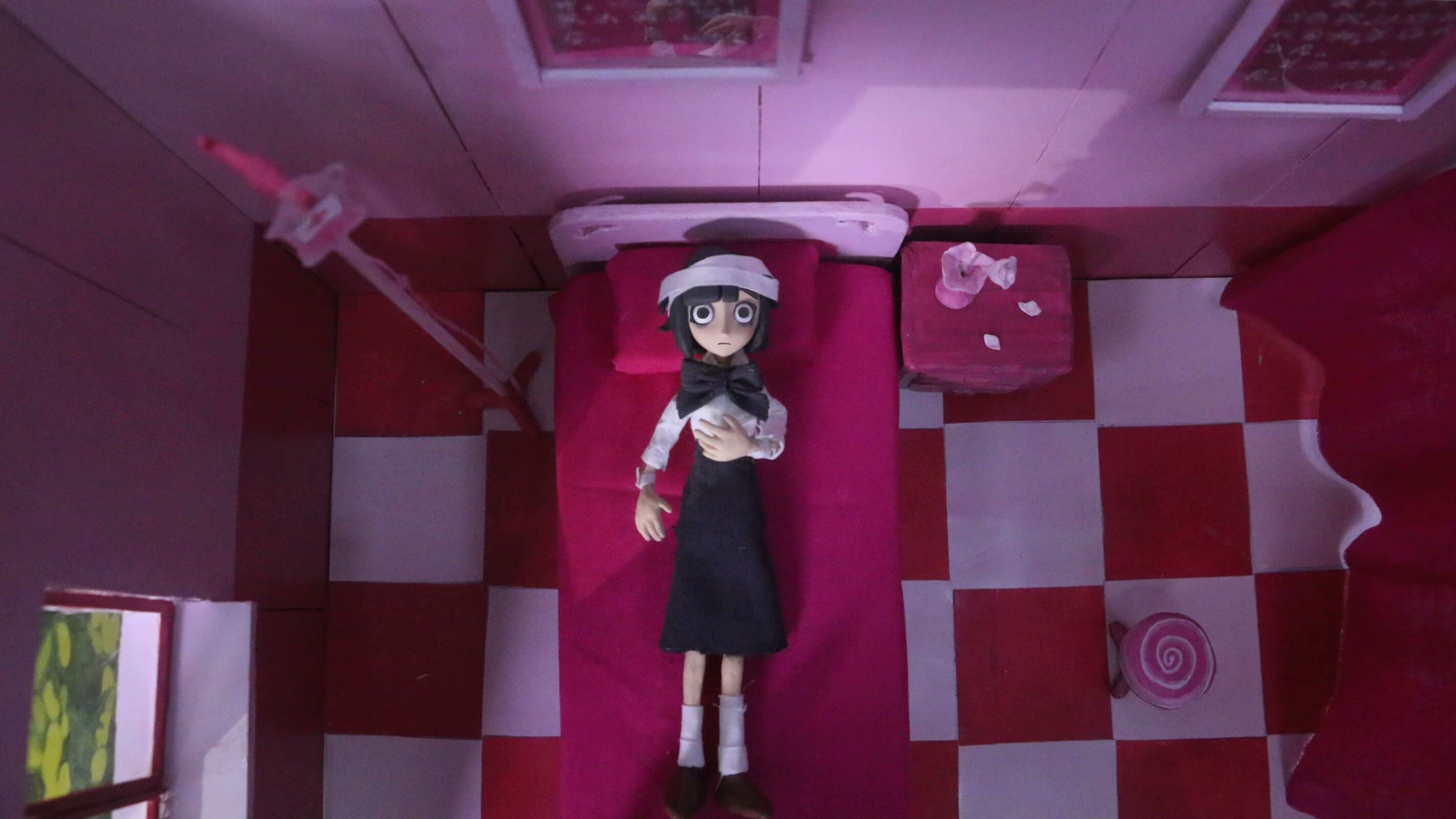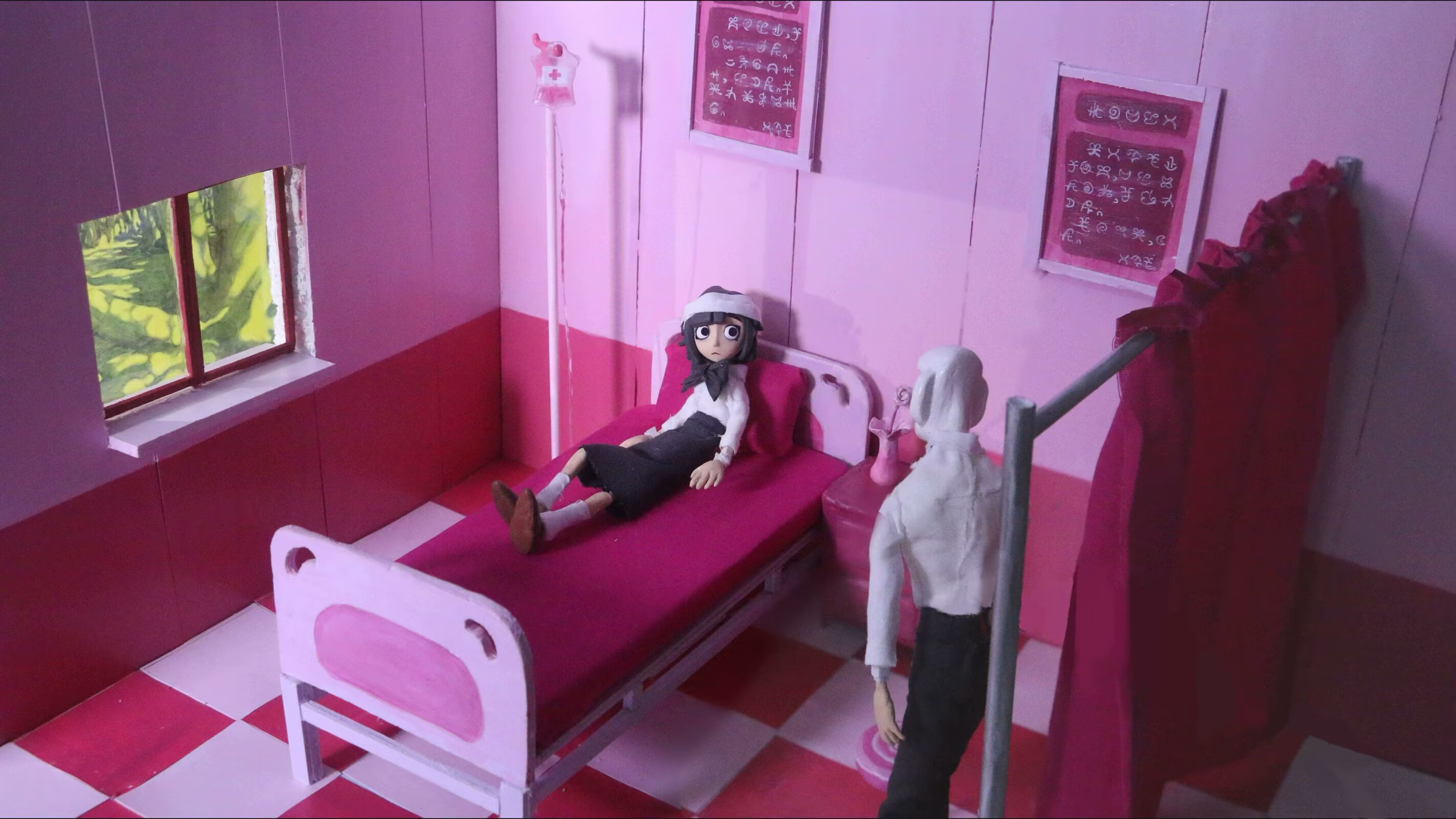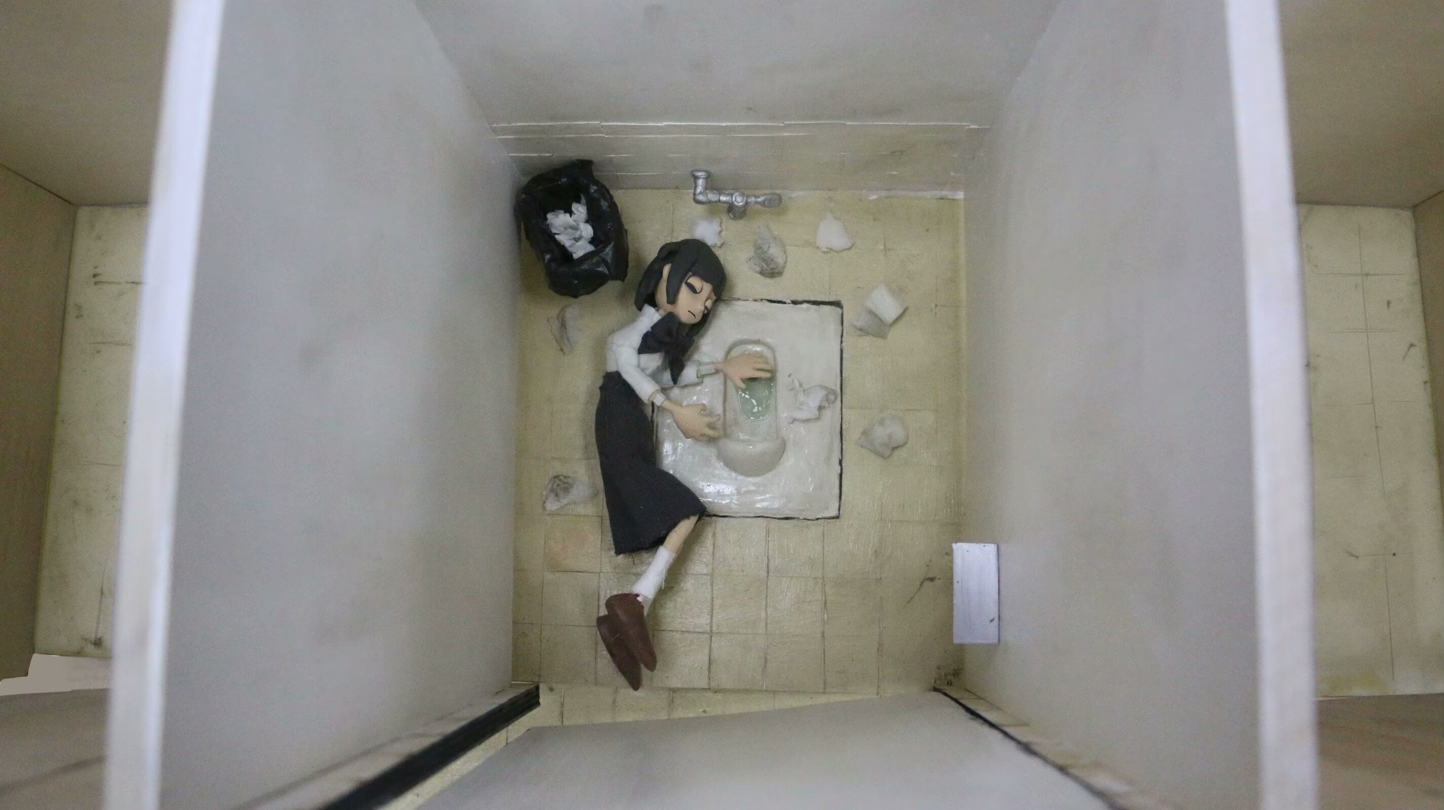 All scenes and puppets were handmade and painted by me. Puppets used aluminum wire for skeletons, Ladoll clay for skin, and stop-motion-specific clay for hair. Scenes were built with materials like foam boards, PVC sheets, and transparent plastic. To evoke a bizarre, dreamlike atmosphere, the first half uses bright pink and rose red as main tones, while the second half adopts low-saturation yellow-gray and white to reflect the protagonist’s resistance to reality. The design of the male lead with a toilet head stems from the fact that bullied students are often cornered in bathrooms—I hope to use dark humor to let audiences feel the cruelty of bullying.