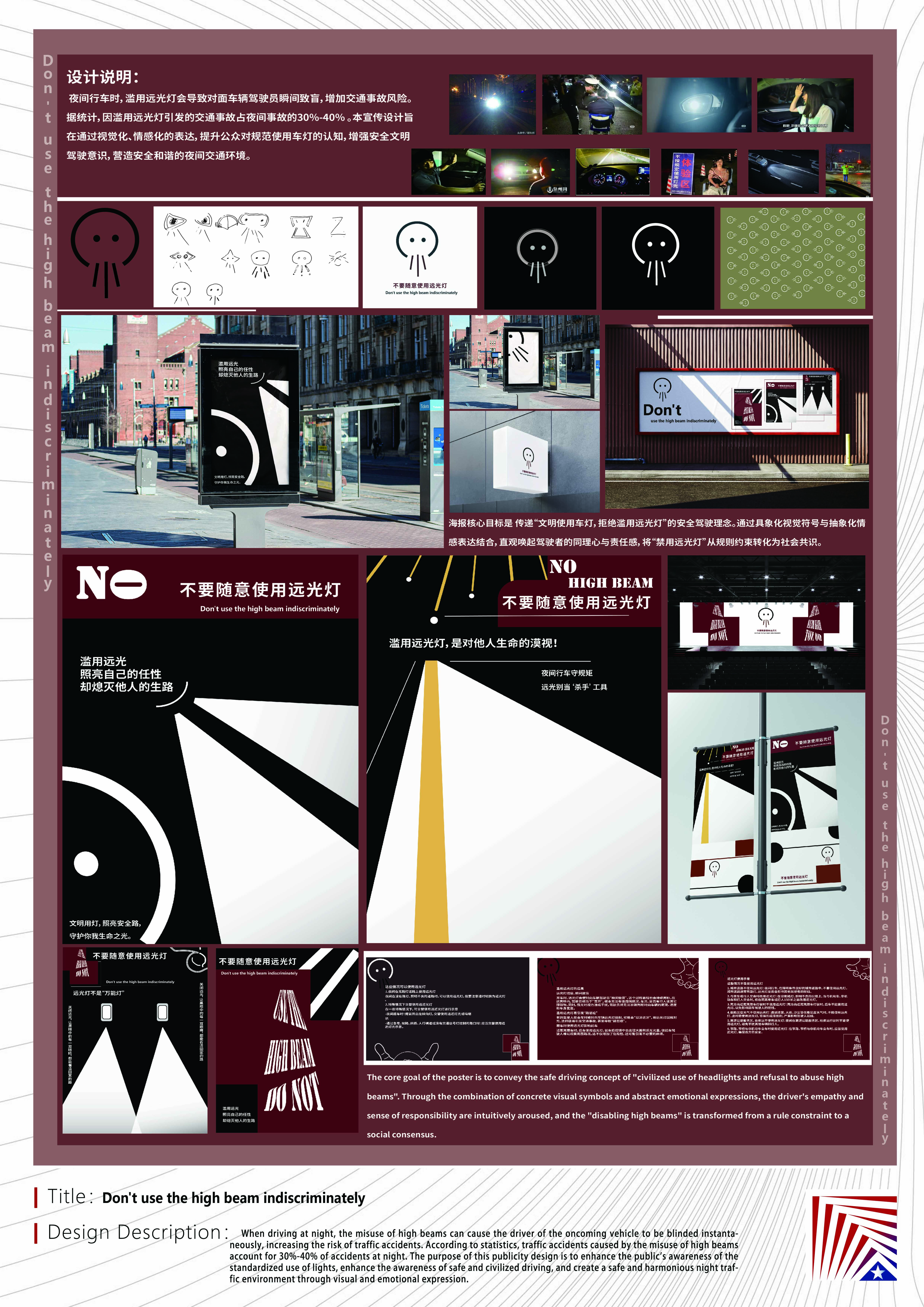 作品说明:夜间行车时,滥用远光灯会导致对面车辆驾驶员瞬间致盲,增加交通事故风险。本宣传设计旨在通过视觉化、情感化的表达,提升公众对规范使用车灯的认知,增强安全文明驾驶意识,营造安全和谐的夜间交通环境。