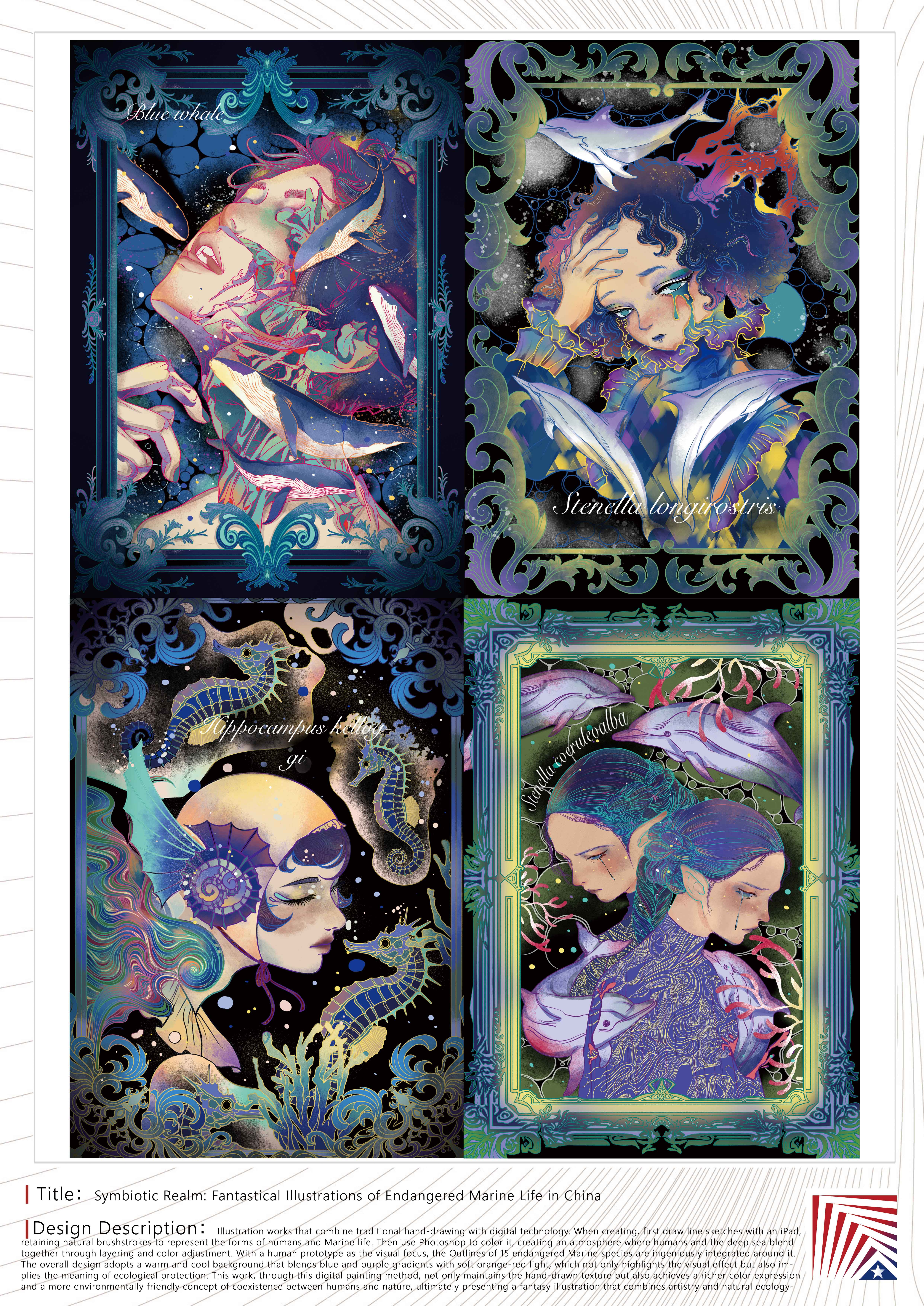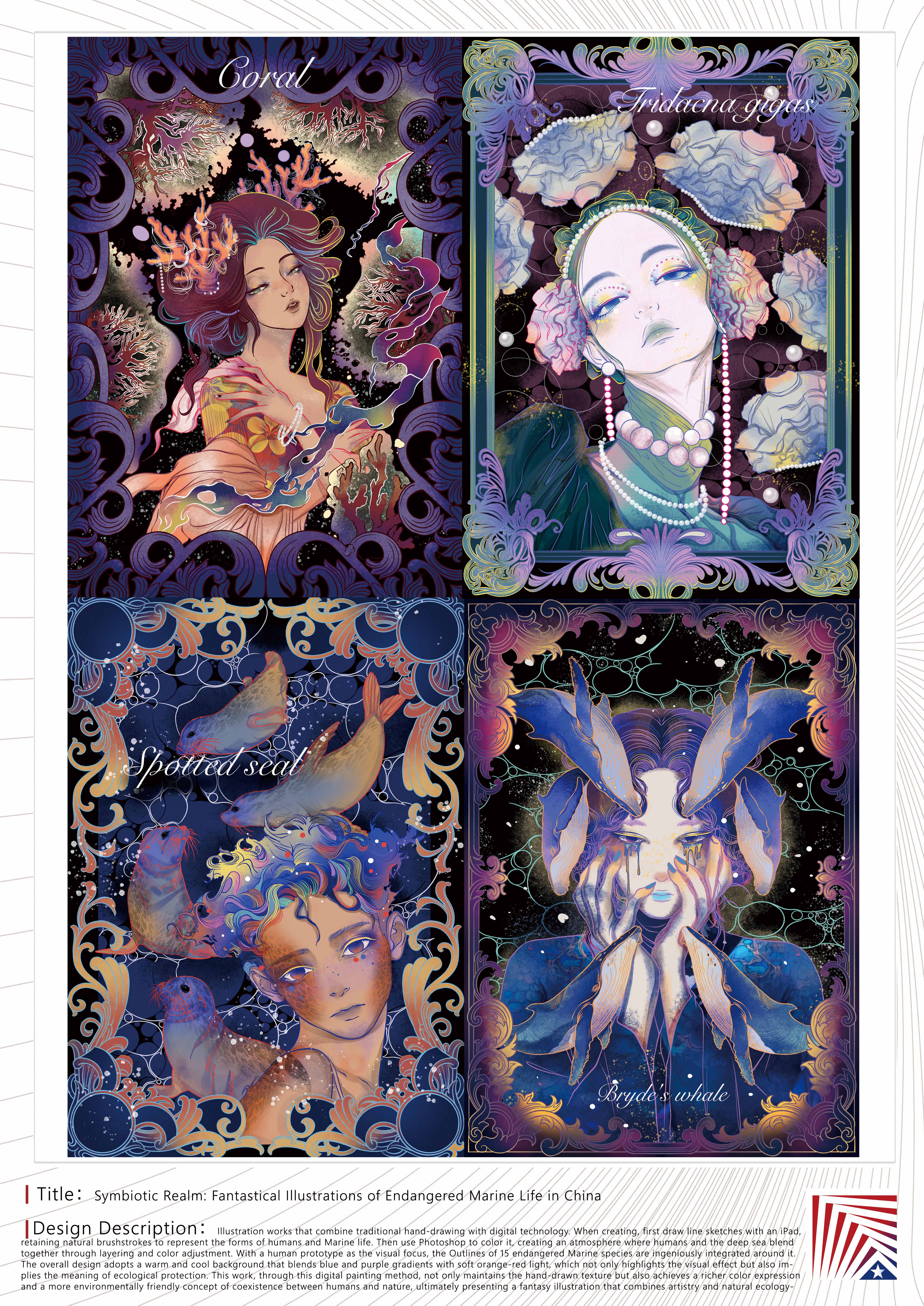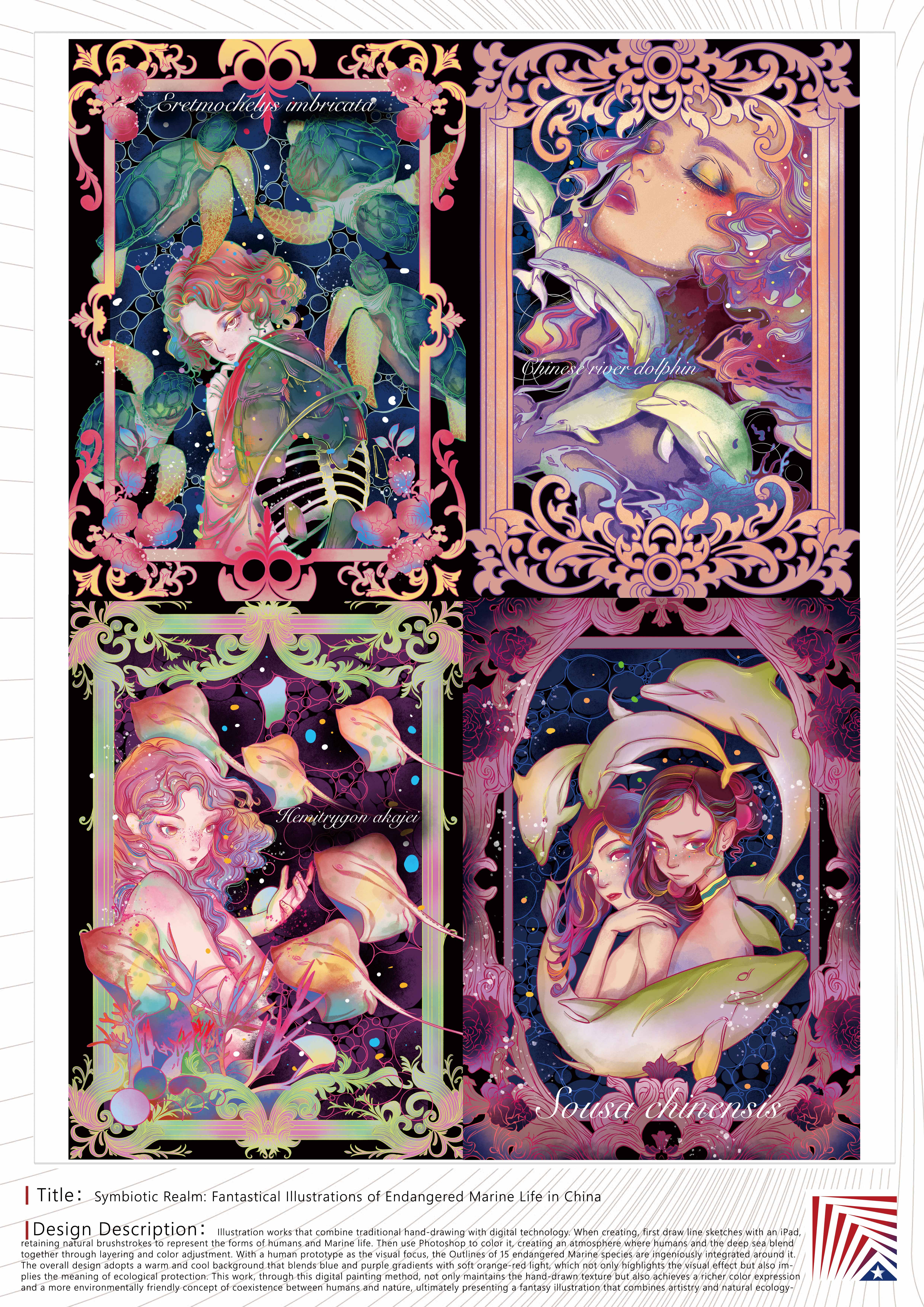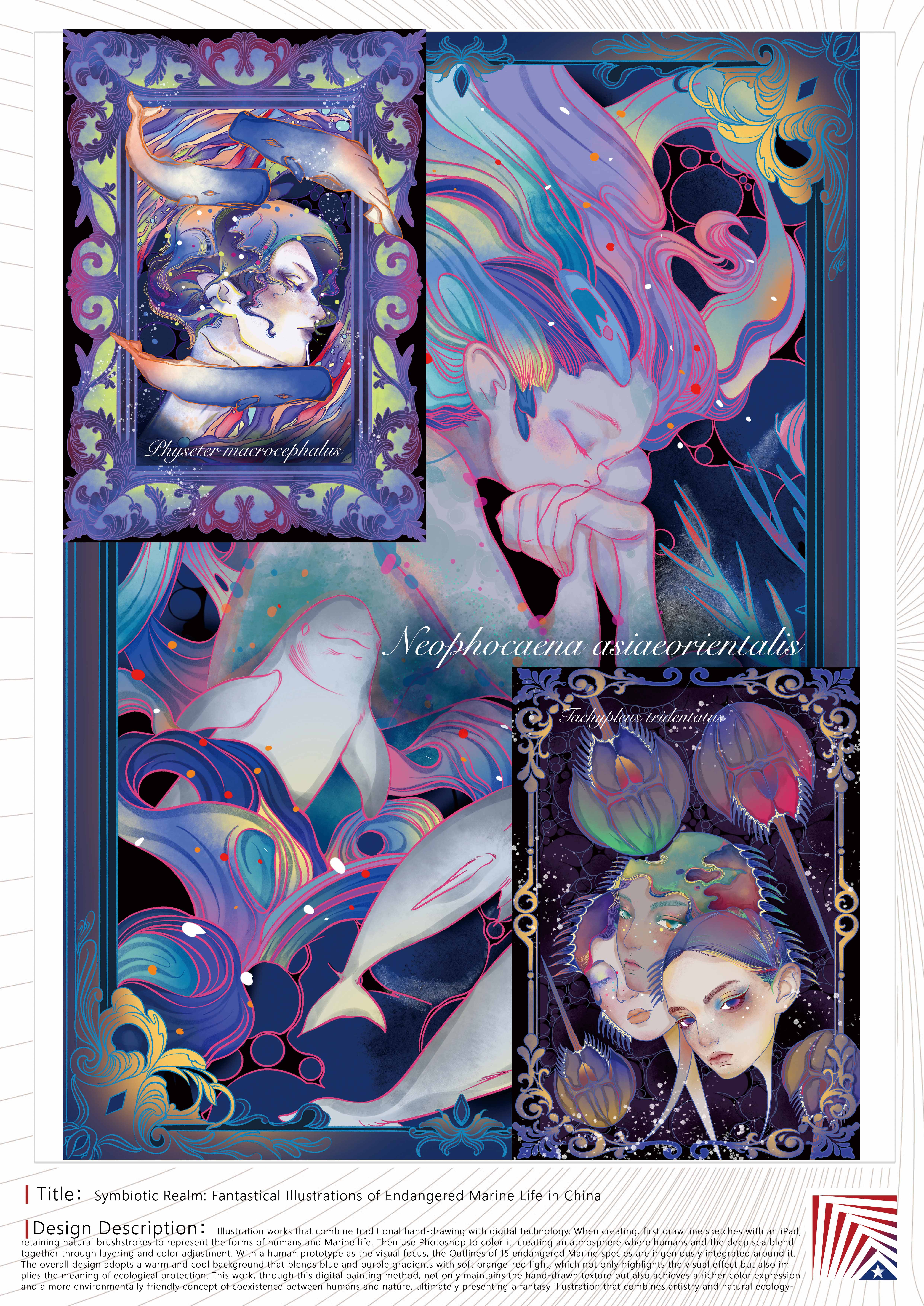 作品说明:《共生之境:中国濒危海洋生物奇幻插画》是一幅结合传统手绘与数字技术的插画作品。创作时先用iPad绘制线稿,保留自然笔触来表现人类和海洋生物的形态;再用Photoshop上色,通过分层和调色营造人类与深海相融的氛围。以人类原型为视觉焦点,其周围分别巧妙地融入了15种濒危海洋生物的轮廓。整体采用蓝紫渐变与橙红柔光融合的冷暖背景,既突出视觉效果,又暗示生态保护的寓意。本作品通过这种数字绘画方式,在保持手绘质感的同时,实现了更丰富的色彩表现和更具人与自然共生的环保理念,最终呈现出一幅兼具艺术性和自然生态的奇幻插画。