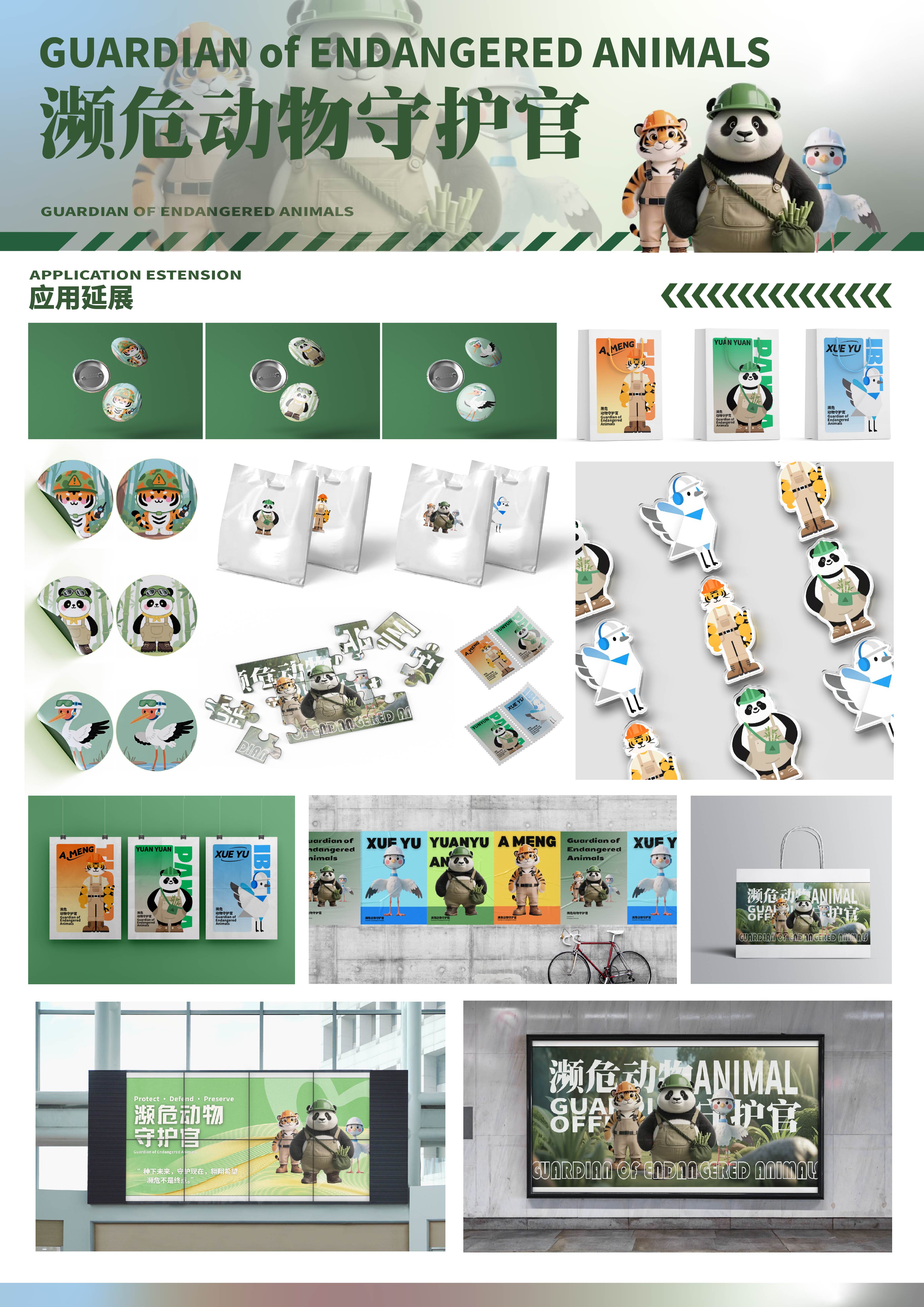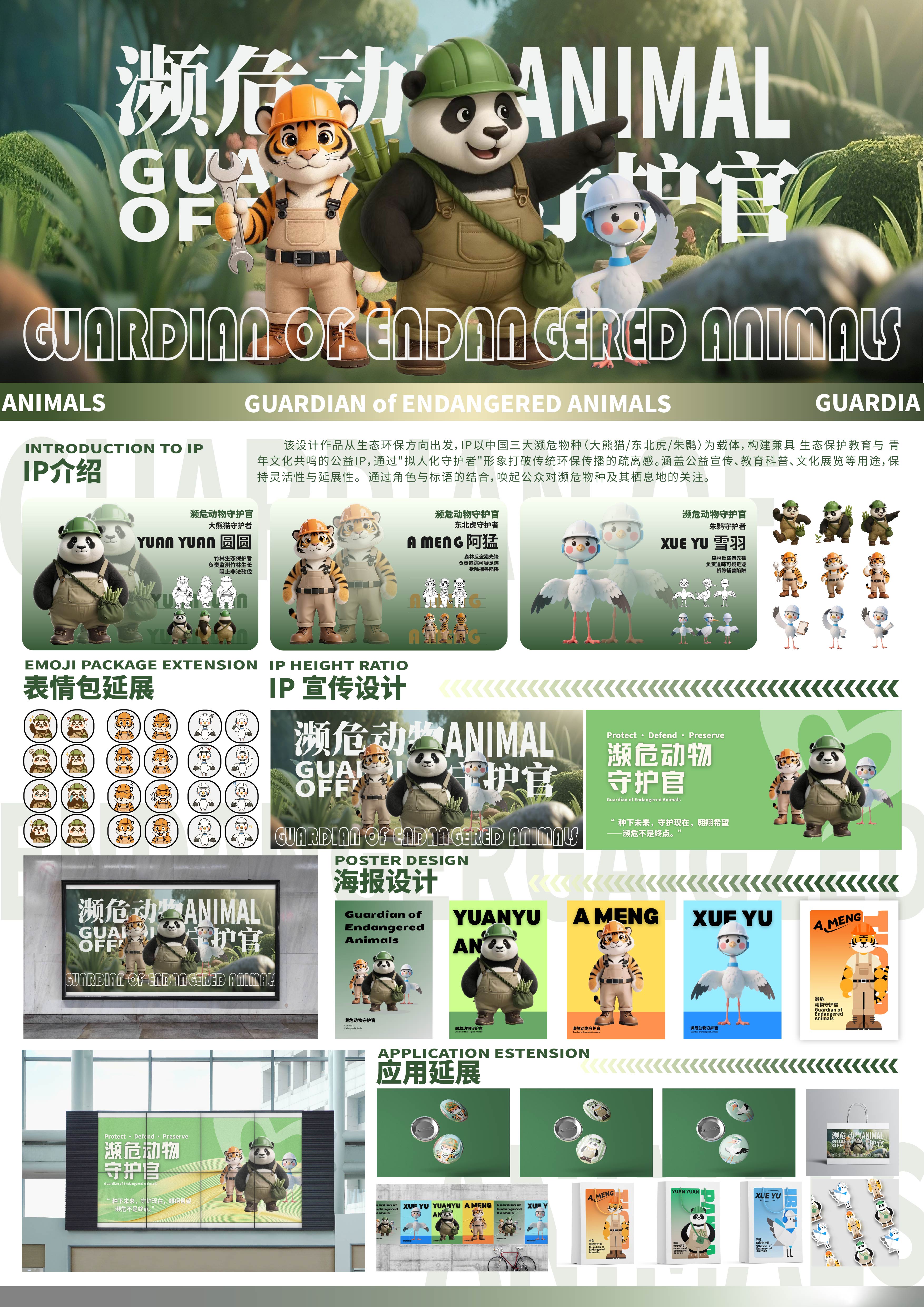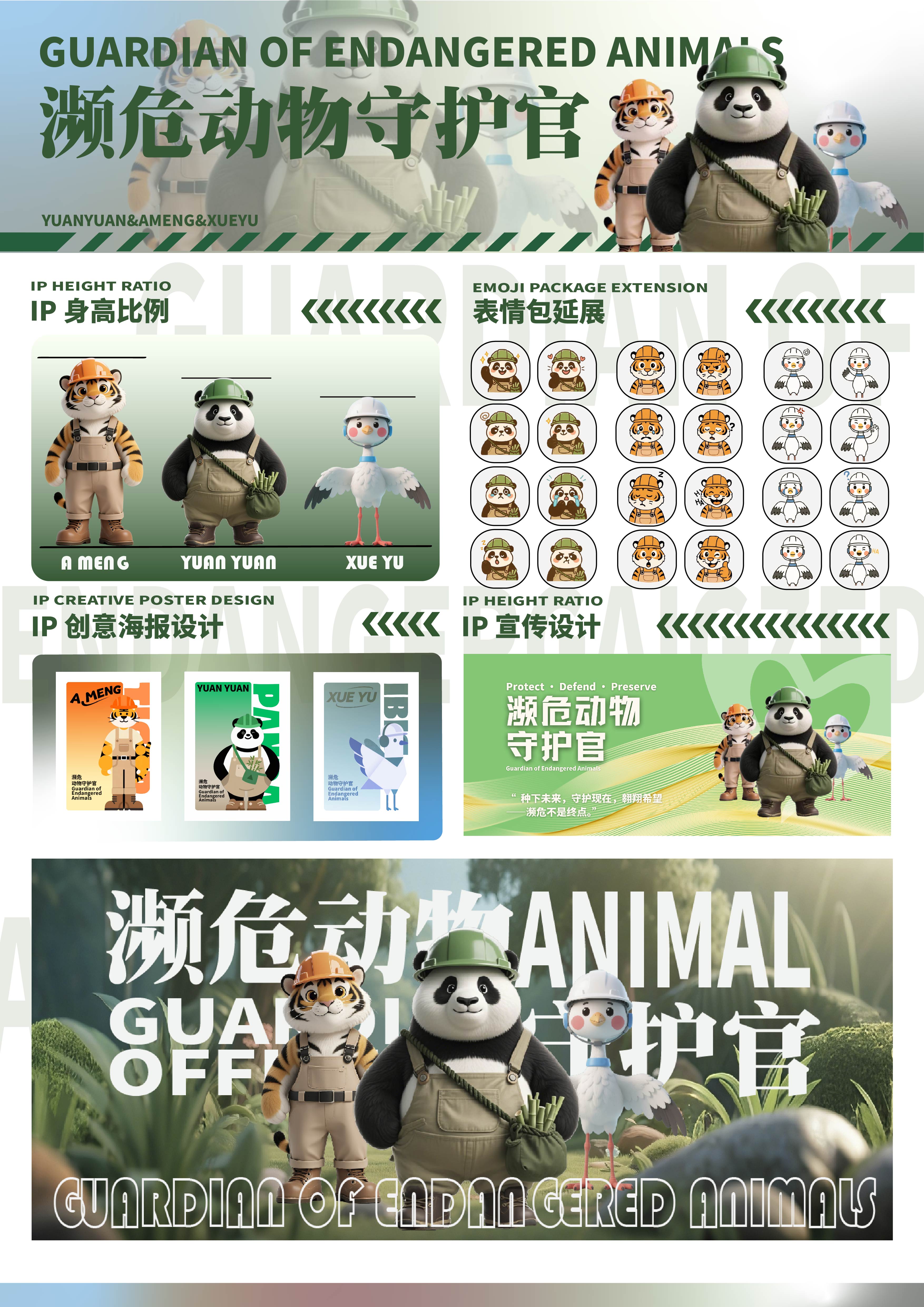 作品说明:该设计作品从生态环保方向出发,IP以中国三大濒危物种(大熊猫/东北虎/朱鹮)为载体,构建兼具 生态保护教育与 青年文化共鸣的公益IP,通过”拟人化守护者”形象打破传统环保传播的疏离感。涵盖公益宣传、教育科普、文化展览等用途,保持灵活性与延展性。 通过角色与标语的结合,唤起公众对濒危物种及其栖息地的关注。