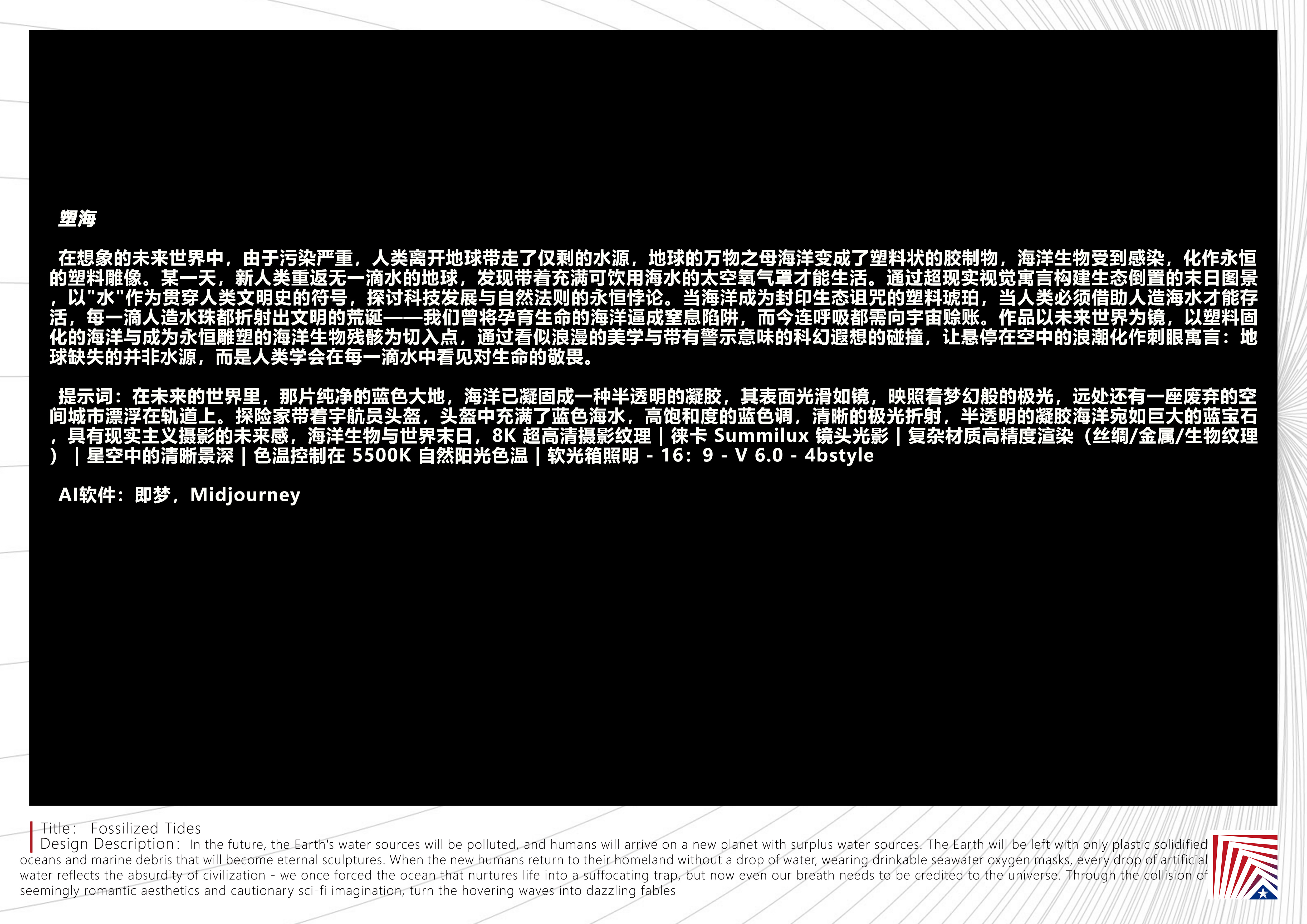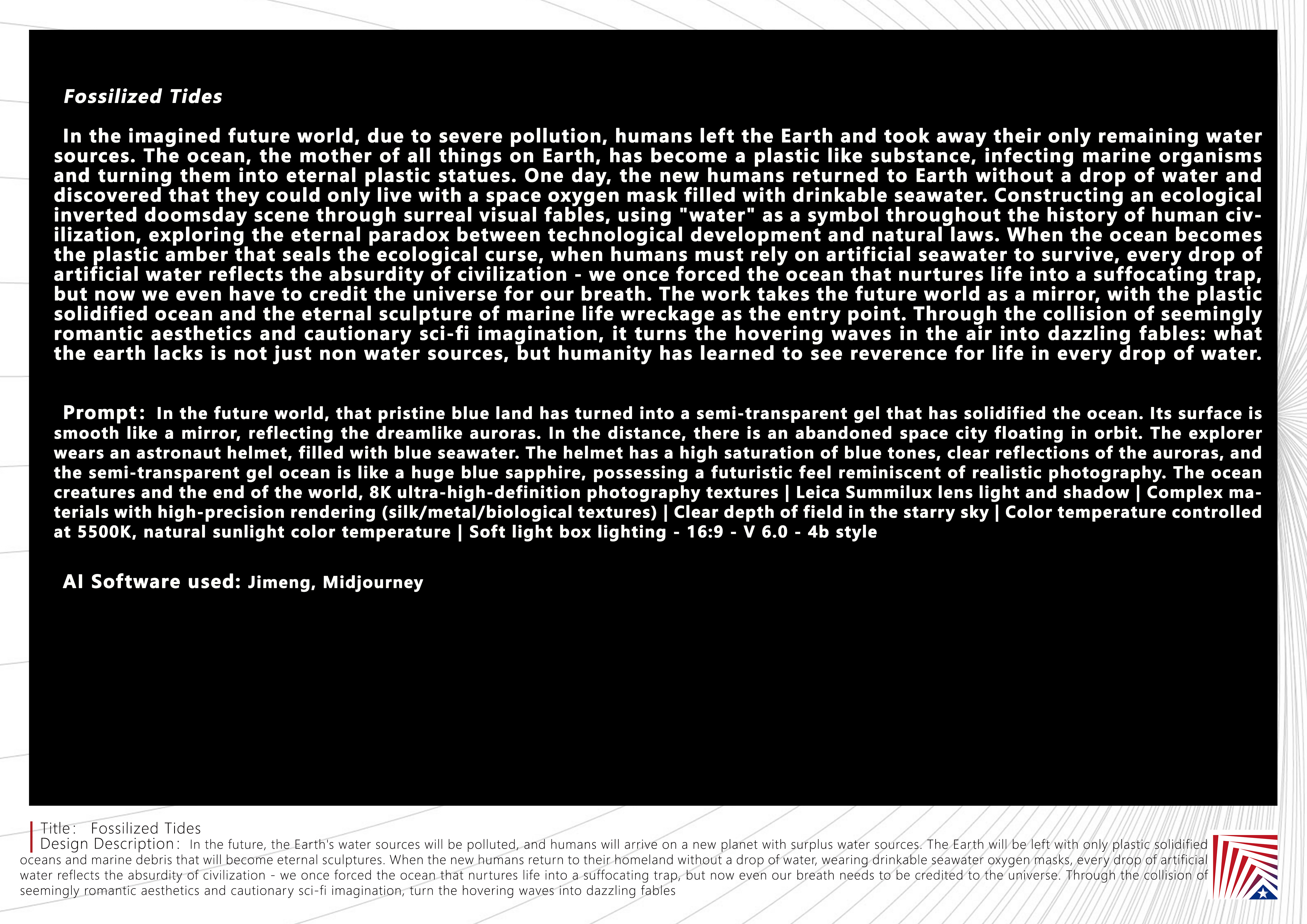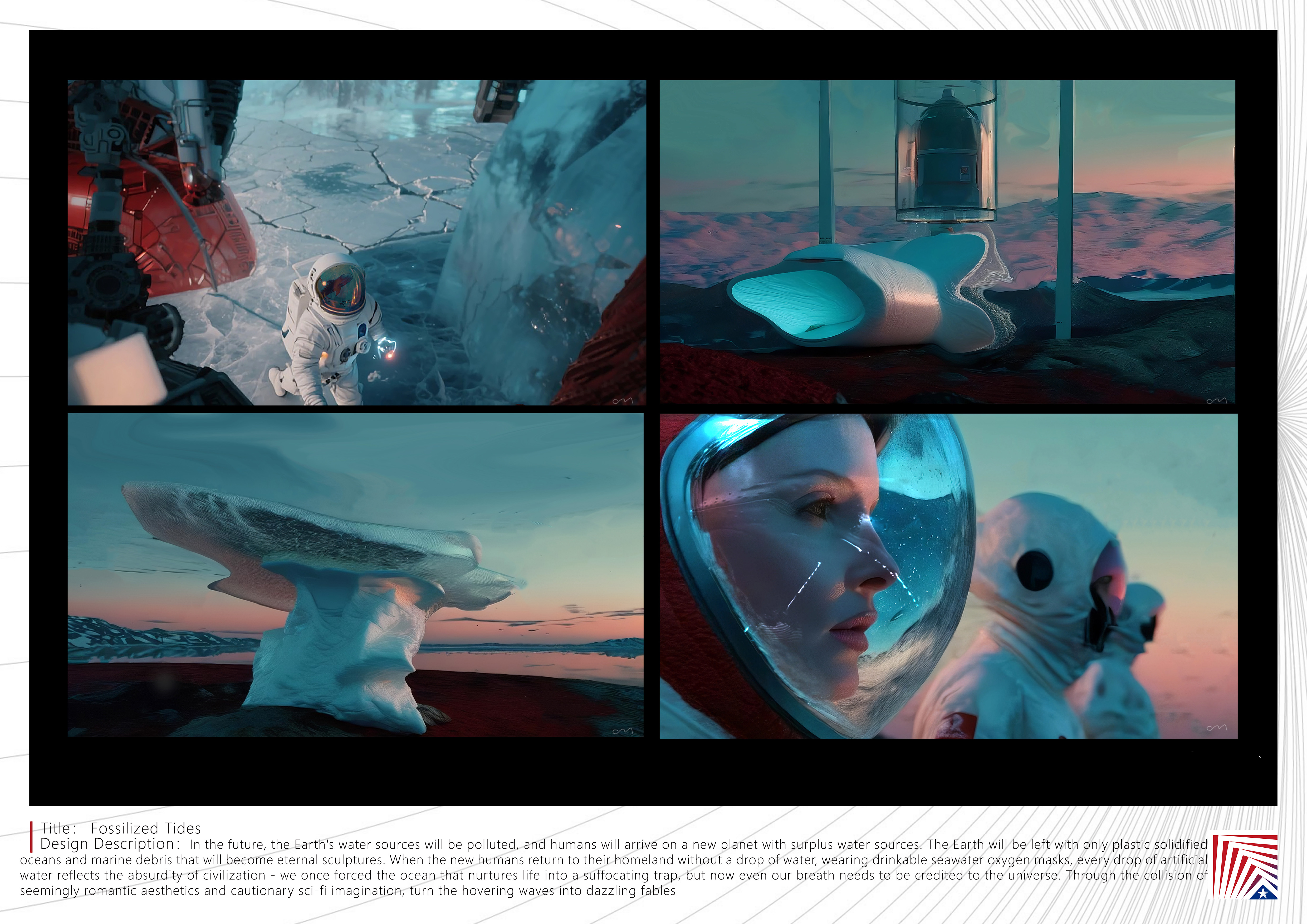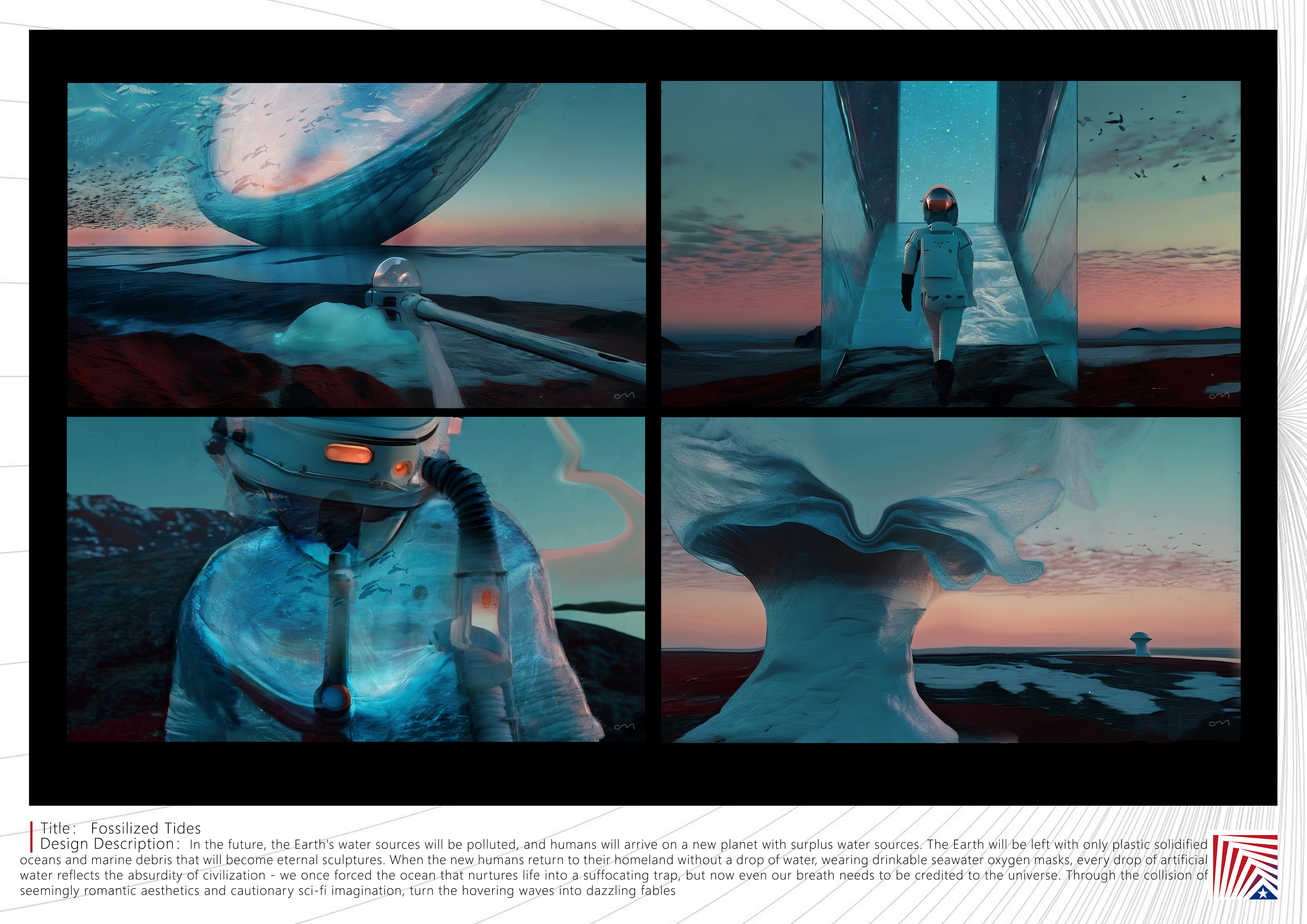 作品说明:在想象的未来世界中,由于污染严重,人类离开地球带走了仅剩的水源,地球的万物之母海洋变成了塑料状的胶制物,海洋生物受到感染,化作永恒的塑料雕像。某一天,新人类重返无一滴水的地球,发现带着充满可饮用海水的太空氧气罩才能生活。通过超现实视觉寓言构建生态倒置的末日图景,以”水”作为贯穿人类文明史的符号,探讨科技发展与自然法则的永恒悖论。当海洋成为封印生态诅咒的塑料琥珀,当人类必须借助人造海水才能存活,每一滴人造水珠都折射出文明的荒诞——我们曾将孕育生命的海洋逼成窒息陷阱,而今连呼吸都需向宇宙赊账。作品以未来世界为镜,以塑料固化的海洋与成为永恒雕塑的海洋生物残骸为切入点,通过看似浪漫的美学与带有警示意味的科幻遐想的碰撞,让悬停在空中的浪潮化作刺眼寓言:地球缺失的并非水源,而是人类学会在每一滴水中看见对生命的敬畏。