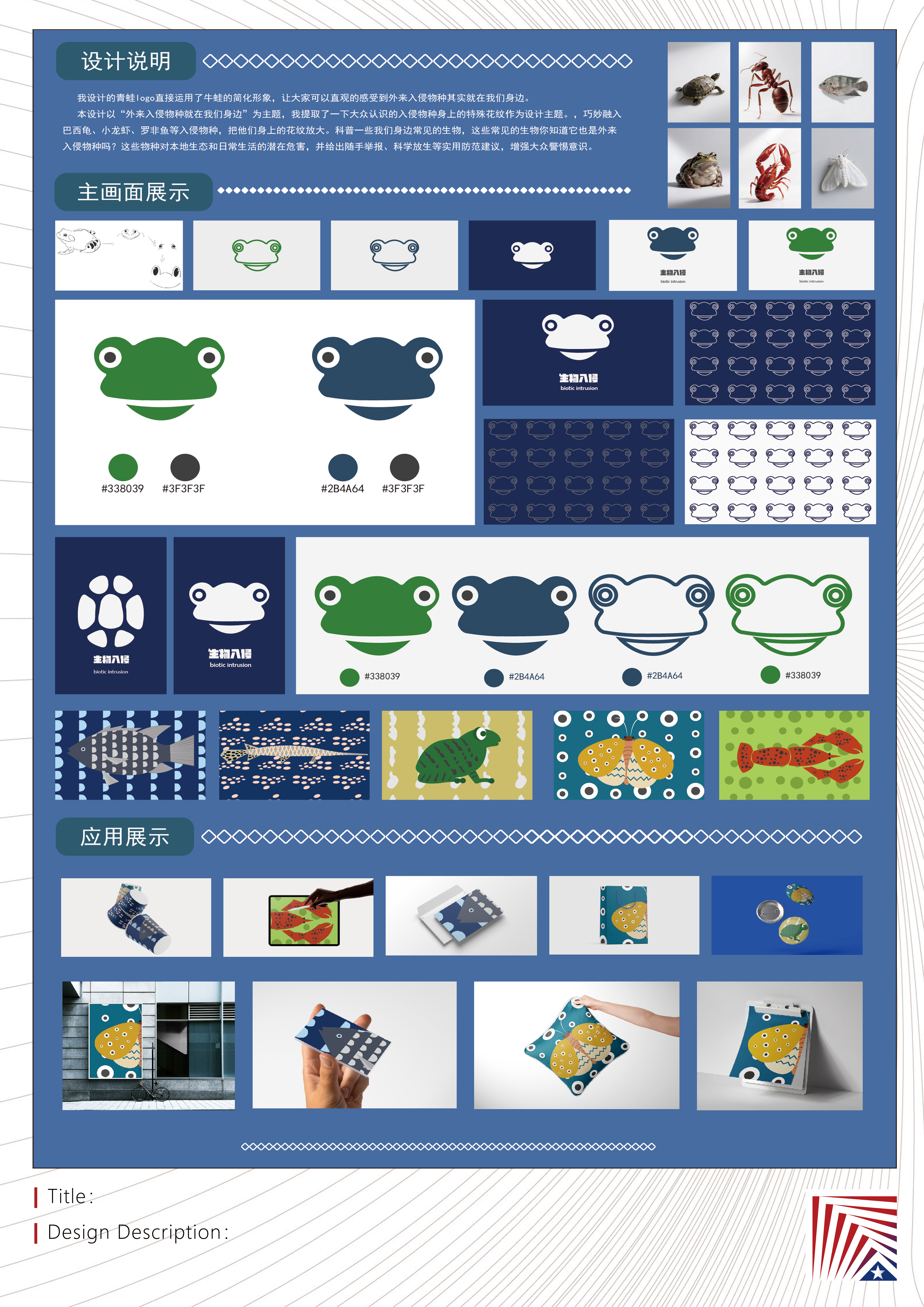 作品说明:我设计的青蛙logo直接运用了牛蛙的简化形象,让大家可以直观的感受到外来入侵物种其实就在我们身边。