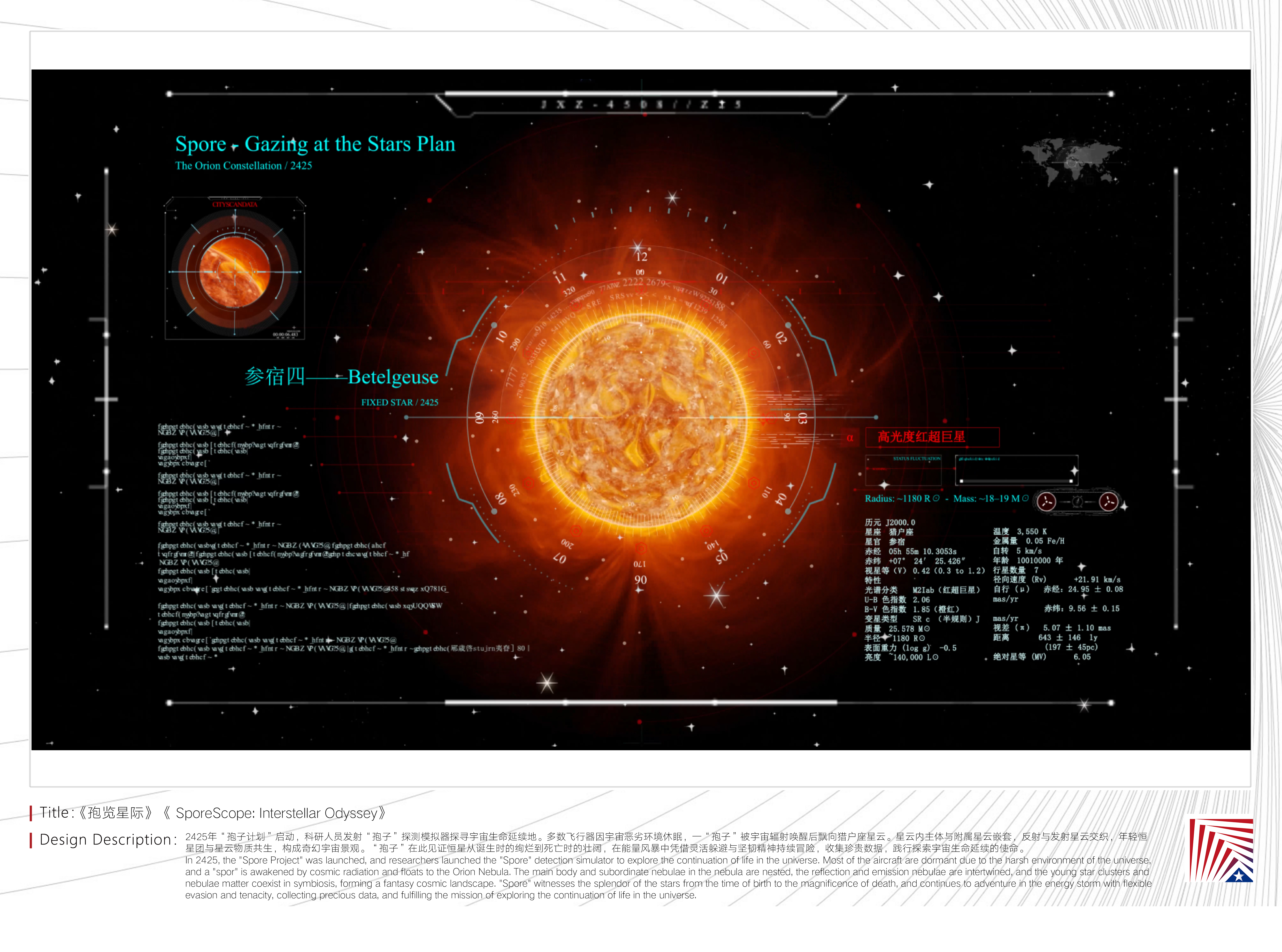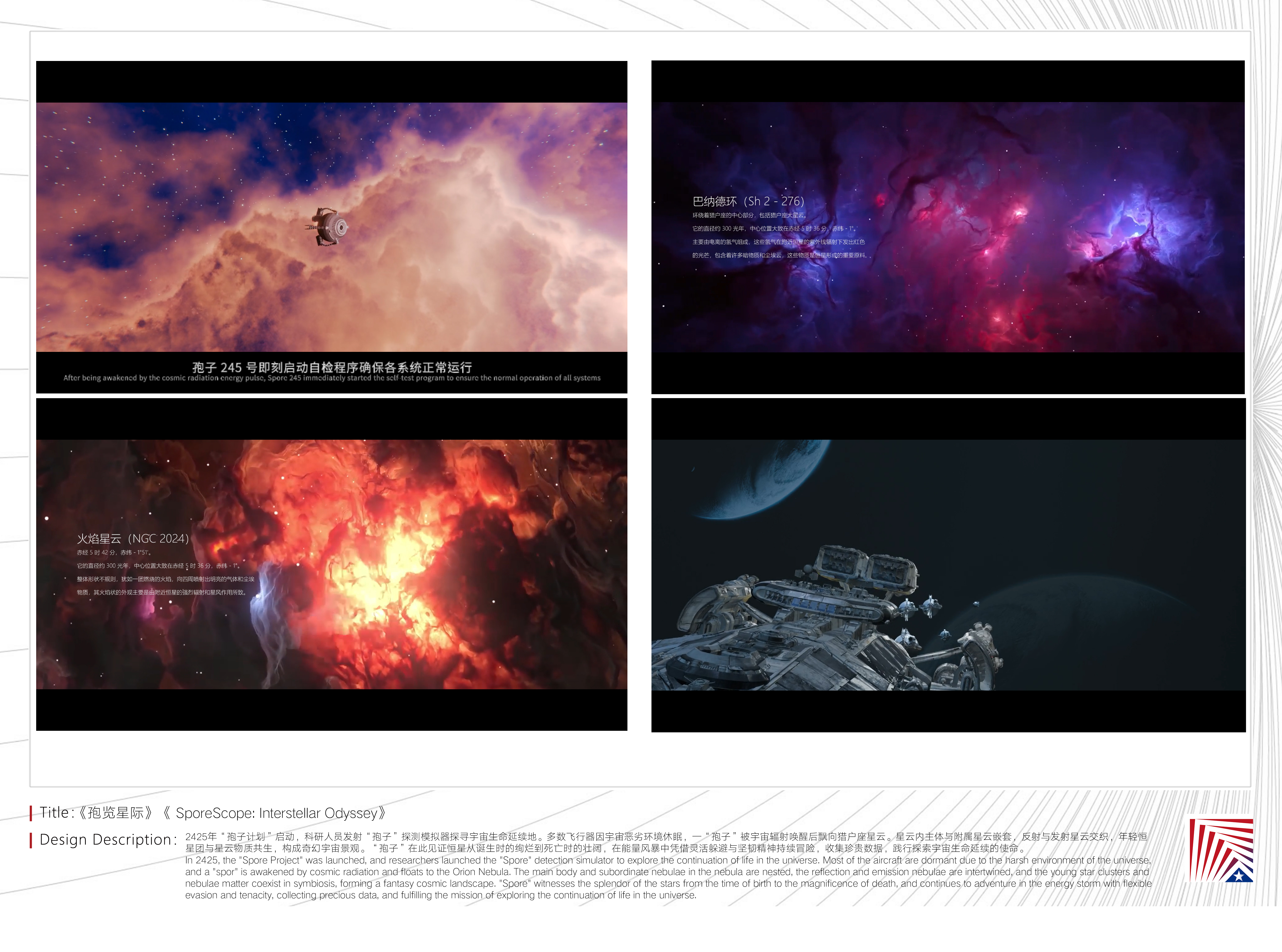 作品说明:2425年“孢子计划”启动,科研人员发射“孢子”探测模拟器探寻宇宙生命延续地。多数飞行器因宇宙恶劣环境休眠,一“孢子”被宇宙辐射唤醒后飘向猎户座星云。星云内主体与附属星云嵌套,反射与发射星云交织,年轻恒星团与星云物质共生,构成奇幻宇宙景观。“孢子”在此见证恒星从诞生时的绚烂到死亡时的壮阔,在能量风暴中凭借灵活躲避与坚韧精神持续冒险,收集珍贵数据,践行探索宇宙生命延续的使命。