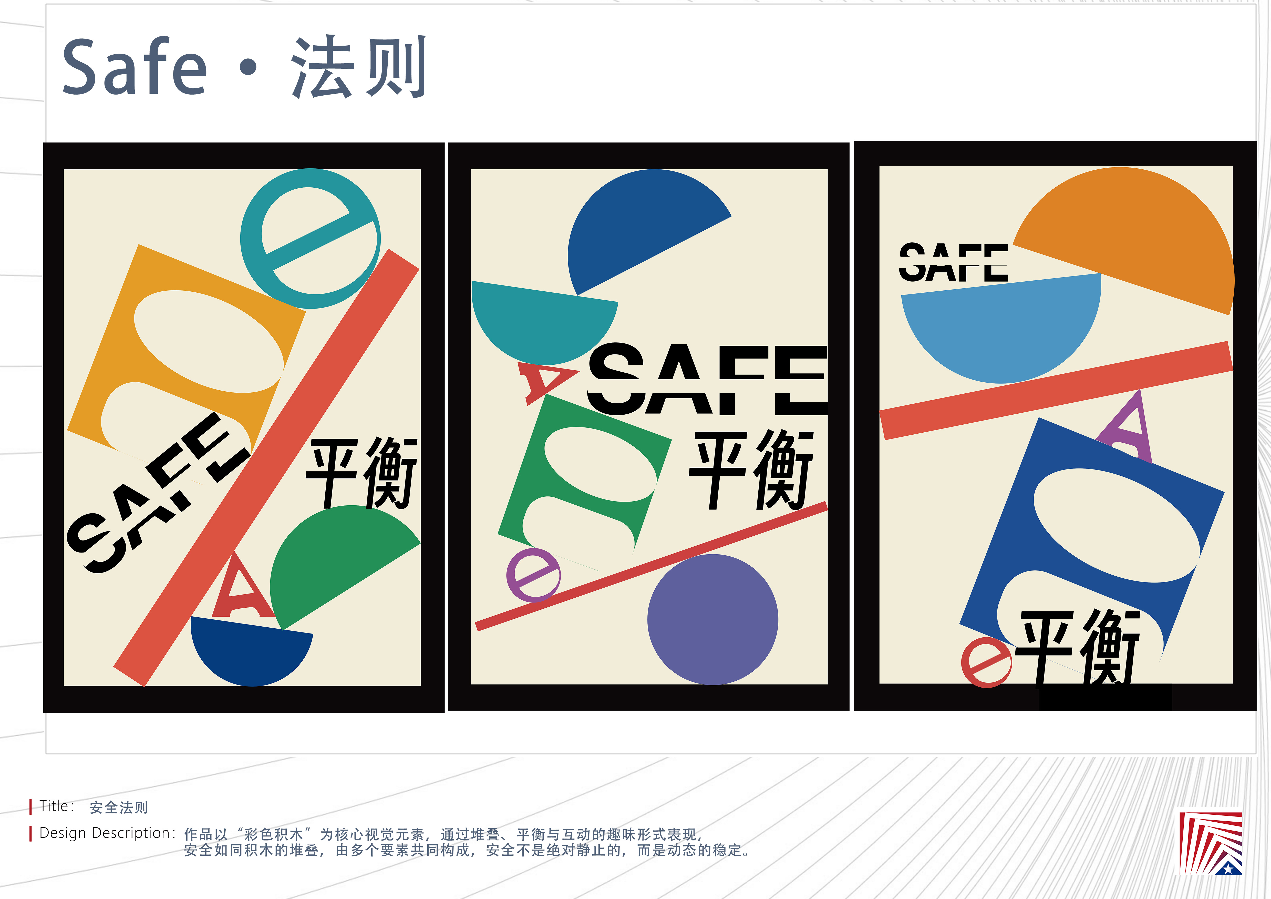 作品说明:作品以“彩色积木”为核心视觉元素,通过堆叠、平衡与互动的趣味形式表现,安全如同积木的堆叠,由多个要素共同构成,安全不是绝对静止的,而是动态的稳定.