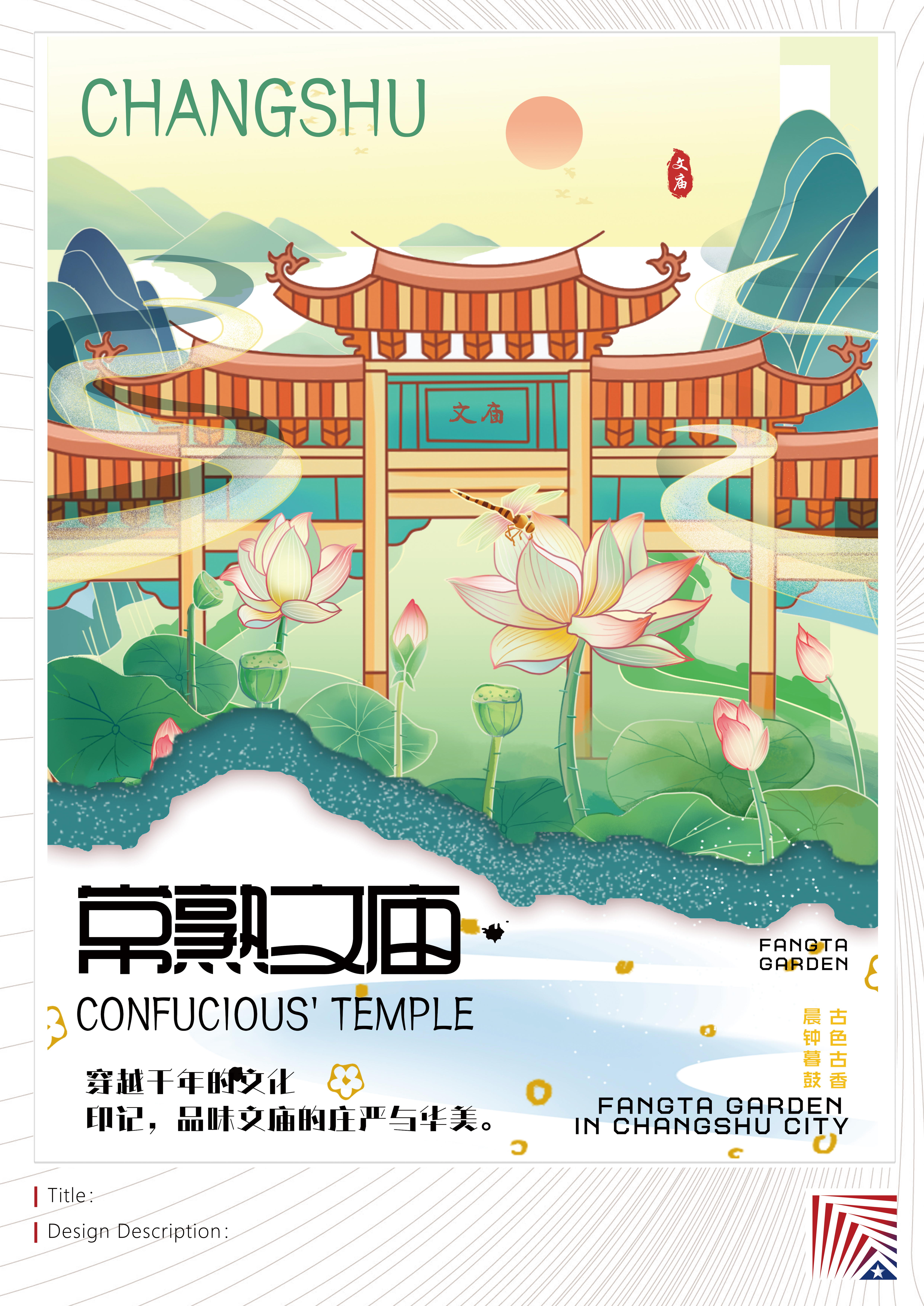 作品说明:常熟,这座历史悠久的城市,以其丰富的文化遗产和独特的自然风光吸引了众多游客。为了更好地推广常熟的文化旅游资源,我们设计了三款主题鲜明的海报,旨在展示常熟的三大特色:孔庙、常熟市和大闸蟹。这三款海报通过不同的设计元素和色彩搭配,生动地展现了常熟的三大特色–深厚的文化底蕴、现代化的城市风貌以及丰富的美食文化。希望能够吸引更多游客前来探索和体验常熟,感受这座城市无与伦比的魅力。