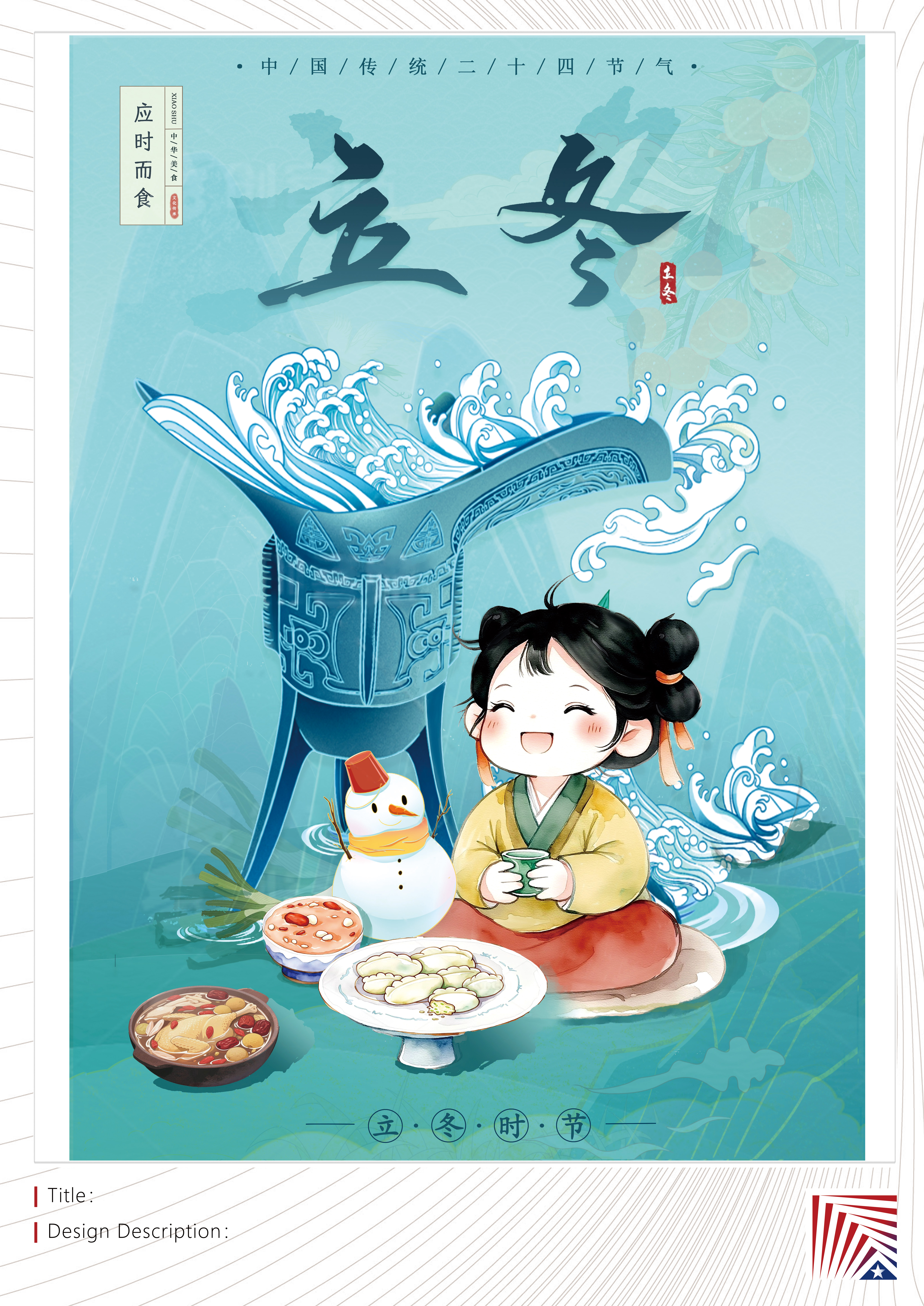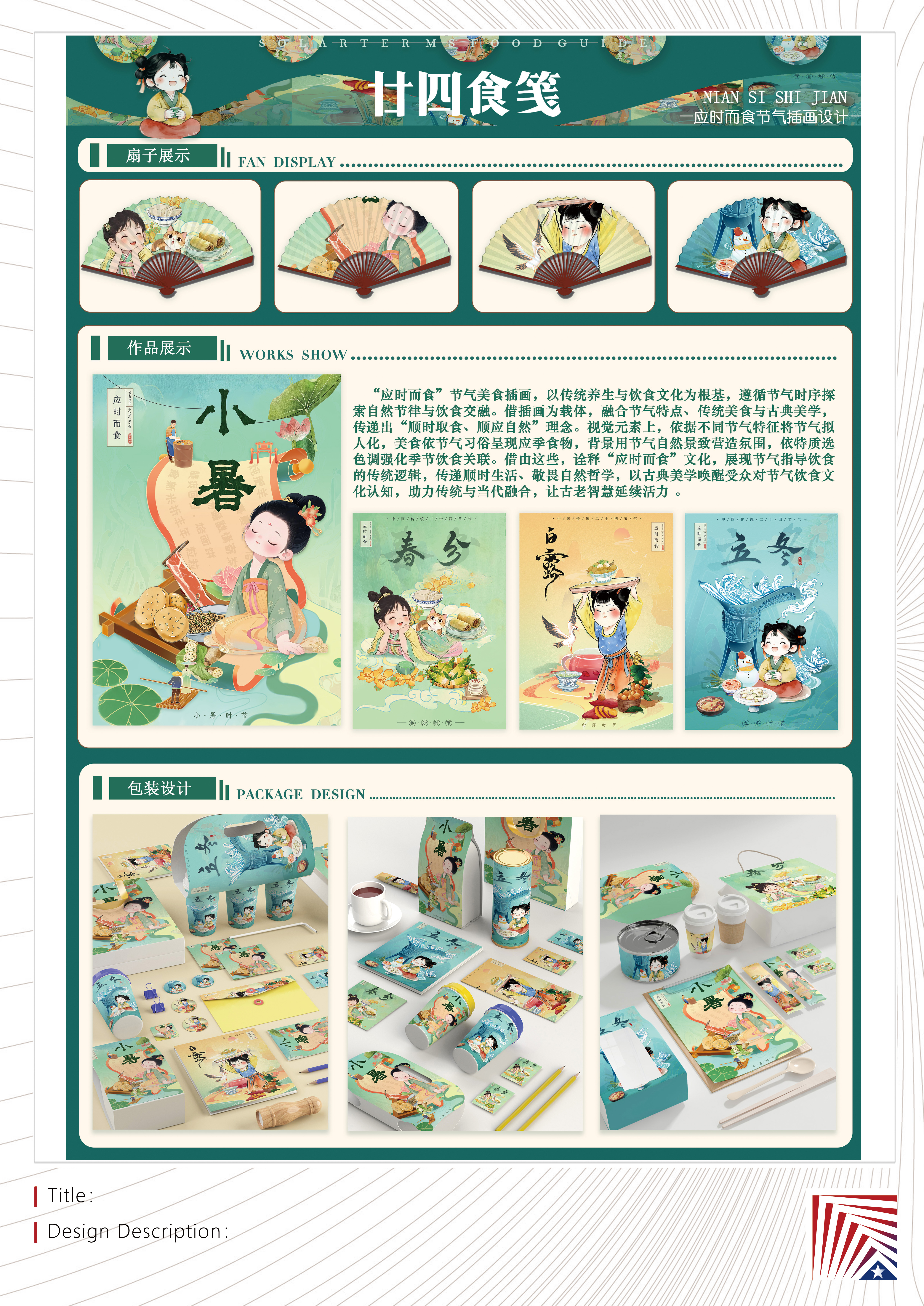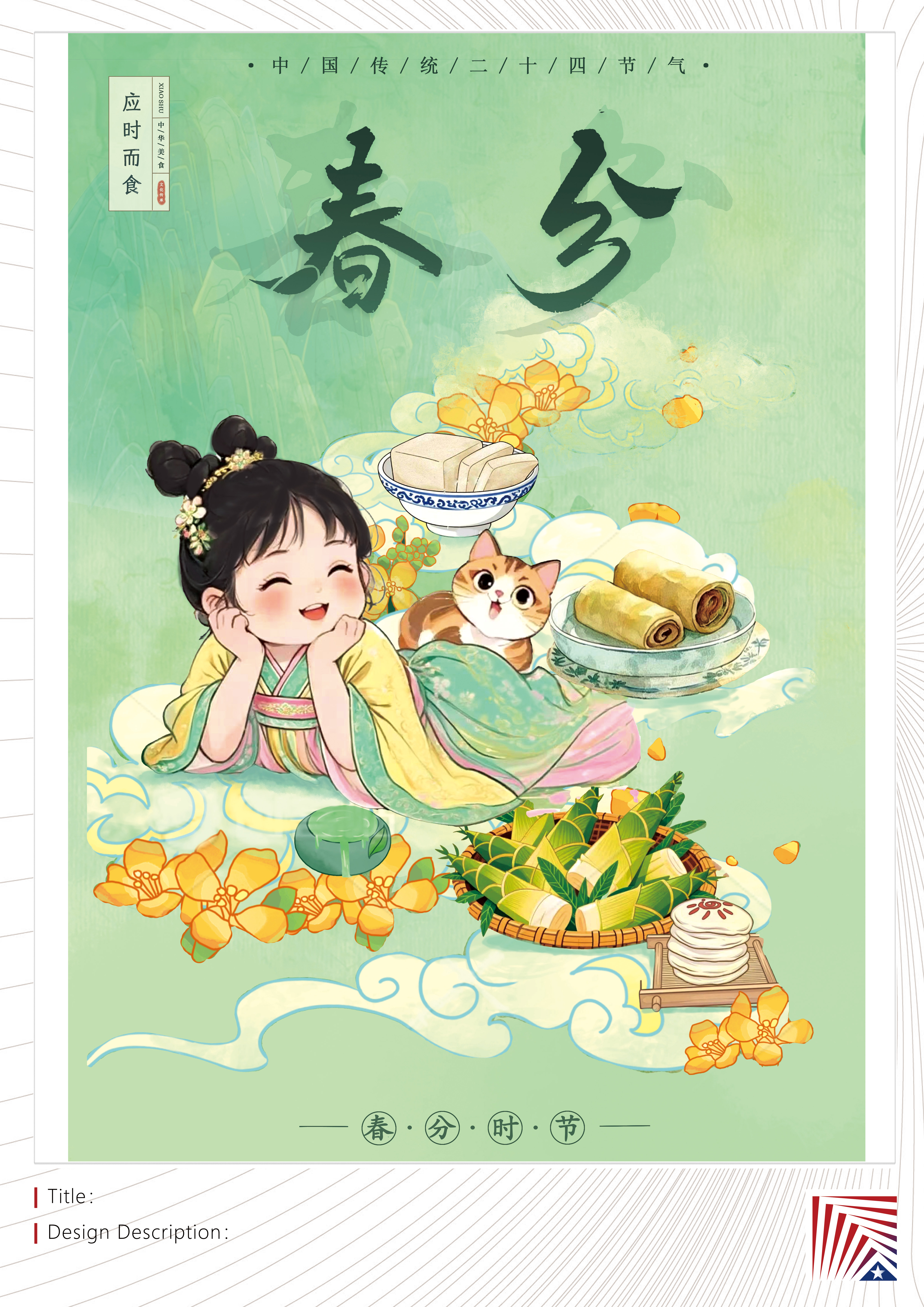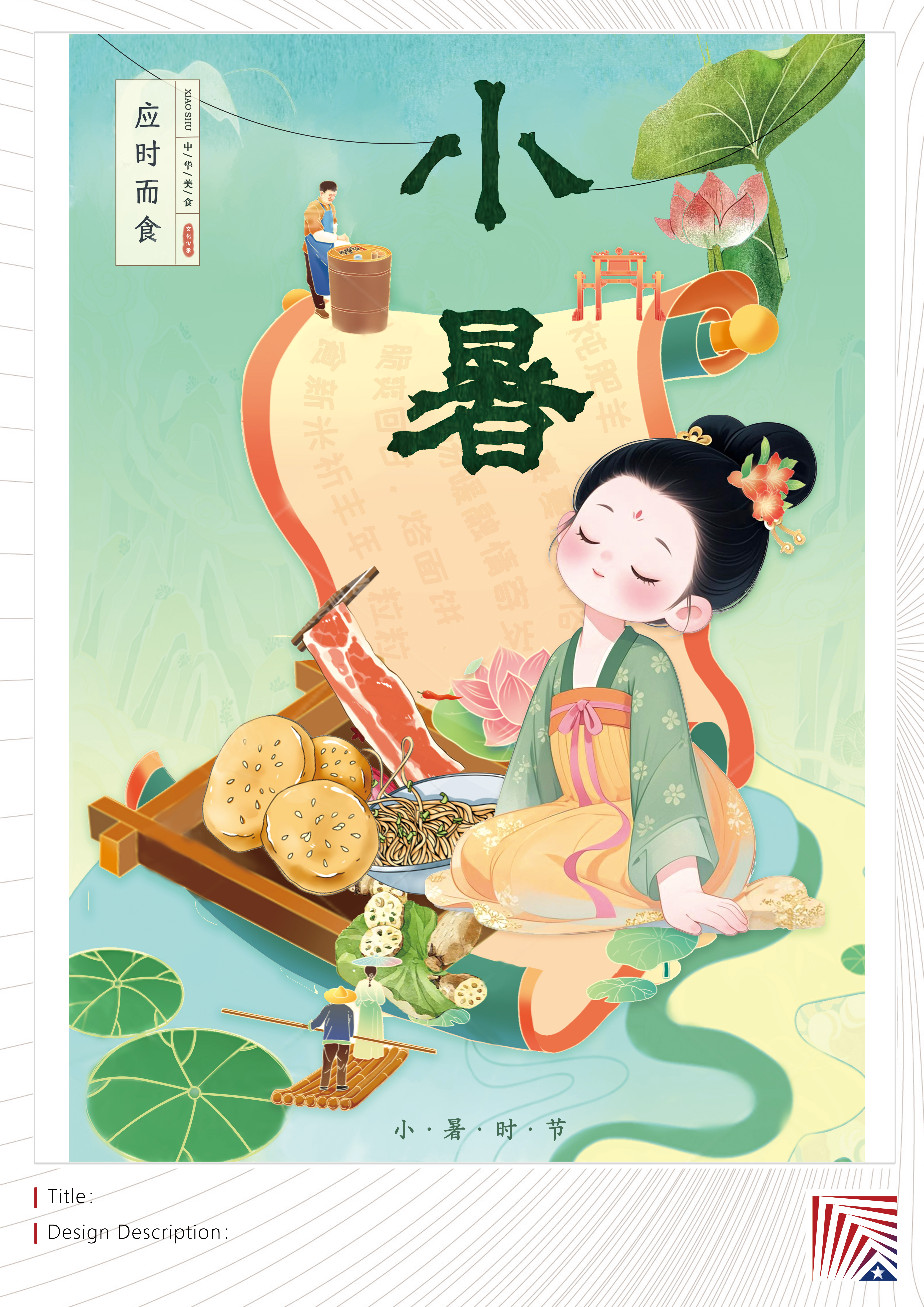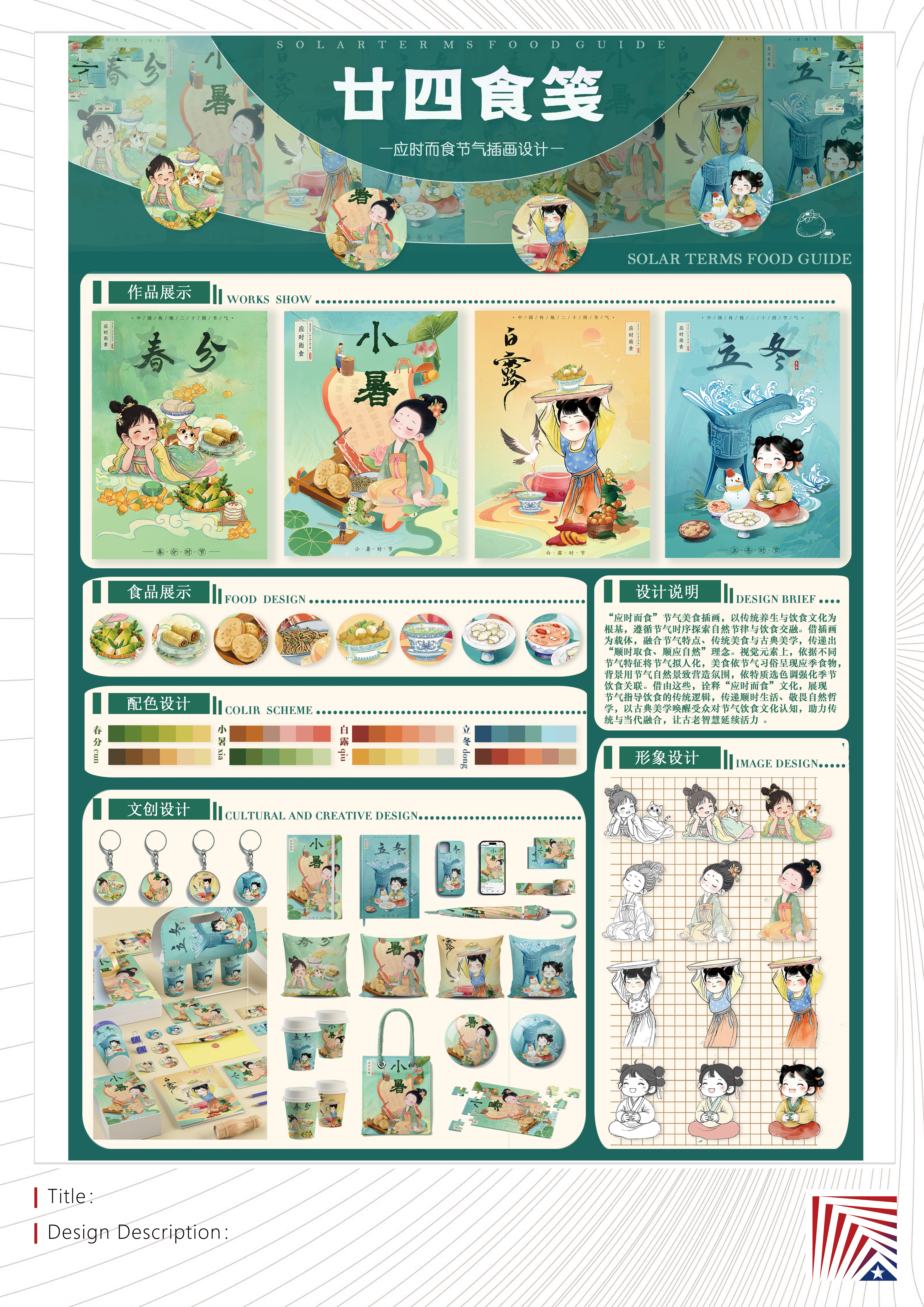 作品说明:“应时而食”节气美食插画,以传统养生与饮食文化为根基,遵循节气时序探索自然节律与饮食交融。借插画为载体,融合节气特点、传统美食与古典美学,传递出“顺时取食、顺应自然”理念。视觉元素上,依据不同节气特征将节气拟人化,美食依节气习俗呈现应季食物,背景用节气自然景致营造氛围,依特质选