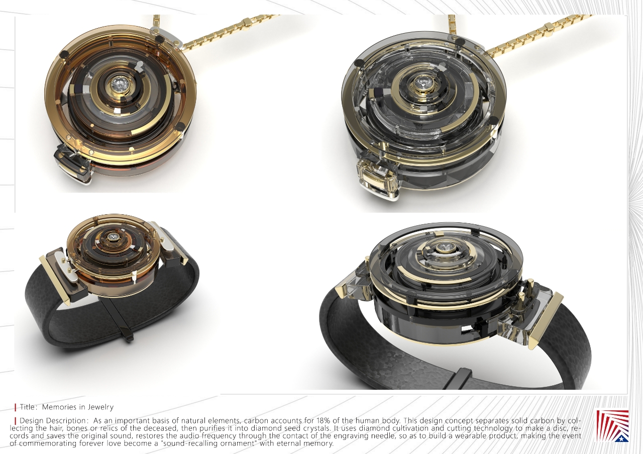 作品说明:碳是自然元素中重要基础,占人体的18%,本设计理念通过收集往生者的头发、骸粉或遗物,以此分离出固体碳,并不断提纯成钻石籽晶。利用钻石培育与琢型技术制成碟片,将原声刻录保存,通过刻针接触还原声频,成为随身穿戴品,也让纪念永爱的一生之事,化作永存记忆的“忆声之饰”。
