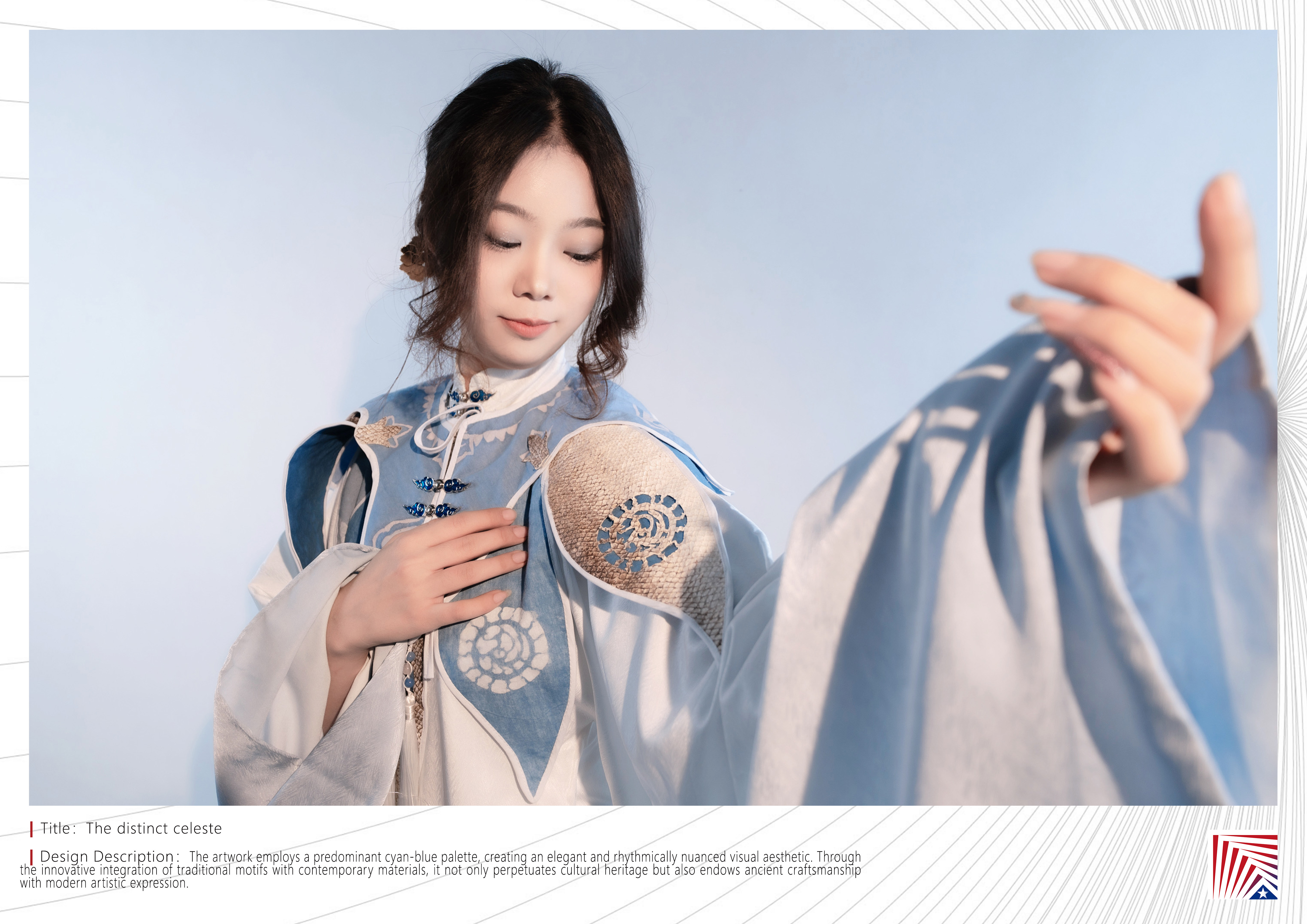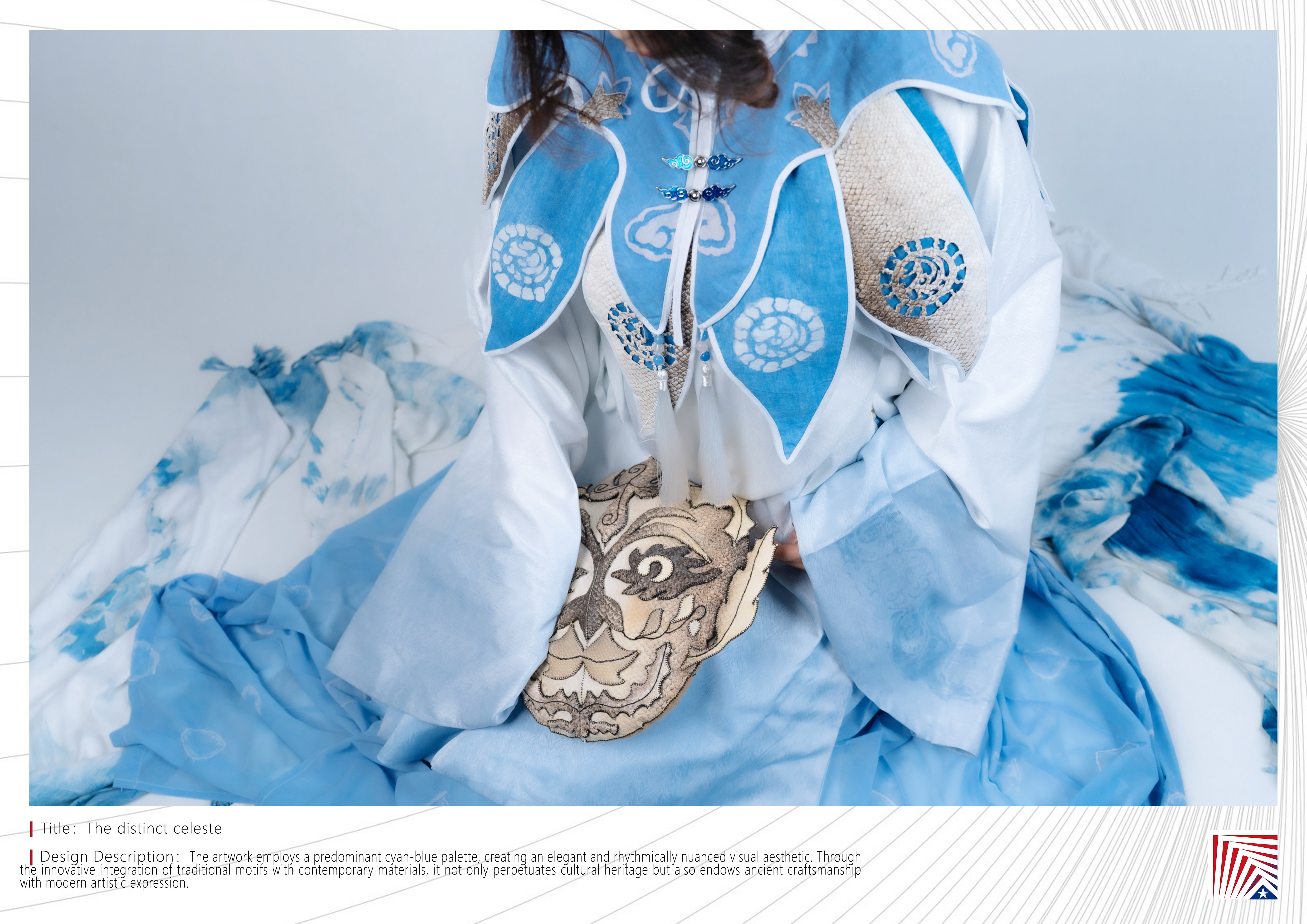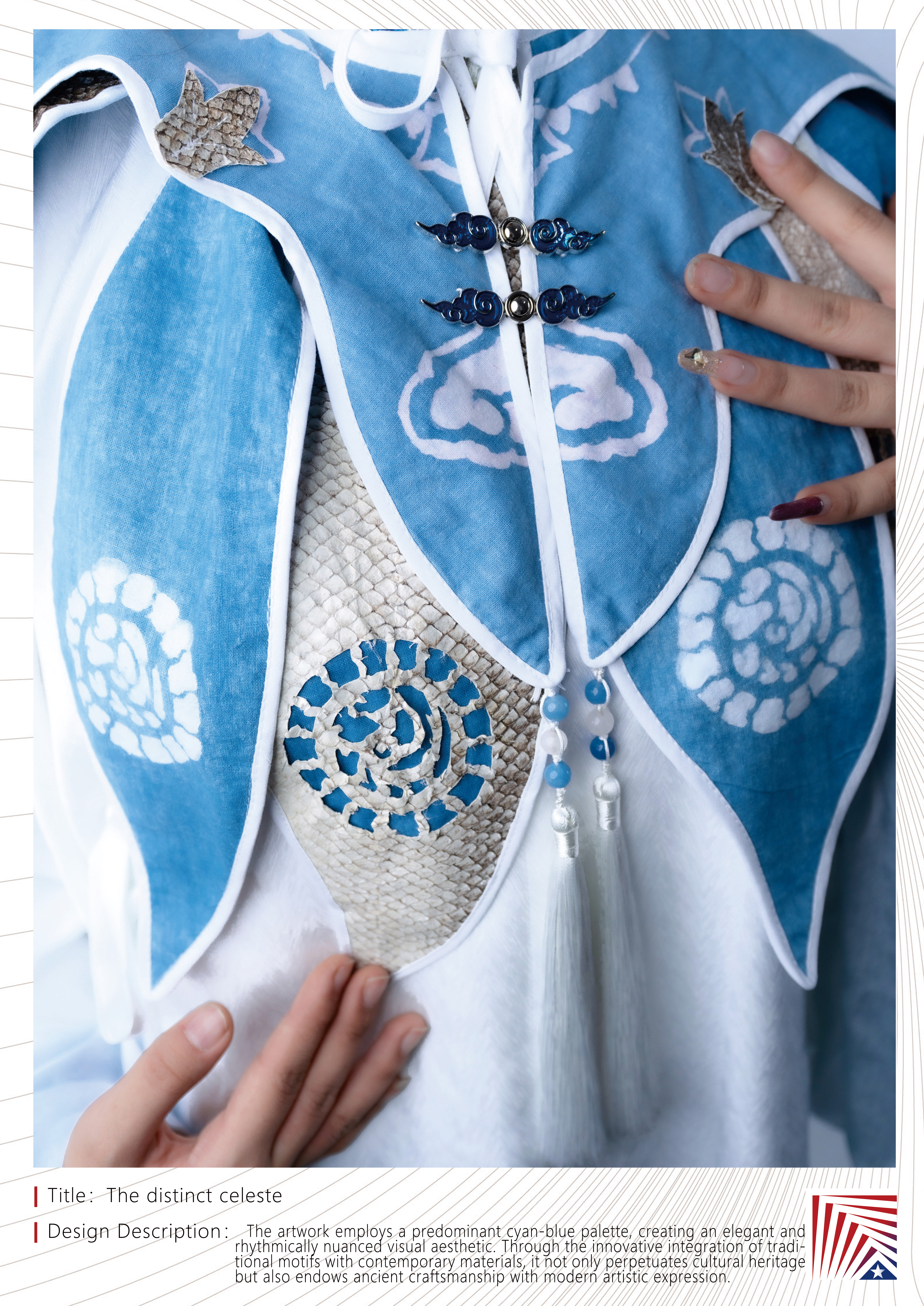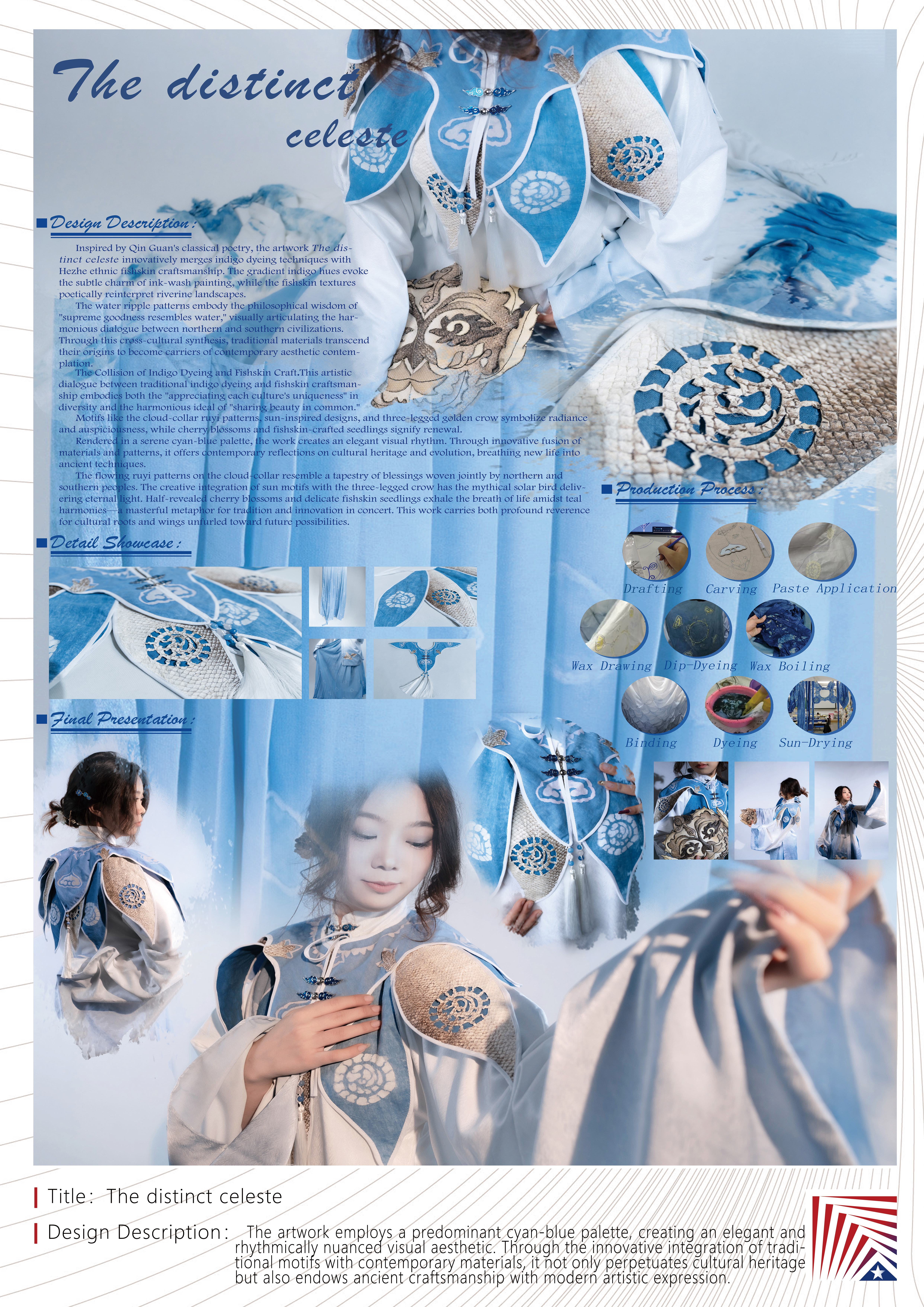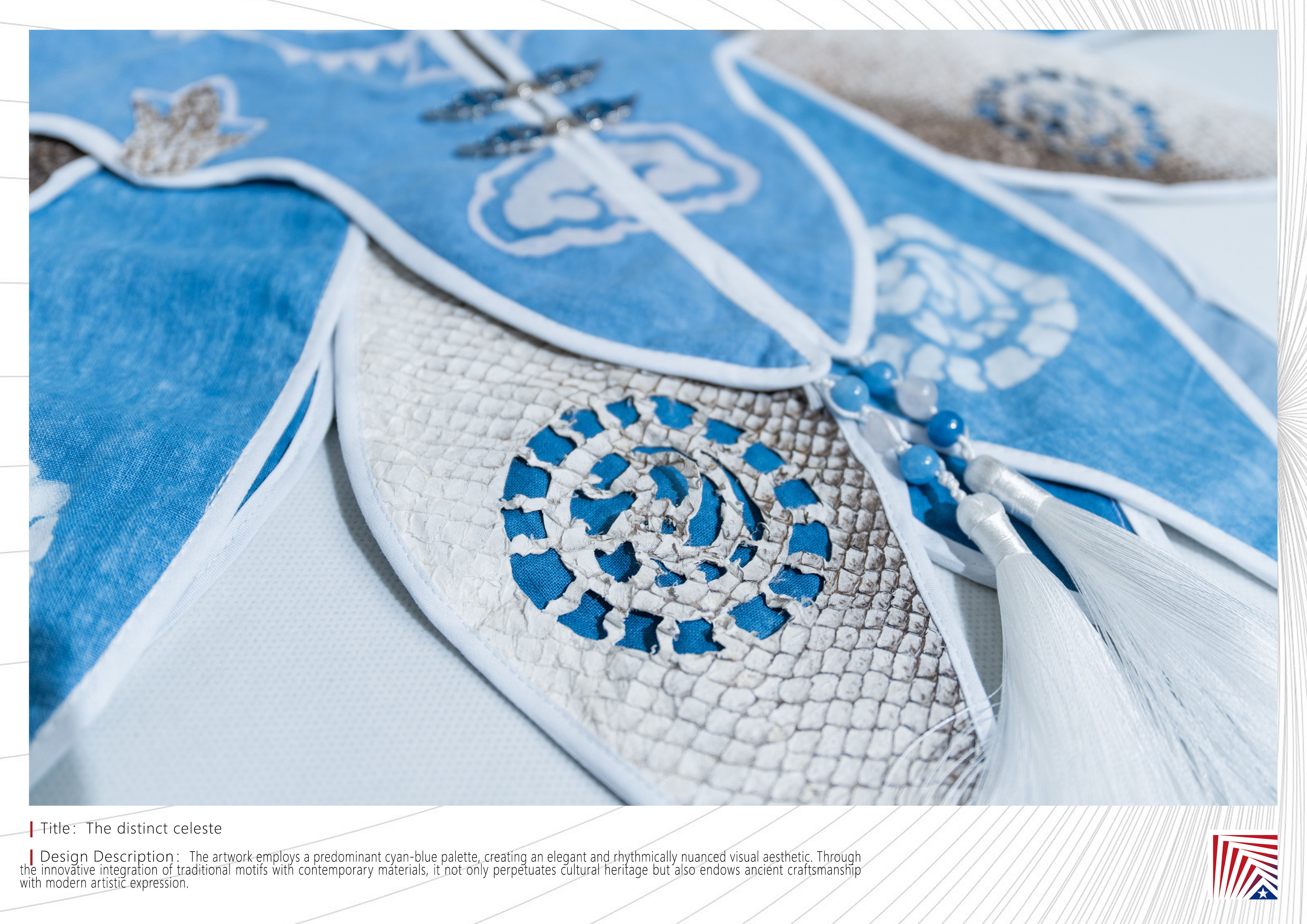 作品说明:作品名撷取自宋代词人秦观《临江仙》中“挼蓝”意象,既凝练了古典诗词的隽永意境,又暗合“青出于蓝”的东方哲思。整体以传统挼蓝色为灵魂色调,将国家级非物质文化遗产——蓝染技艺与赫哲族鱼皮工艺创新融合,以当代设计语言重构非遗之美。