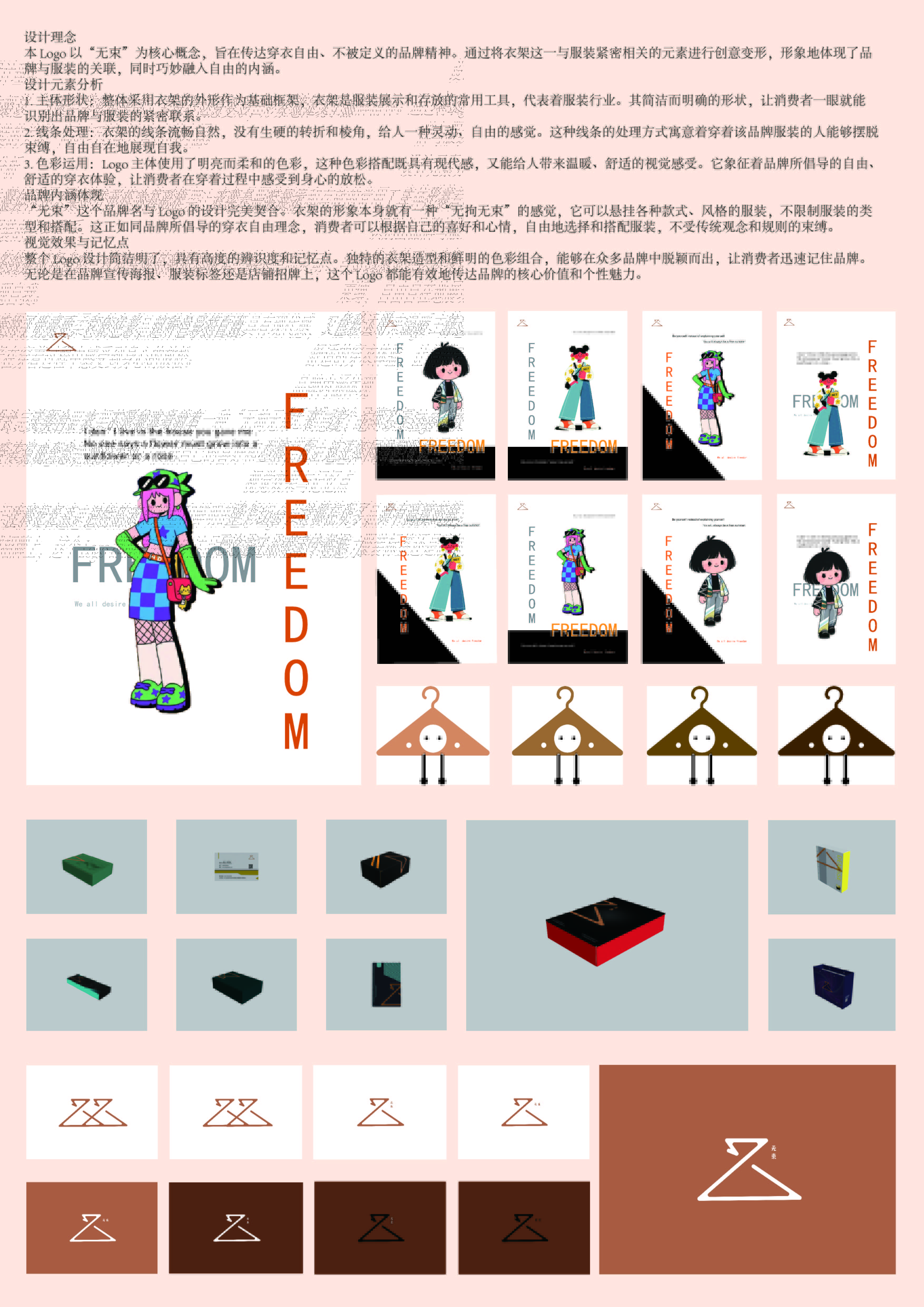本 Logo 以“无束”为核心概念,旨在传达穿衣自由、不被定义的品牌精神。通过将衣架这一与服装紧密相关的元素进行创意变形,形象地体现了品牌与服装的关联,同时巧妙融入自由的内涵。