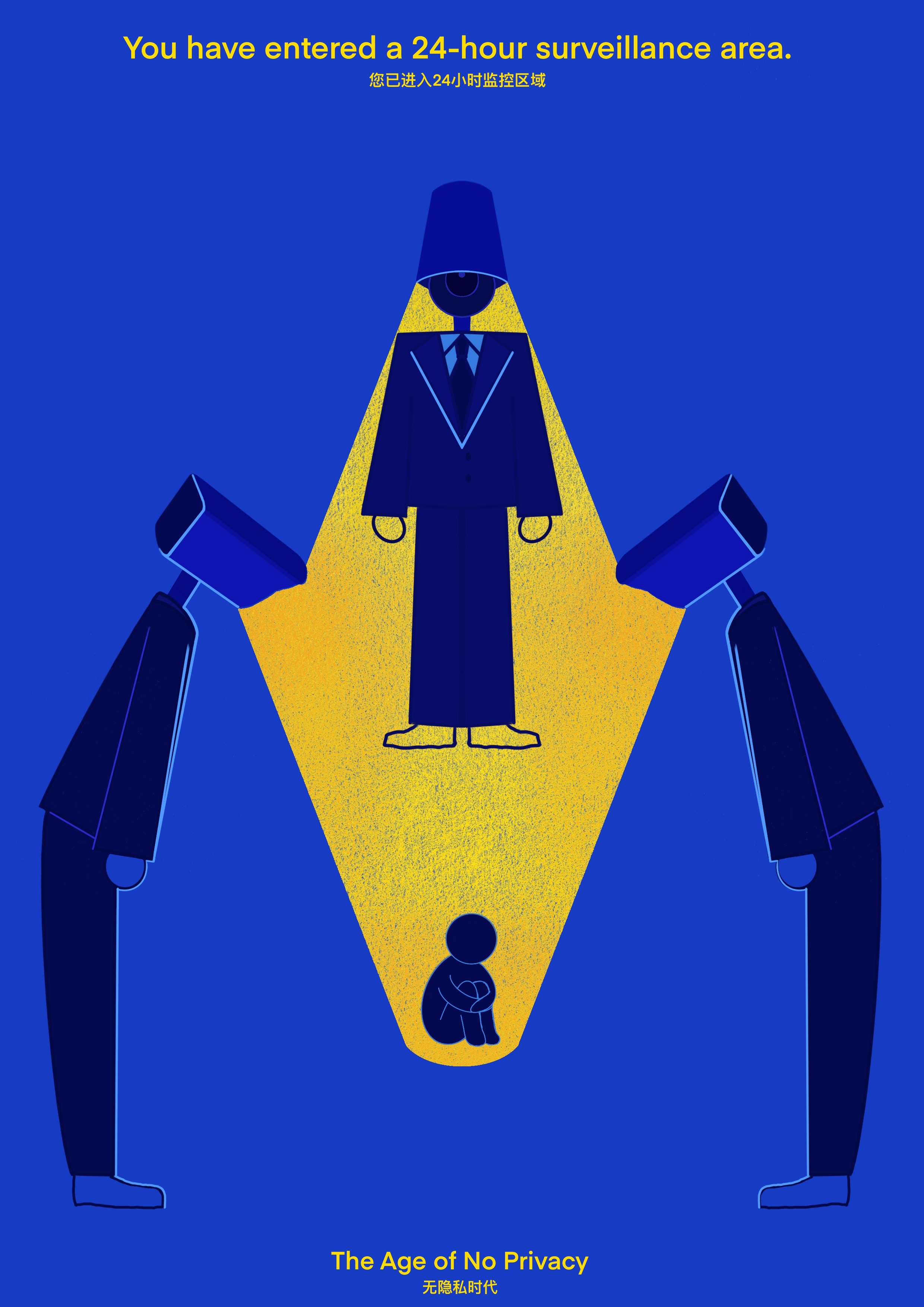 作品说明:这张海报是刺向数字温顺的匕首。它用公共安全语言的躯壳,装载隐私消亡的讣告——当监控标识成为时代背景板,‘被观看’便成了新人类的出厂设置。我以极简的视觉暴力,在这个数字时代,我们真的有隐私吗?质问每个路人:在闪光灯永不熄灭的剧场里,我们是否还记得如何独处?”