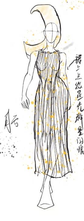 “月亏” 款,线条裙装简约,黄点如月光碎屑,独特头饰呼应月相变化,把月夜诗意穿在身上,尽显静谧柔美感。