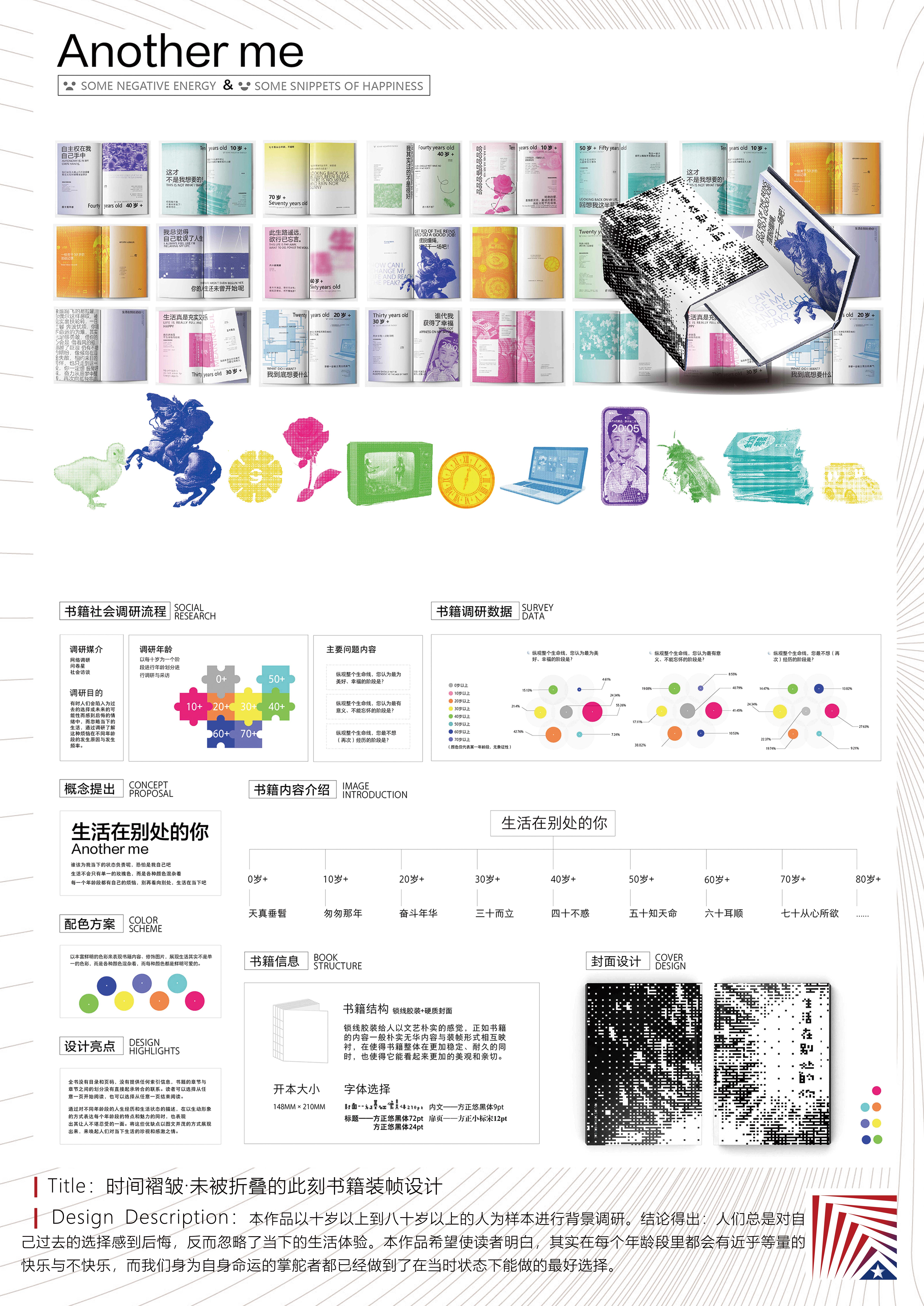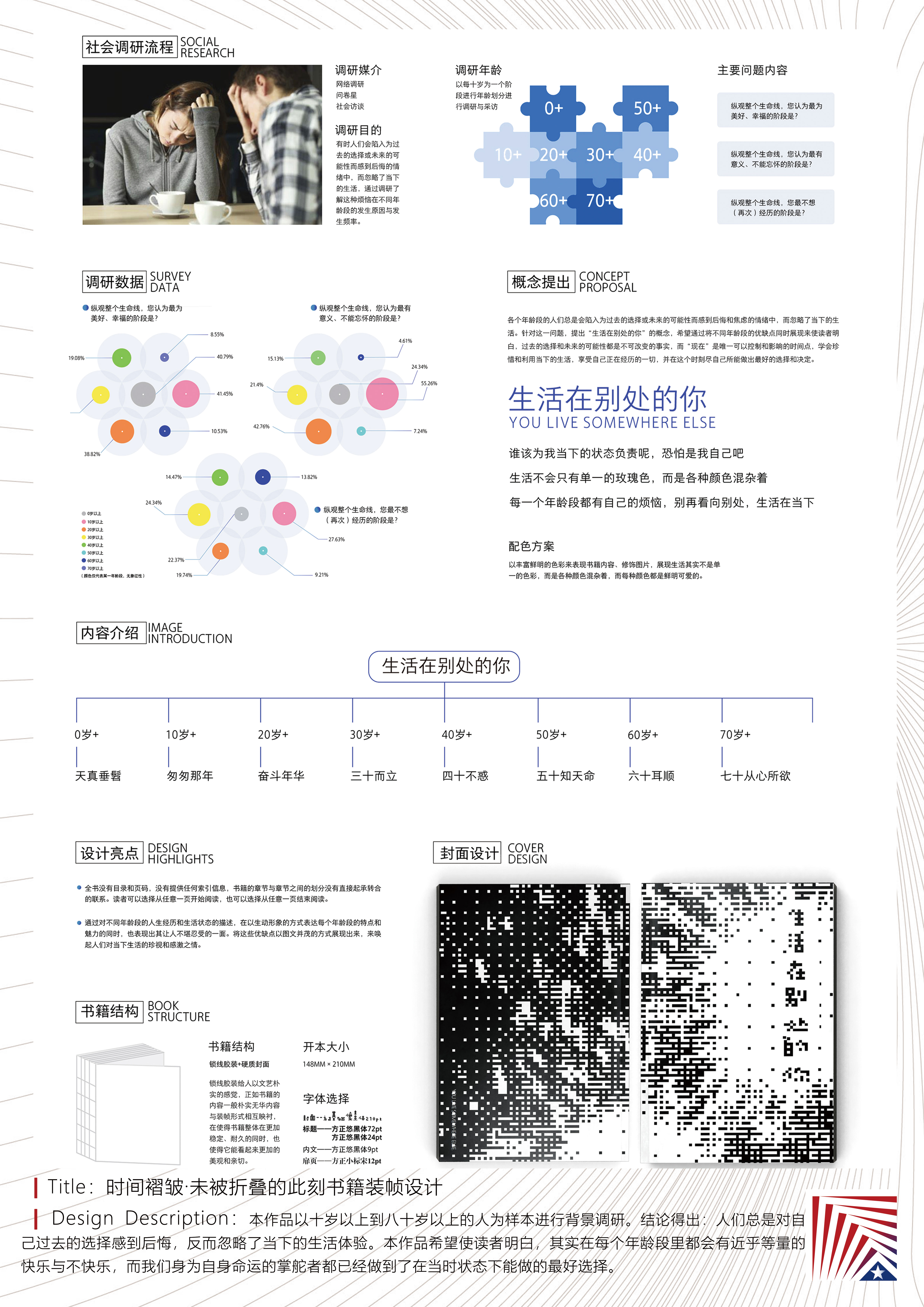 作品说明:人们总是对自己过去的选择感到后悔,反而忽略了当下的生活体验,在发现这一现象后我以问卷星等线上调研工具为媒介,对十岁以上到八十岁以上的人们进行信息收集,主要调研问题包括大家认为生命中最美好的阶段,最不能忘怀的阶段,最不想经历的阶段。从调研结果来看,大家在每个问题中所关注的年龄段都是非常平均的,非常有趣的是,大家所做出的选择都不是自己正所处的年龄段,针对此现象我提出生活在别处的你的概念。