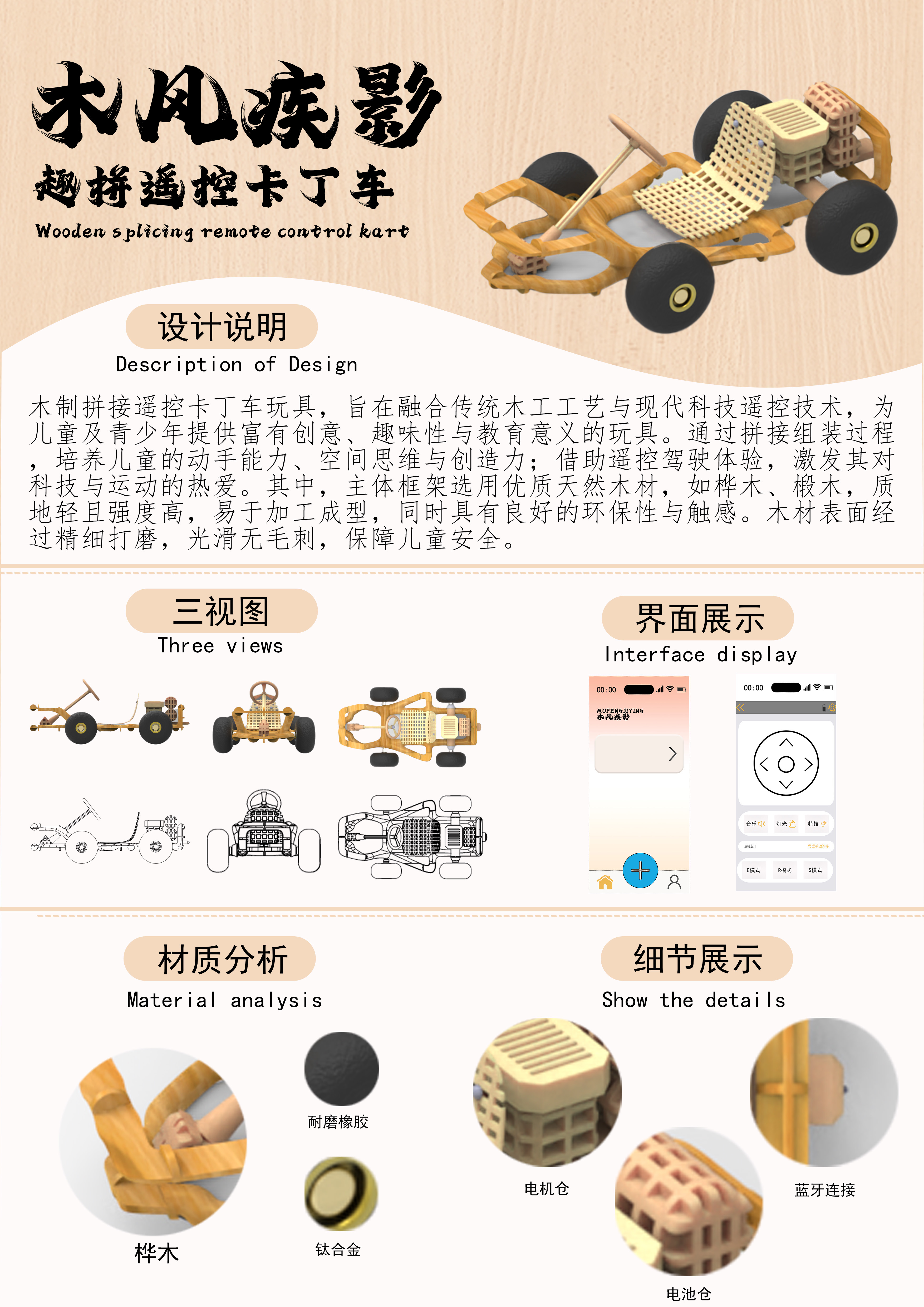 作品说明:木质拼接遥控卡丁车玩具,旨在融合传统木工工艺与现代科技,为儿童和青少年提供富有创意、趣味性的玩具。通过拼接组装的过程,培养儿童的动手能力、空间思维与创造力;借助遥控驾驶体验,激发对科技的热爱。其中,主体框架采用天然木材,不仅质量轻且易于加工,同时具有环保性。