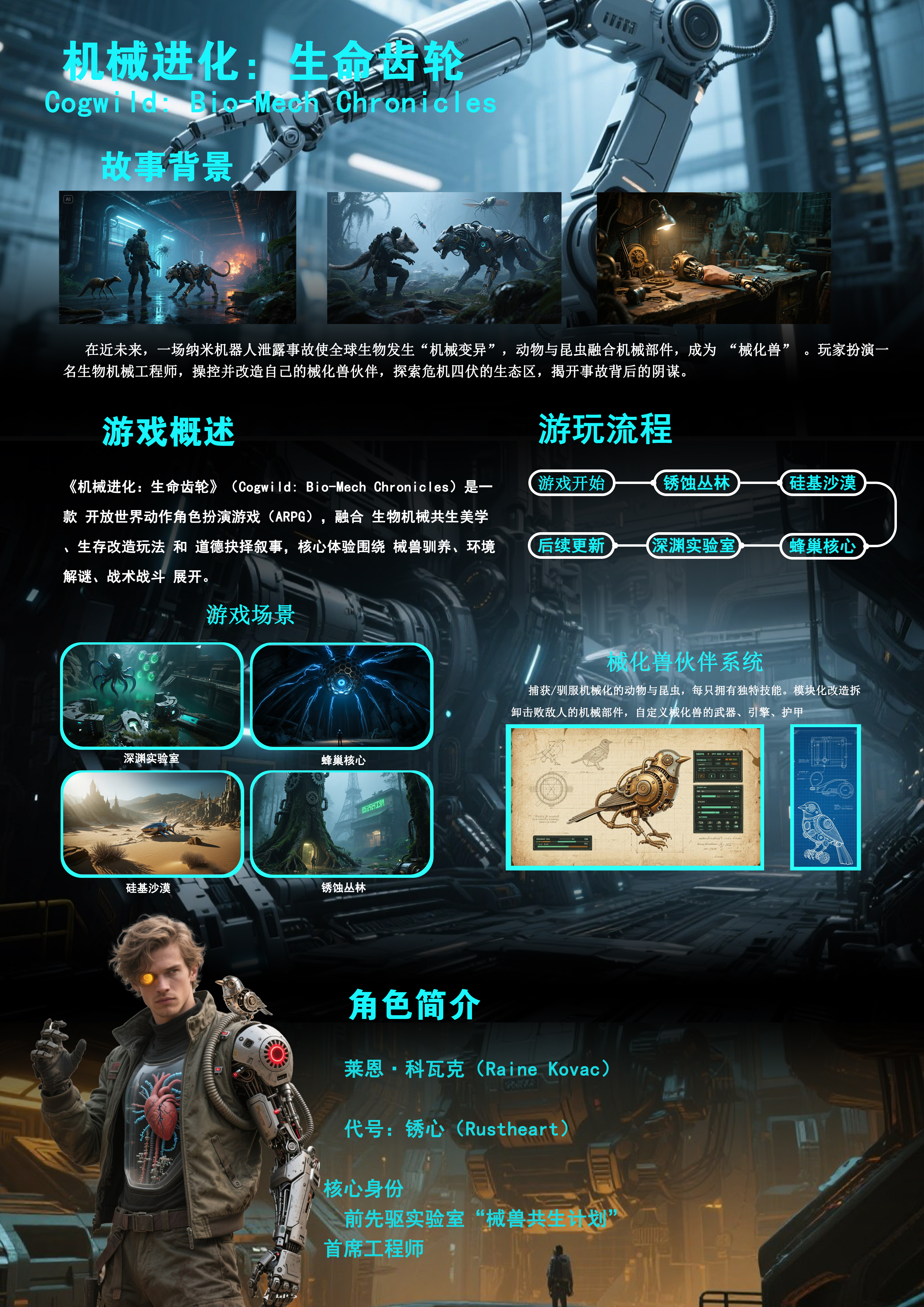 作品说明:《机械进化:生命齿轮》(Cogwild: Bio-Mech Chronicles)是一款 开放世界动作角色扮演游戏(ARPG),融合 生物机械共生美学、生存改造玩法 和 道德抉择叙事,核心体验围绕 械兽驯养、环境解谜、战术战斗 展开。