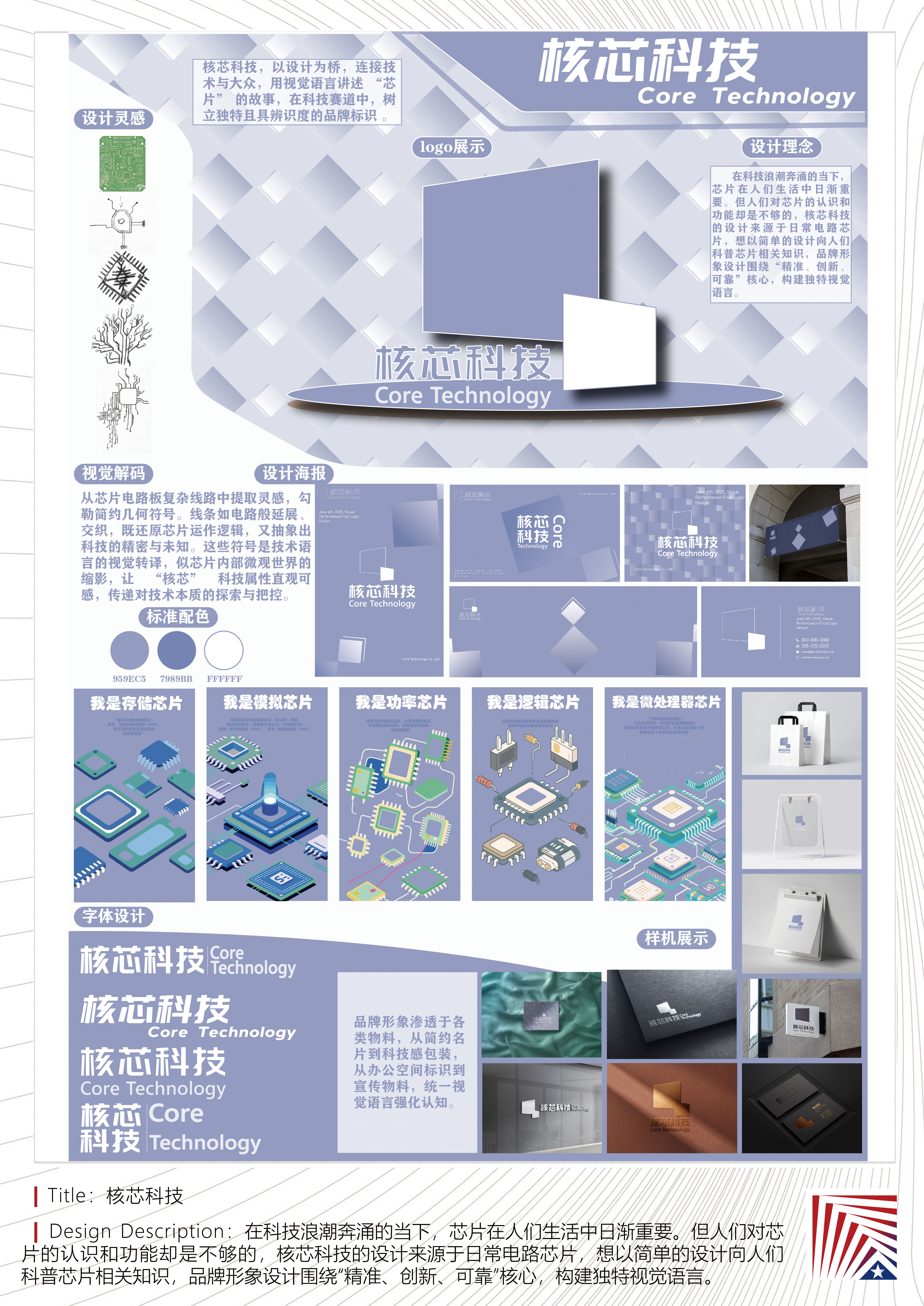作品说明:在科技浪潮奔涌的当下,芯片在人们生活中日渐重要。但人们对芯片的认识和功能却是不够的,核芯科技的设计来源于日常电路芯片,想以简单的设计向人们科普芯片相关知识,品牌形象设计围绕“精准、创新、可靠”核心,构建独特视觉语言。