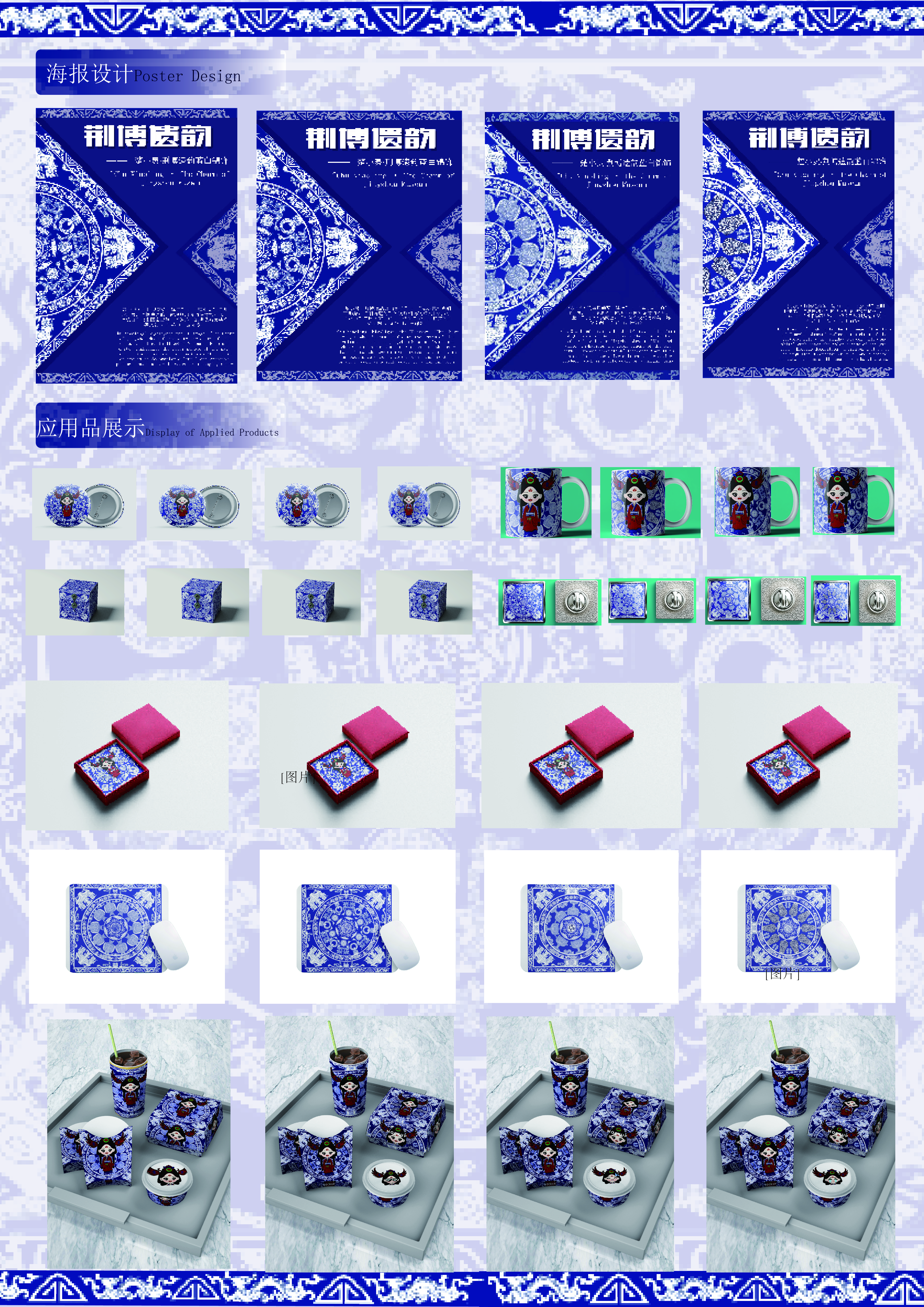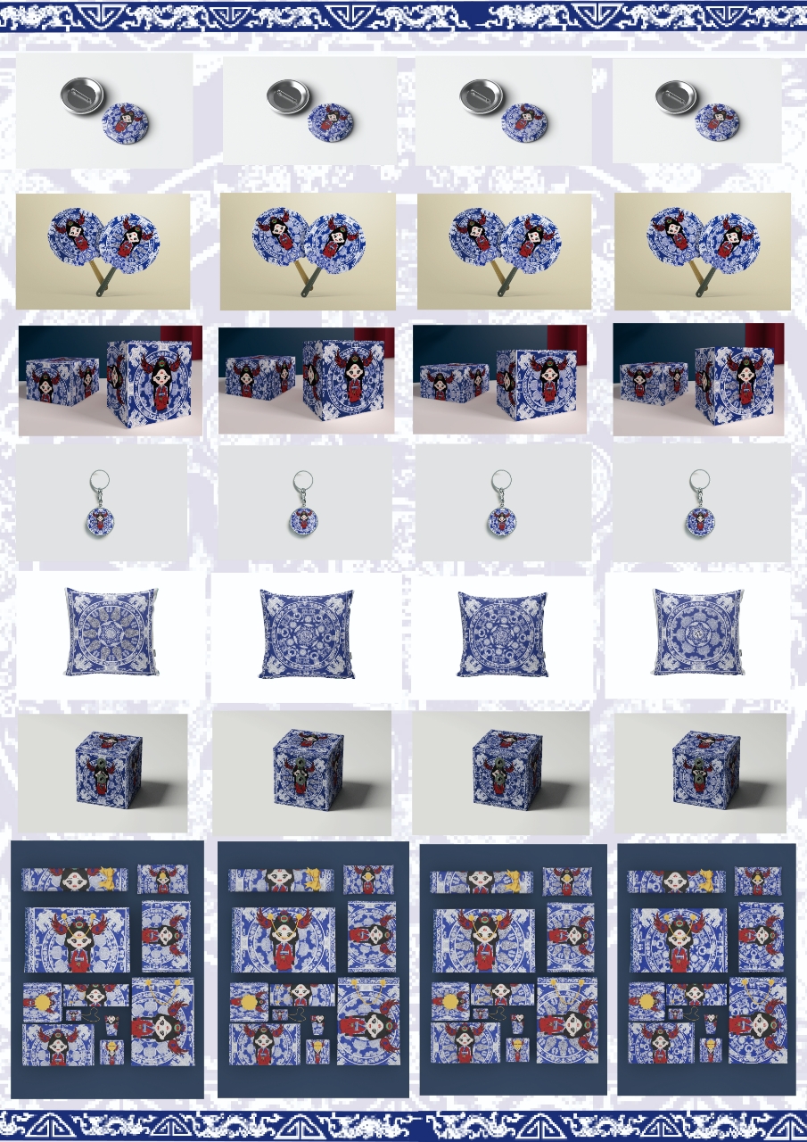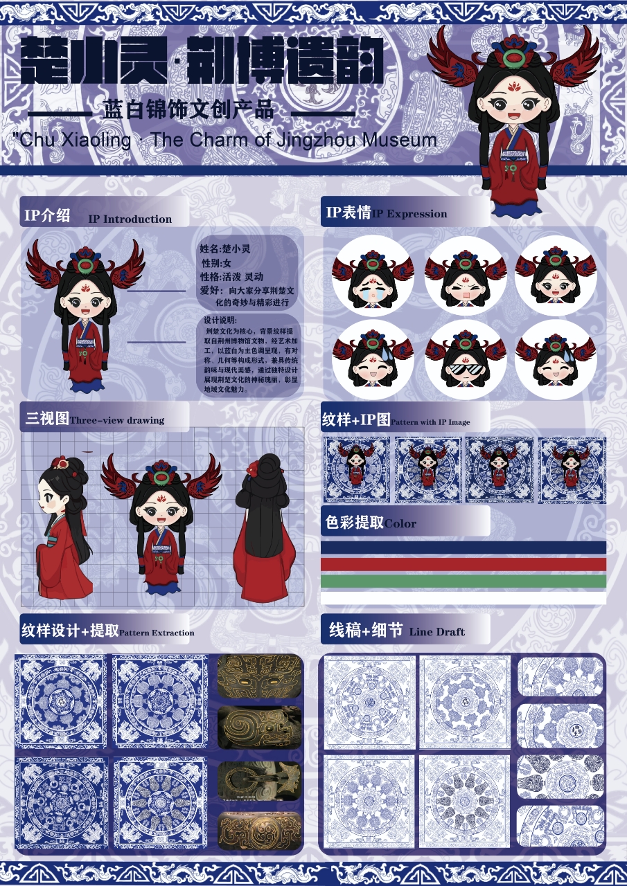作品说明:“楚小灵·荆博遗韵”以荆州博物馆文化为核心,打造IP“楚小灵”,她活泼灵动,肩负传播荆楚文化使命。设计融合荆博文物元素,通过三视图、表情、纹样、色彩、线稿等,提取经典蓝白及传统纹样,借可爱形象与文创形式,让荆楚文化“活”起来,架起大众与古老文化的沟通桥梁 。