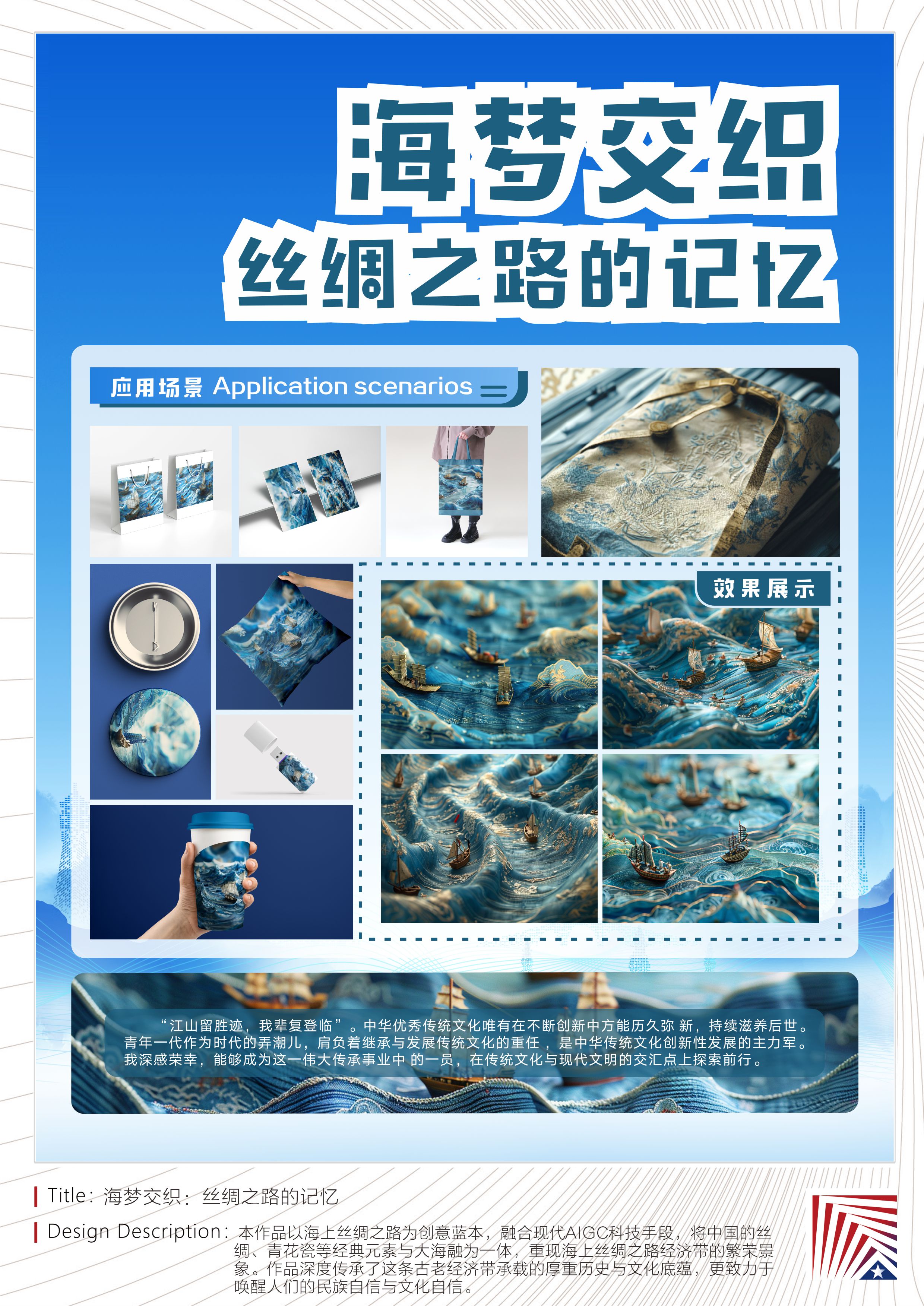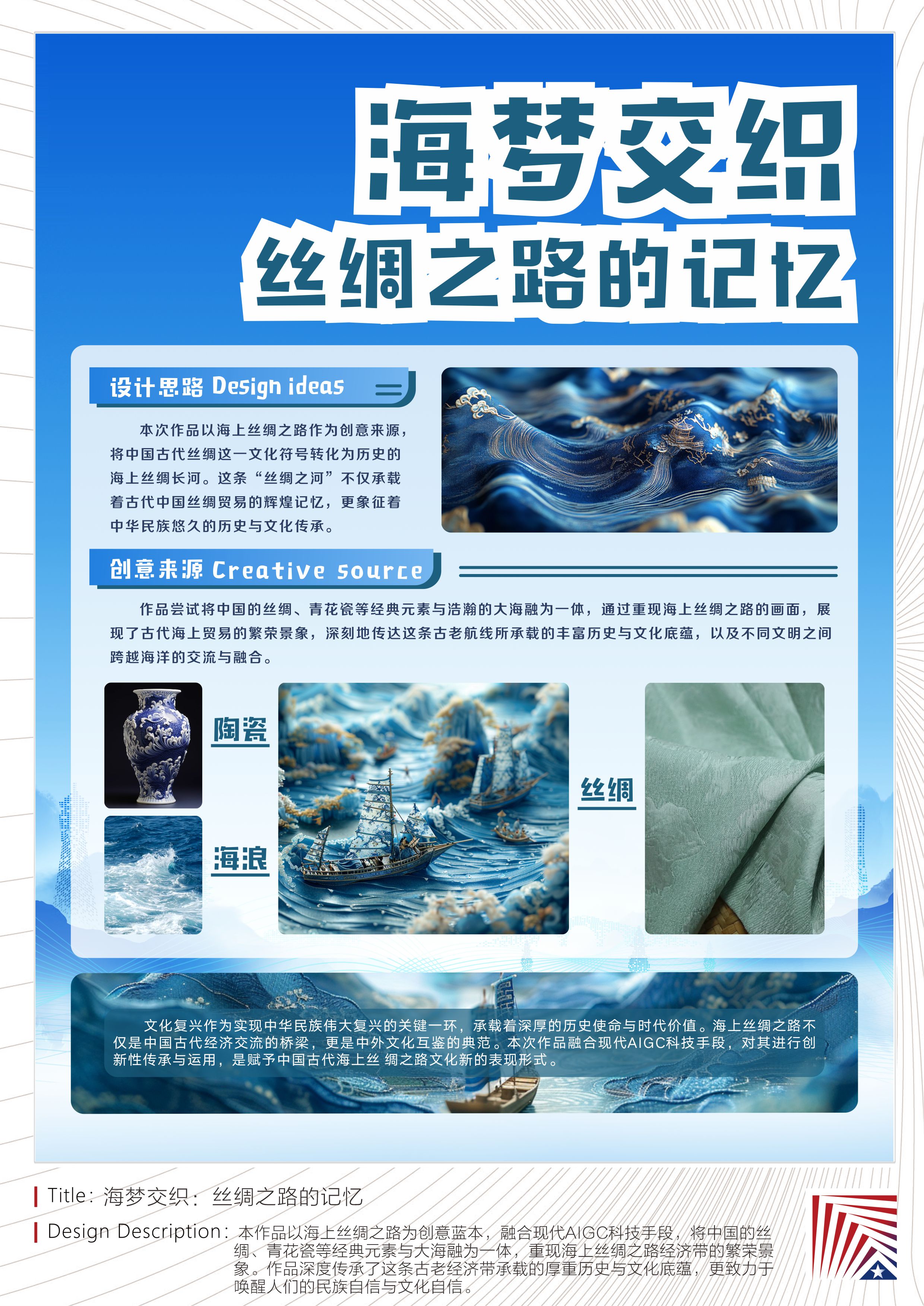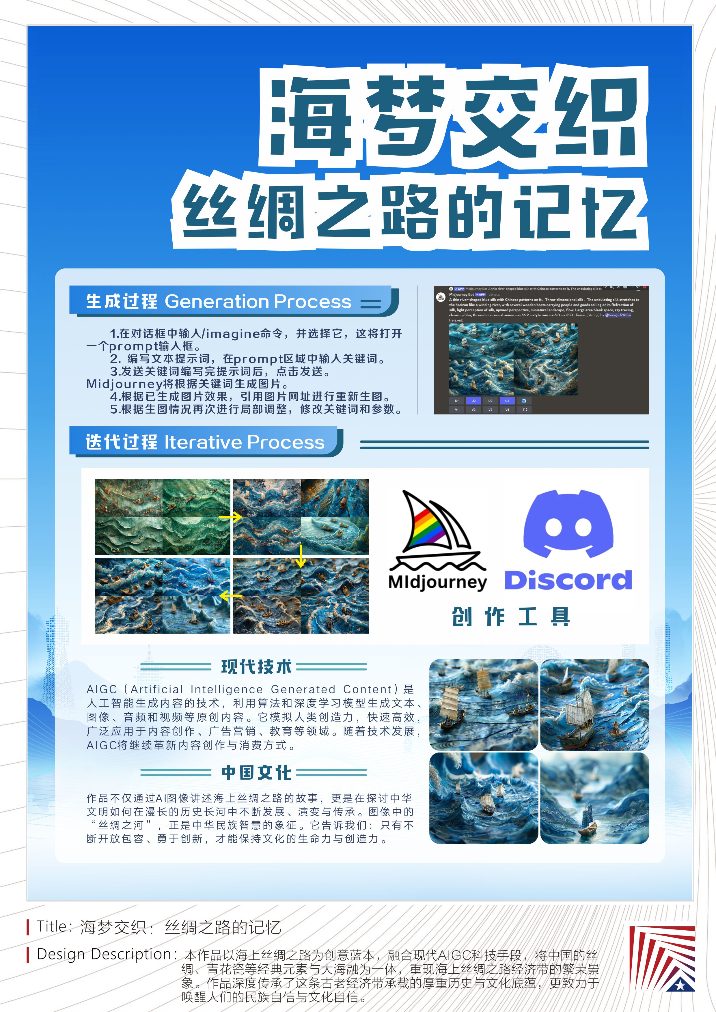 作品说明:本作品以海上丝绸之路为创意蓝本,融合现代AIGC科技手段,借助Midjourney将中国的丝绸、青花瓷等经典元素与大海融为一体,重现海上丝绸之路经济带的繁荣景象。作品深度传承了这条古老经济带承载的厚重历史与文化底蕴,更致力于唤醒人们的民族自信与文化自信。