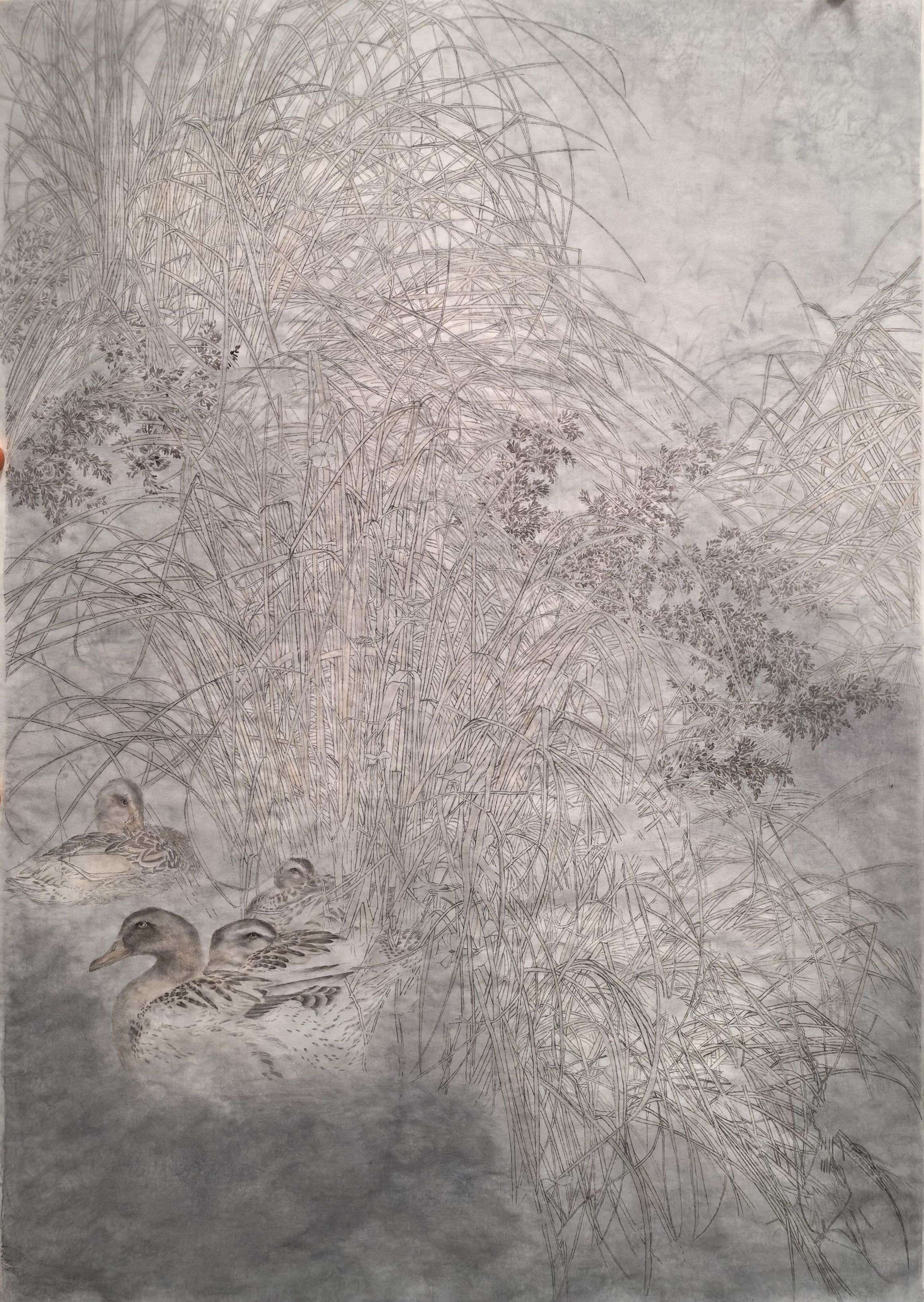 作品说明:化用《诗经》”蒹葭苍苍,白露为霜”的意象,突出芦苇丛的幽深与野鸭的隐逸之趣。画面可强调芦苇的纵向线条与墨色层次,鸭藏于苇间若隐若现,留白处似有雾气弥漫,传递古典诗意与朦胧之美。