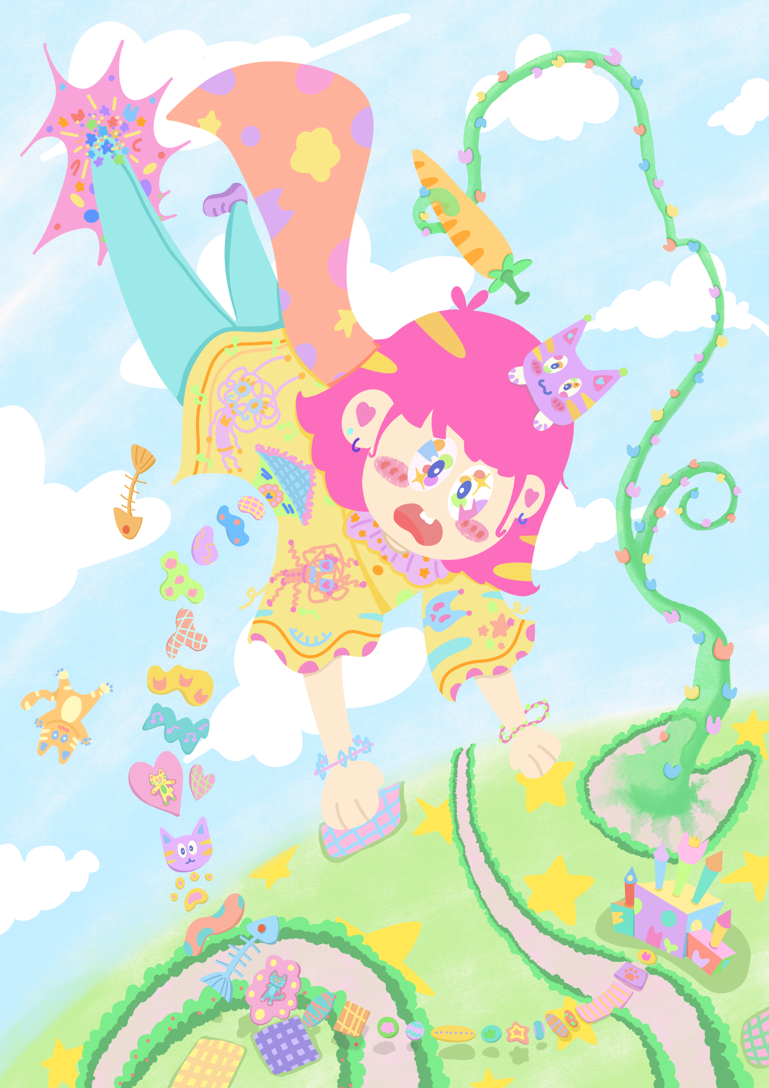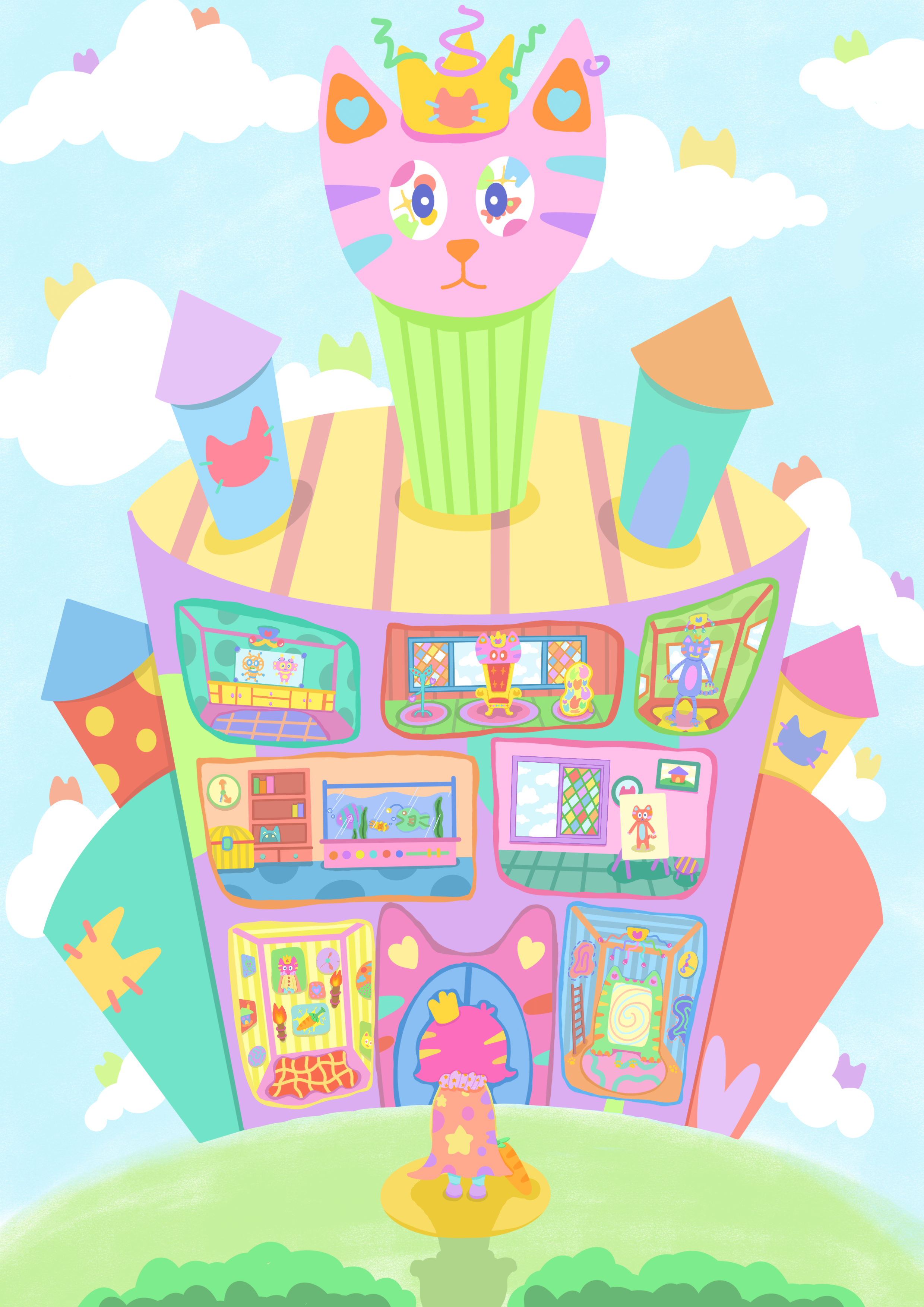 作品说明:某一天,潘潘大王掉进了一个洞里,洞的后面,竟然是另外一个世界!潘潘大王倒挂半空,粉发飞扬,多彩服饰缀满奇幻元素,身旁小鱼、猫咪、爱心等奇妙物件四散,似刚挣脱常规束缚,向着未知奋力探寻,那株蜿蜒绿藤,更是通往奇妙领域的神秘线索。潘潘大王来到猫形城堡前,城堡色彩斑斓,每扇窗后都藏着新惊喜,或是奇妙伙伴,或是趣味场景。从半空探寻到城堡探秘,她的脚步不停,以童真视角,带我们穿梭于色彩与想象编织的天地,每一处细节,都是冒险里的奇妙音符,奏响属于潘潘大王,也属于所有热爱幻想之人的历险乐章,让观者沉浸式感受纯粹的童真与无尽的创意冒险。