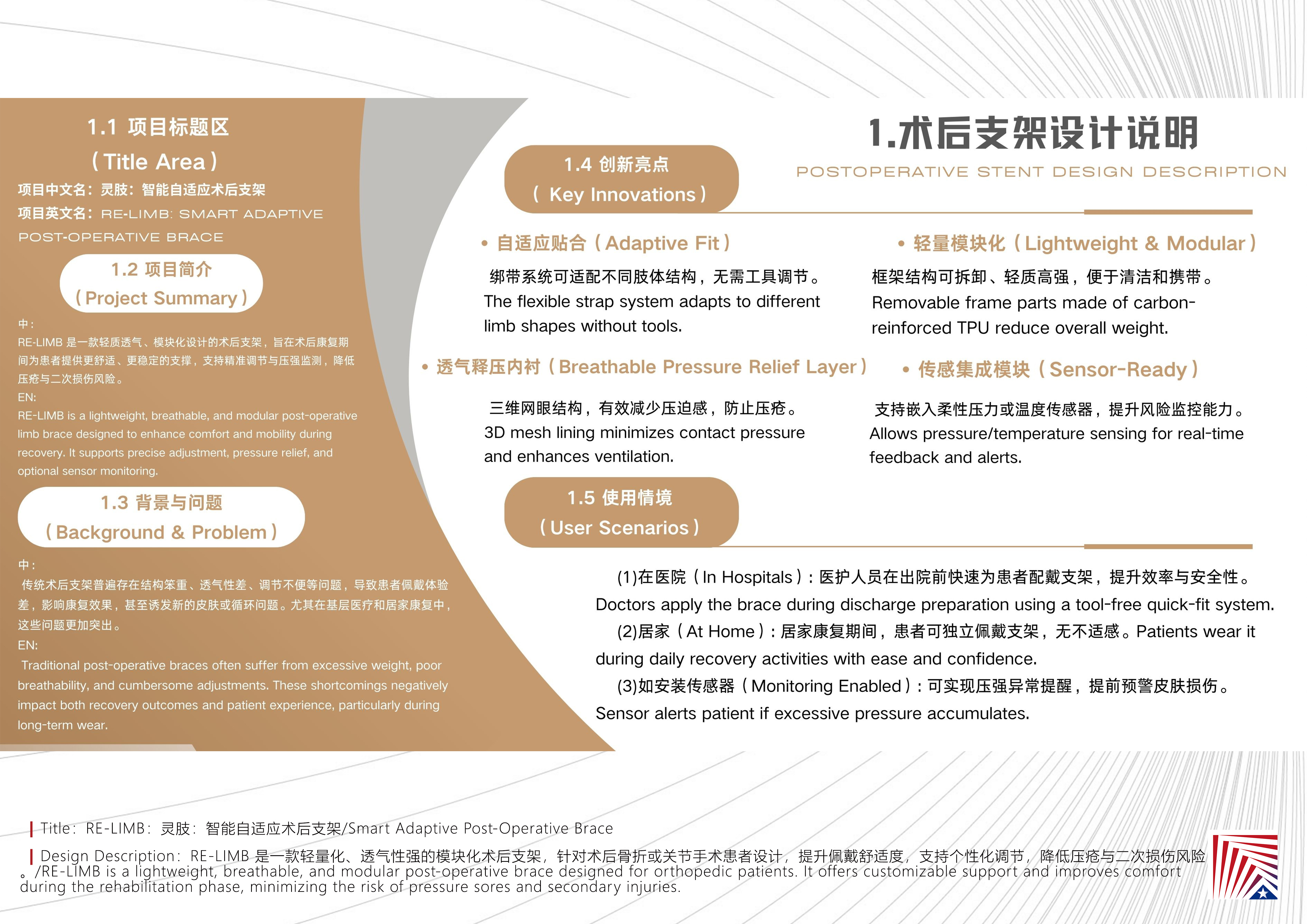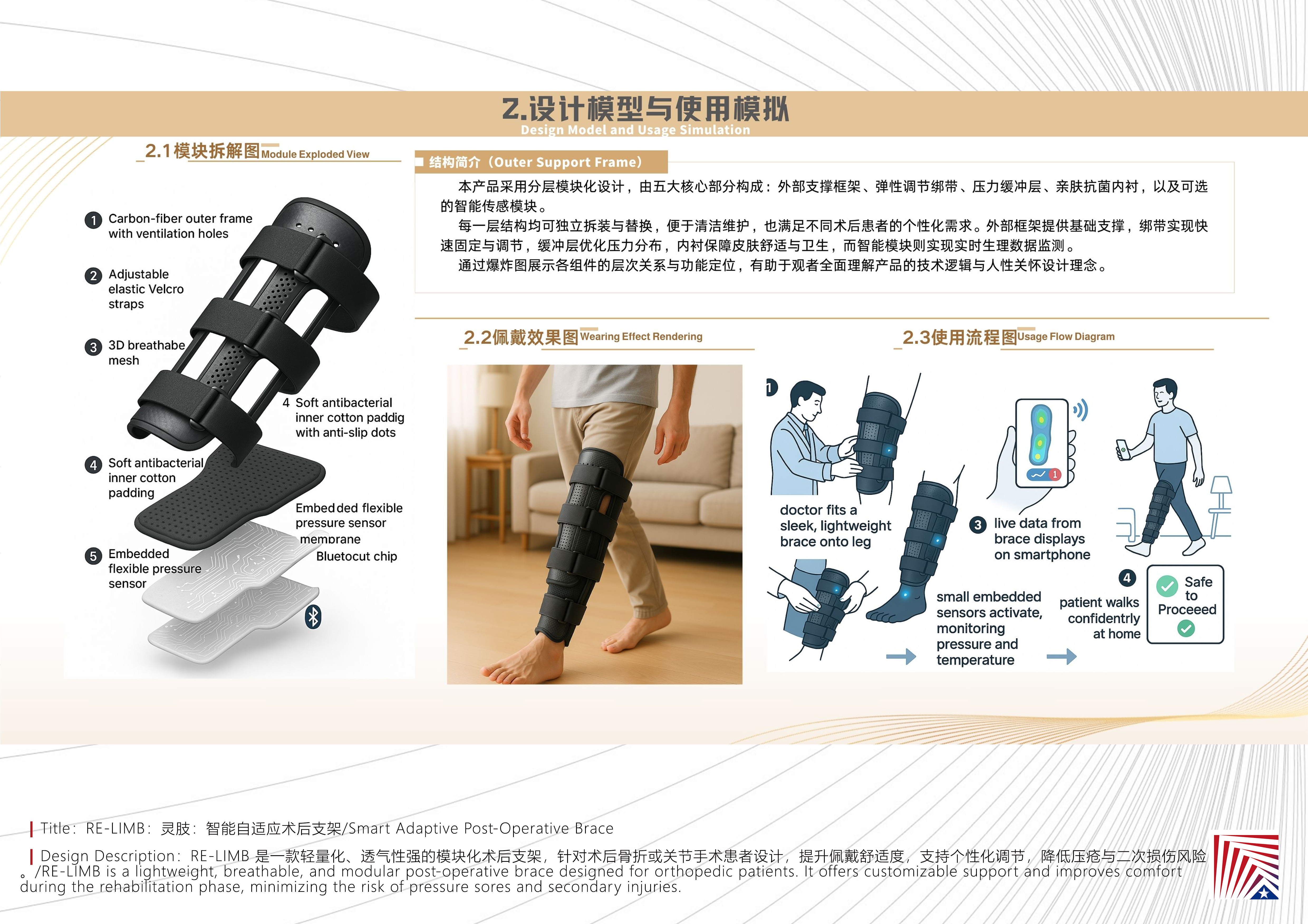 作品说明:为提升术后患者的康复质量与生活便利性,本作品设计了一款兼具智能监测与人性化佩戴体验的术后支架。该支架采用模块化结构,包含外部支撑框架、弹性绑带、缓冲层、亲肤内衬与可选的智能传感模块,可根据不同患者需求灵活组合与调节。通过内嵌传感器与手机端APP连接,用户可实时监测局部压力与温度变化,及时预警压伤风险,辅助医生远程干预与调整。
