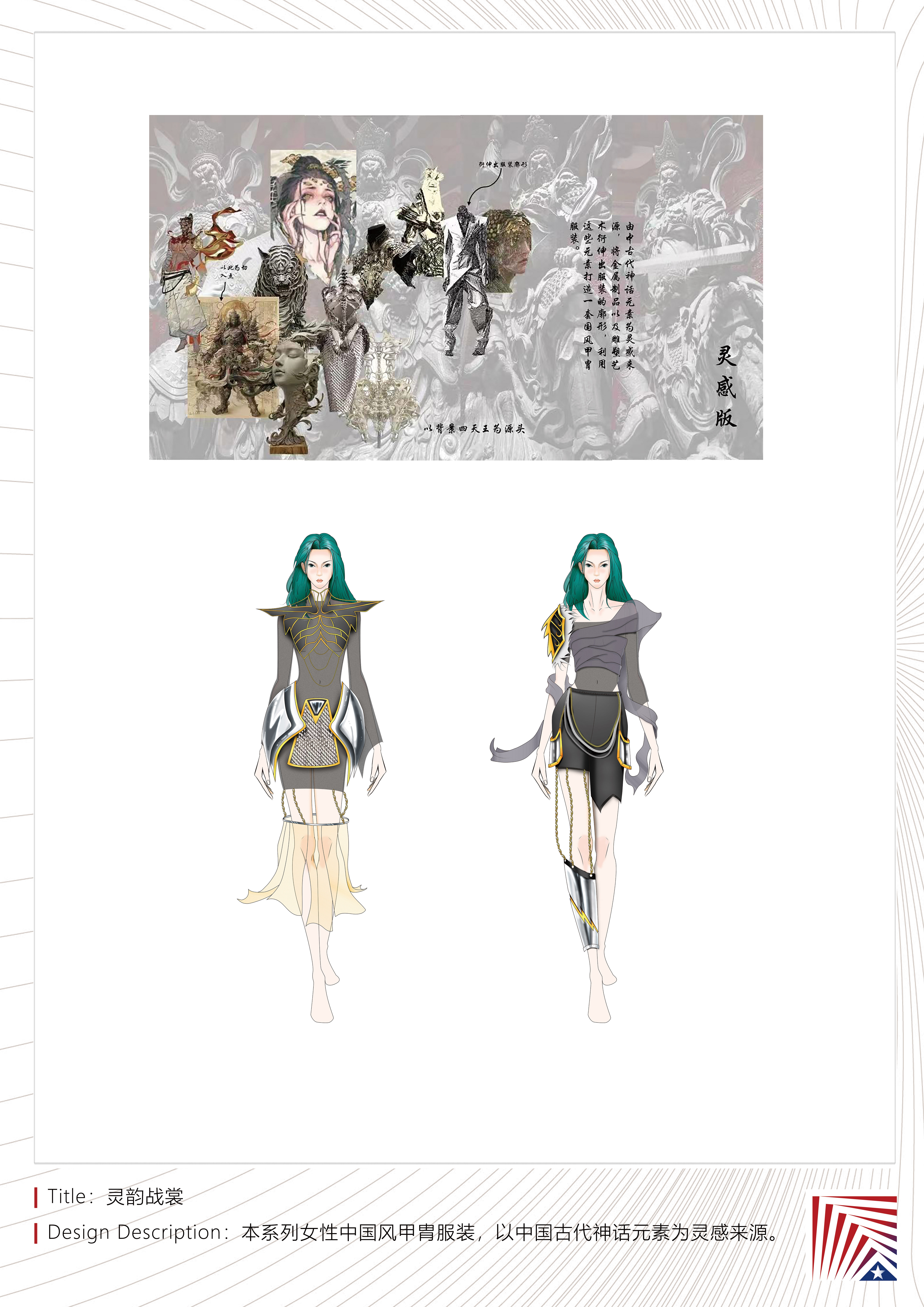 作品说明:本系列女性国风甲胄服装,以中国神话元素为灵感源泉,旨在打造独具魅力的时尚之作。设计灵感上,紧紧围绕中古代神话展开,以四大天王等神话形象为背景源头,从神话人物的威武姿态、华丽配饰及独特造型中提取精髓。同时,将神话中的神兽元素巧妙融入,如龙、麒麟等神兽的形态特征、纹理图案,为服装增添神秘而奇幻的色彩。