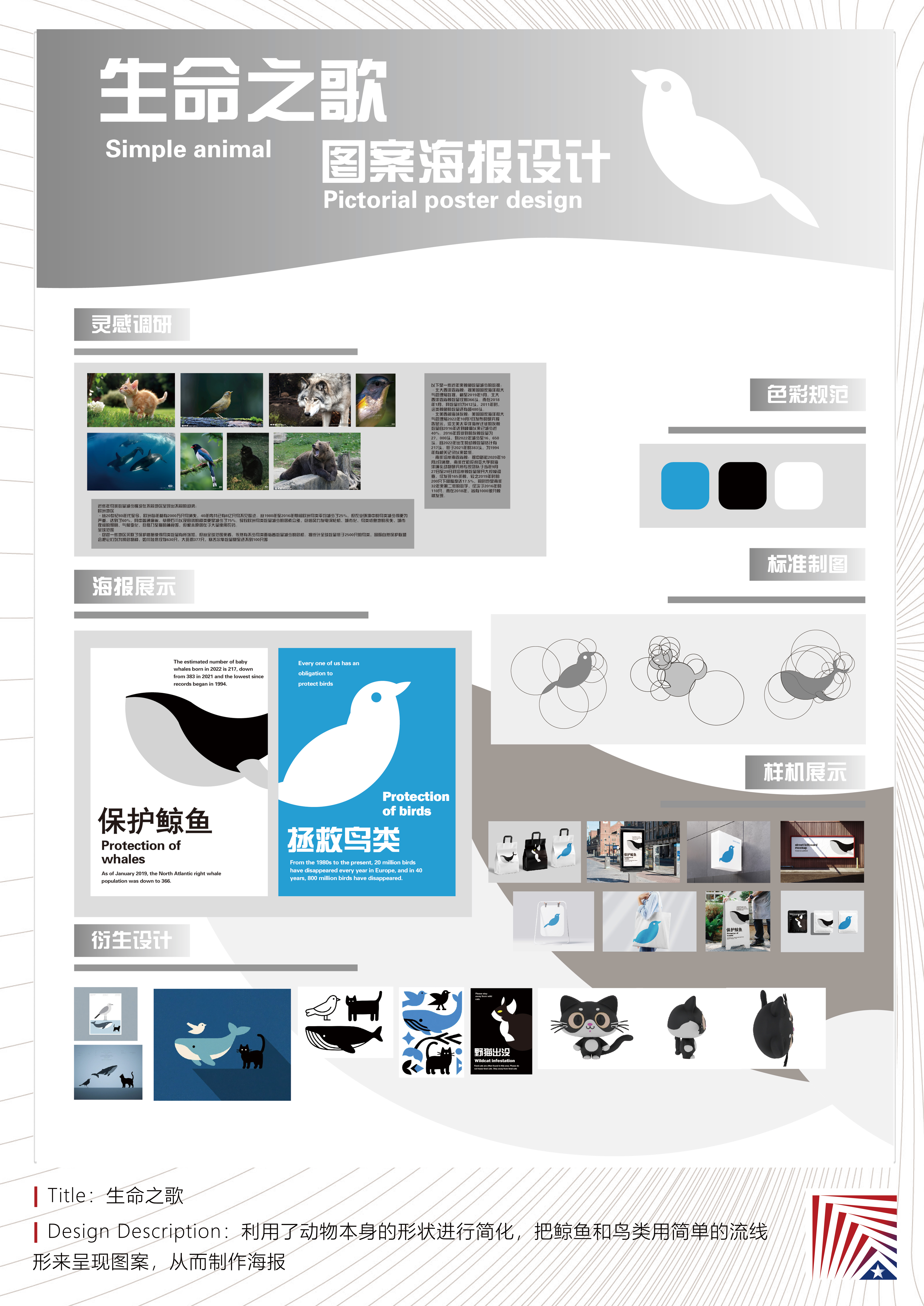 作品说明:利用了动物本身的形状进行简化,把鲸鱼和鸟类用简单的流线形来呈现图案,从而制作海报,来呼吁大家保护动物。