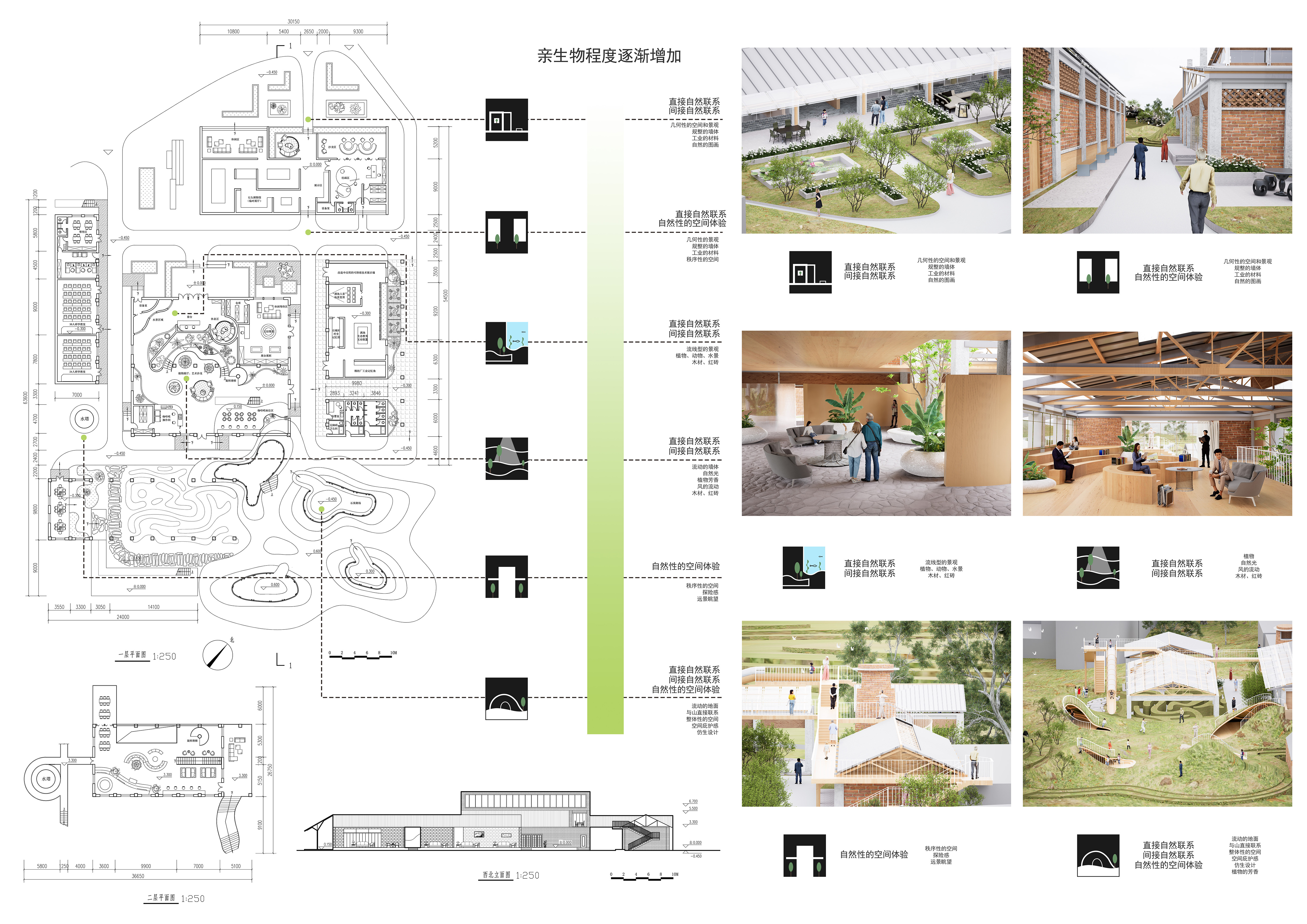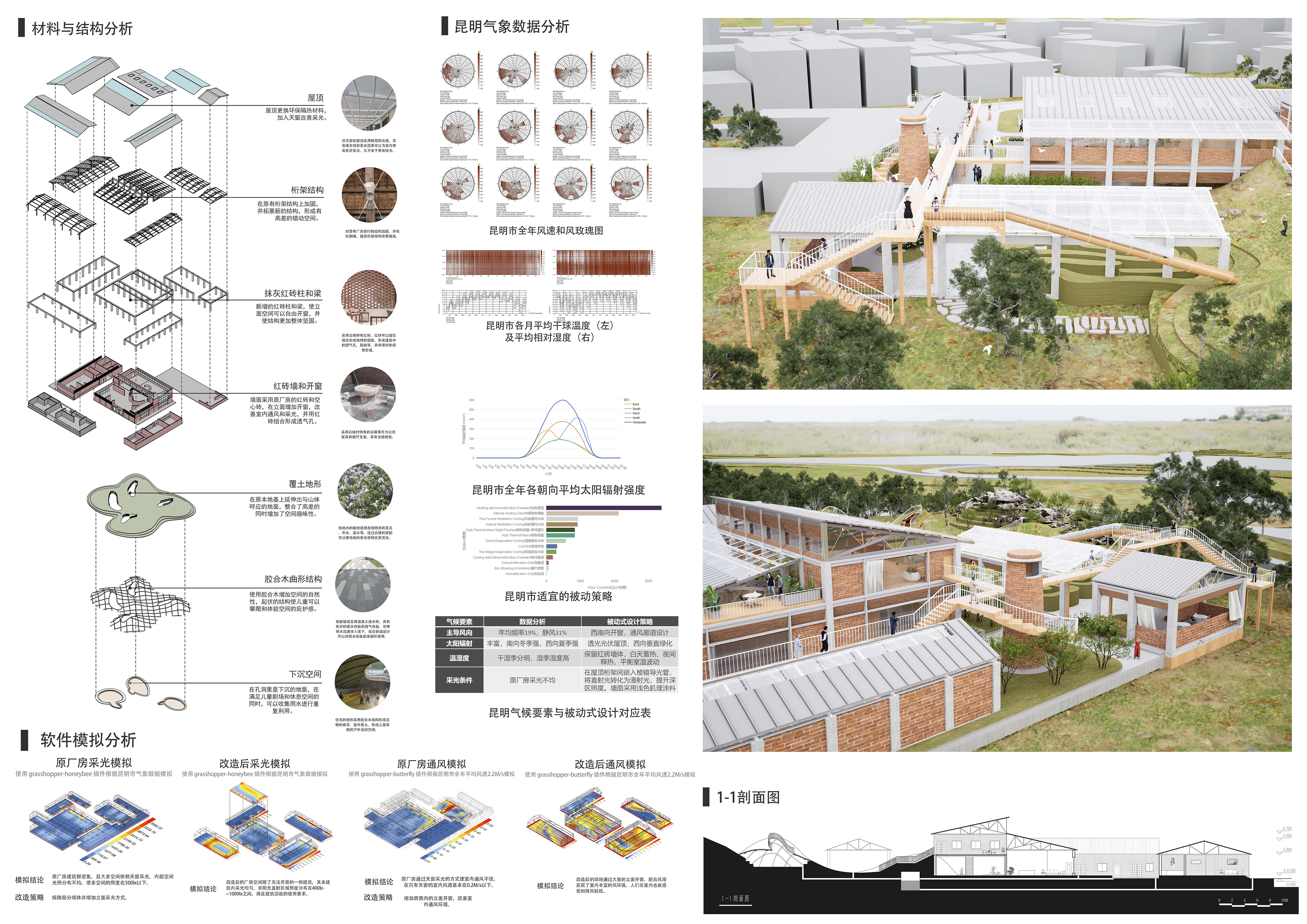 作品说明:本项目是对昆明市石城村废弃棉纺厂的更新改造,以亲生物设计为核心策略,改造通过结构加固、透光屋顶替换及局部拆除,将厂房转化为开敞的滇池美学体验馆与社区咖啡书吧,最大化引入自然光与风、巧妙利用场地后山地形,塑造可攀爬的仿生草坡山丘,其内部嵌有儿童剧场与休魏空间。设计充分尊重场地自然基底,采用低干预手法整合本土植被,实现工业遗迹与生态的共生,改造后的空间成为连接游客与村民的活力核心,提供沉漫式自然体验,激活乡村社区感知力与社会互动。