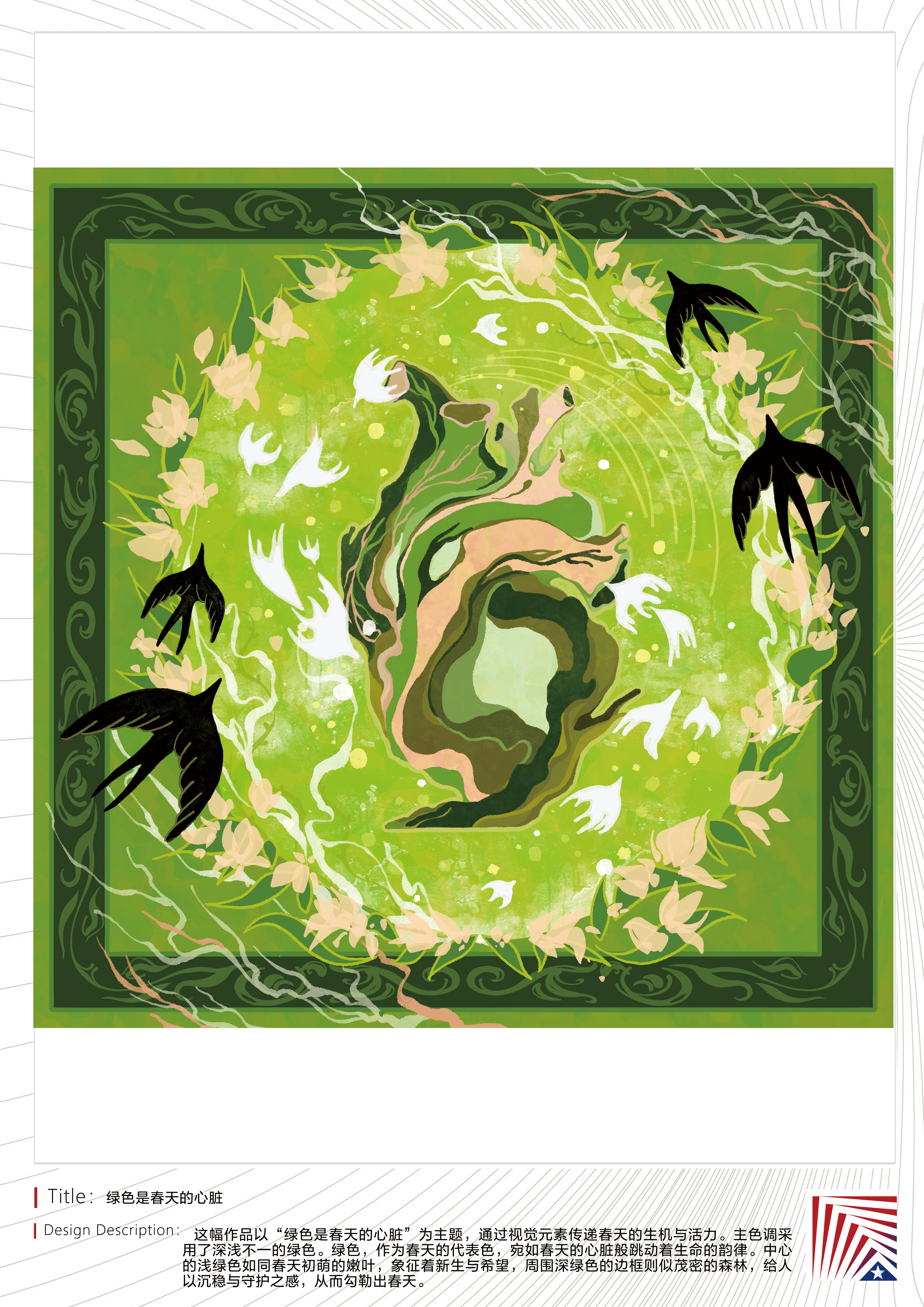 作品说明:这幅作品以“绿色是春天的心脏”为主题,通过视觉元素传递春天的生机与活力。主色调采用了深浅不一的绿色。绿色,作为春天的代表色,宛如春天的心脏般跳动着生命的韵律。画面中心的浅绿色如同春天初萌的嫩叶,象征着新生与希望,周围深绿色的边框则似茂密的森林,给人以沉稳与守护之感,从而勾勒出春天。画面核心是由树枝组成的绿色图形,其形态犹如一颗跃动的心脏,寓意着春天蓬勃的生命力。灵感来源于校园中,枯木逢春,抽出新芽,有着无限的生机与活力,在春日开学的我们,也有着无限热爱艺术的有力的跃动的心脏。围绕核心图形的是白色飞鸟,它们或展翅翱翔,或轻盈掠过,象征着春天带来的自由与灵动,黑色燕子分布在画面边缘,初春,燕子归来,燕子是春天的使者,它们的存在强化了春天的主题。此外,浅粉色的花朵图案环绕四周,花朵的柔美与绿色的活力相互映衬,展现出春天万物竞发、繁花似锦的景象。这些花朵并非写实描绘,而是以简洁抽象的形式呈现,增添了画面的艺术感与梦幻氛围。周边花纹采用卷草纹,寓意生生不息,不断延续,象征着春天蓬勃的生命力。整体构图采用中心对称式,将核心元素置于画面中心,给人以稳定、和谐之感。四周的装饰元素围绕中心有序分布,引导观者的视线从画面边缘逐渐聚焦到中心,如同人们在春天里,从感知周围的细微变化,到体会春天核心的蓬勃生机,让人们在欣赏画作的同时,仿佛能触摸到春天的脉搏,感受到大自然的神奇与美好。