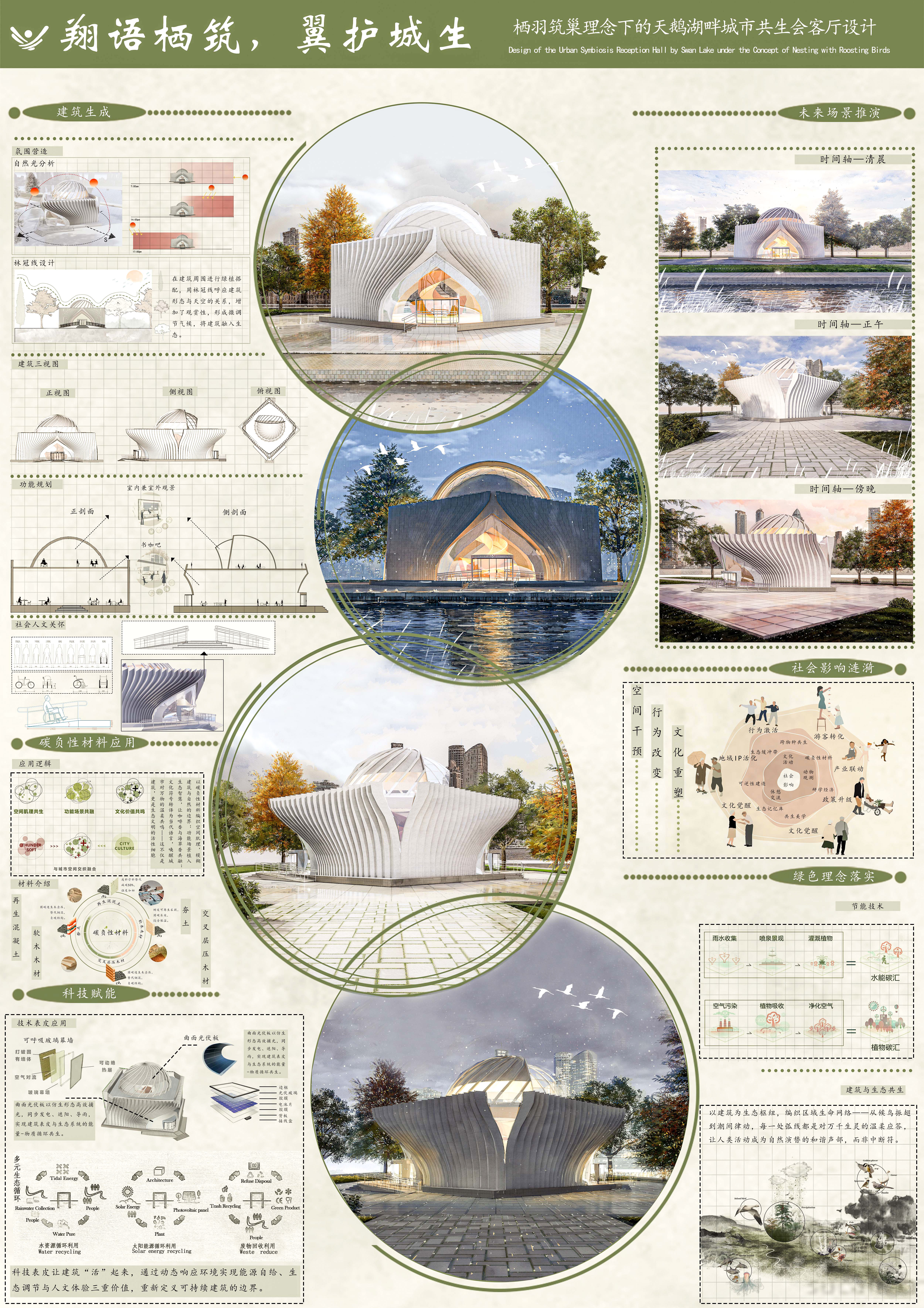建筑主体似一对环抱的翅膀,中央隆起的球形核心象征“城市之卵”,内设咖啡书吧与生物观测空间,寓意知识与社交在此孵化;让建筑成为自然与城市对话的“翔语者”。功能与情共鸣。市民于”羽翼”之下漫步、阅读或观景,恰似雏鸟受庇于成鸟的温暖一一城市不再仅是冰冷的容器,而成为有温度的生命体。夜幕降临时,内透光透过羽状结构洒向广场,宛如天鵝夜宿时荧荧的轮廓,以柔和的姿态点亮都市的温情记忆。