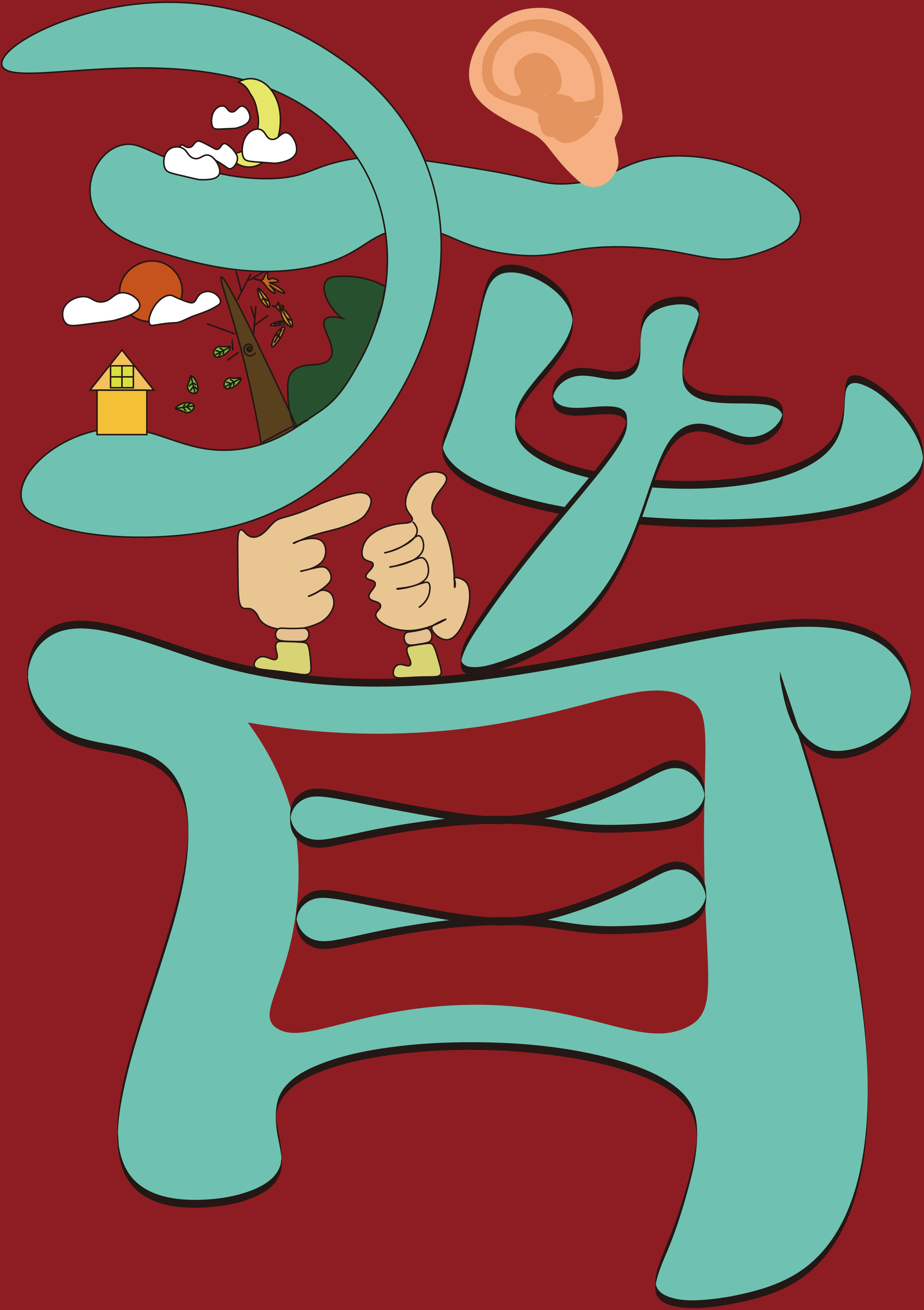 作品说明:这幅《聋》以创意字体化设计呈现,将“聋”字作为核心视觉符号。字体以灵动的青绿色呈现,打破常规字形束缚,融入丰富创意元素:上部嵌套日月、云朵、房屋、树木等自然场景,传递无声世界里独特的宁静与生机;旁侧的耳朵图形,与“聋”的语义形成直观呼应,却用俏皮的手势符号(你好),消解“聋”带来的沉重,展现特殊群体积极的生活态度。作品借由字体创意,探索“聋”这一状态的多元表达,既呈现听障群体所处的无声环境,又以活泼元素传递对他们乐观精神的理解与尊重,引发观者对听障群体生活与内心世界的关注、思考 。