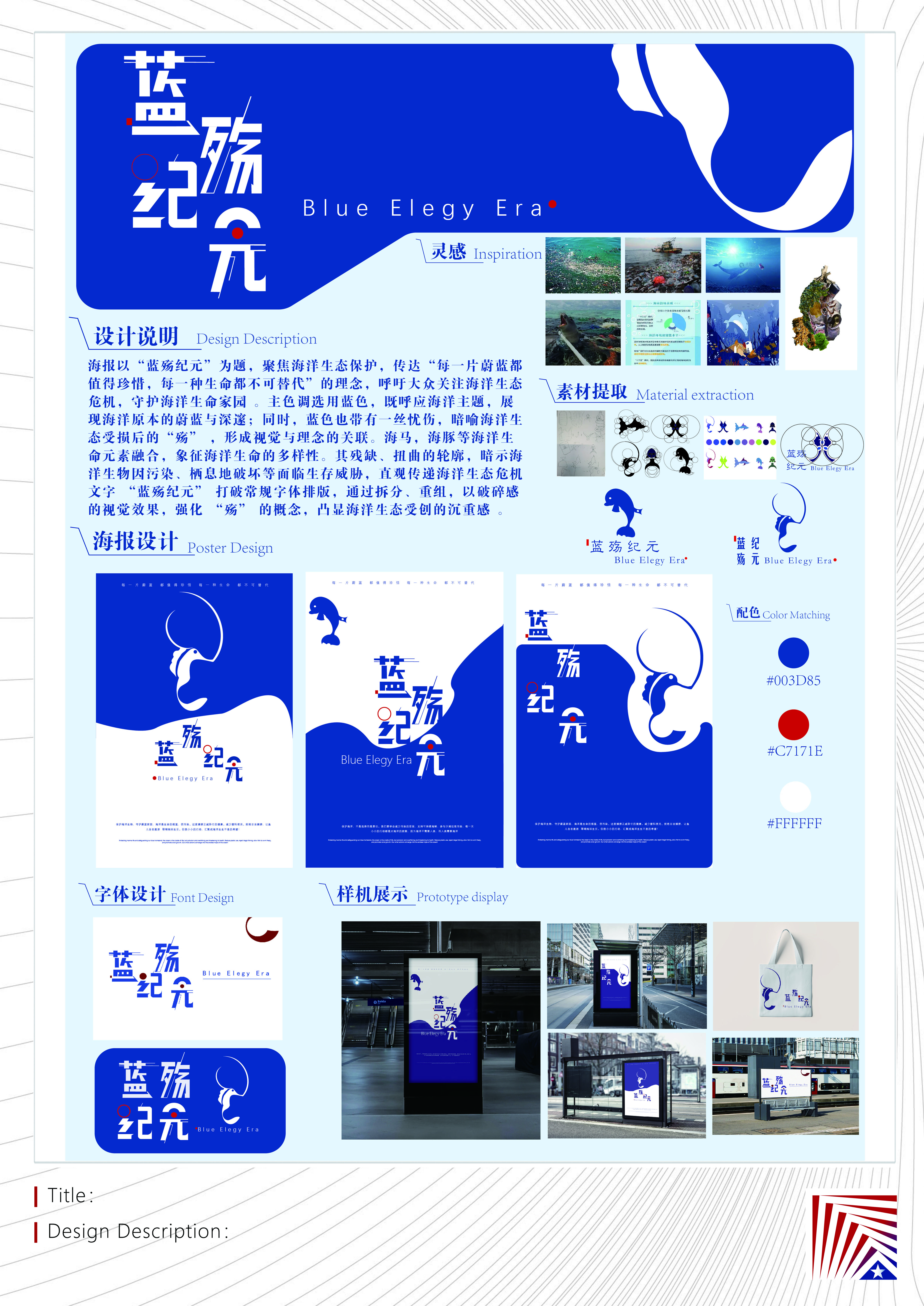 作品说明:海报以“蓝殇纪元”为题,聚焦海洋生态保护,传达“每一片蔚蓝都值得珍惜,每一种生命都不可替代”的理念,呼吁大众关注海洋生态危机,守护海洋生命家园 。主色调选用蓝色,既呼应海洋主题,展现海洋原本的蔚蓝与深邃;同时,蓝色也带有一丝忧伤,暗喻海洋生态受损后的“殇” ,形成视觉与理念的关联。右侧以抽象化的海洋生物形态呈现,海马,海豚,等海洋生命元素融合,象征海洋生命的多样性。其残缺、扭曲的轮廓,暗示海洋生物因污染、栖息地破坏等面临生存威胁,直观传递海洋生态危机 。文字 “蓝殇纪元” 打破常规字体排版,通过拆分、重组,以破碎感的视觉效果,强化 “殇” 的概念,凸显海洋生态受创的沉重感 。