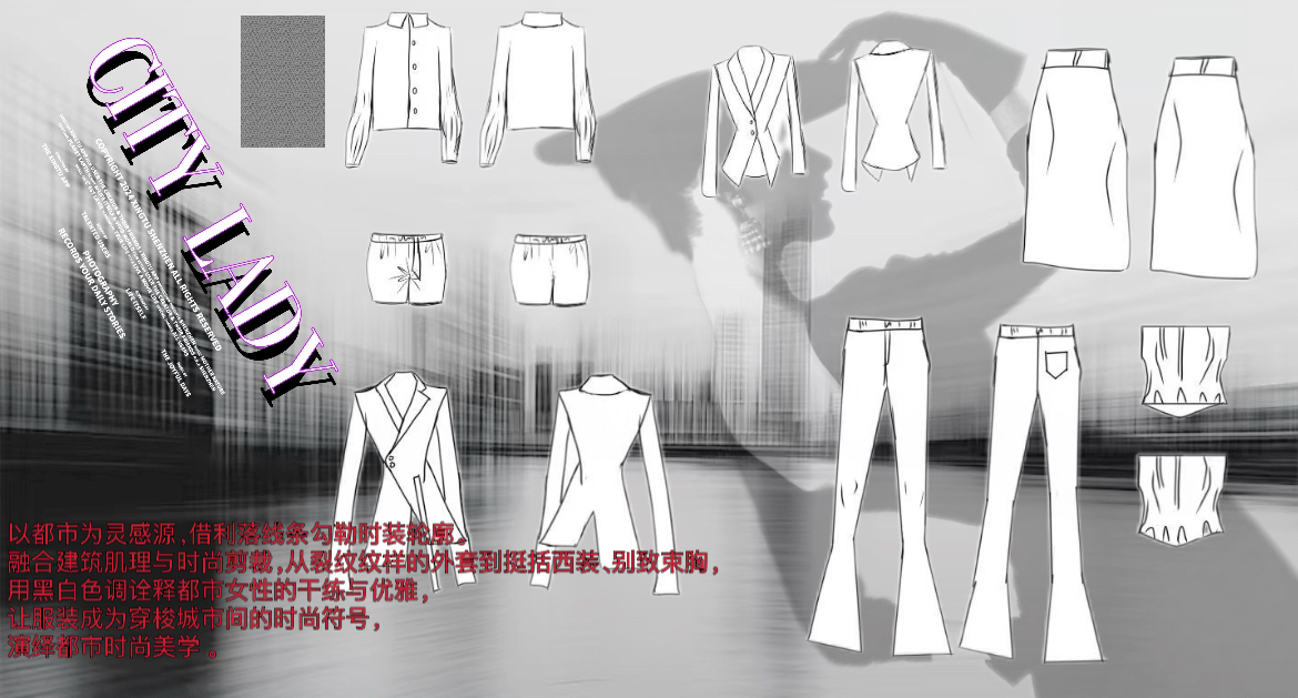 作品说明:以都市为灵感源,借利落线条勾勒时装轮廓。融合建筑肌理与时尚剪裁,从裂纹纹样的外套到挺括西装、别致束胸,用黑白色调诠释都市女性的干练与优雅,让服装成为穿梭城市间的时尚符号,演绎都市时尚美学 。