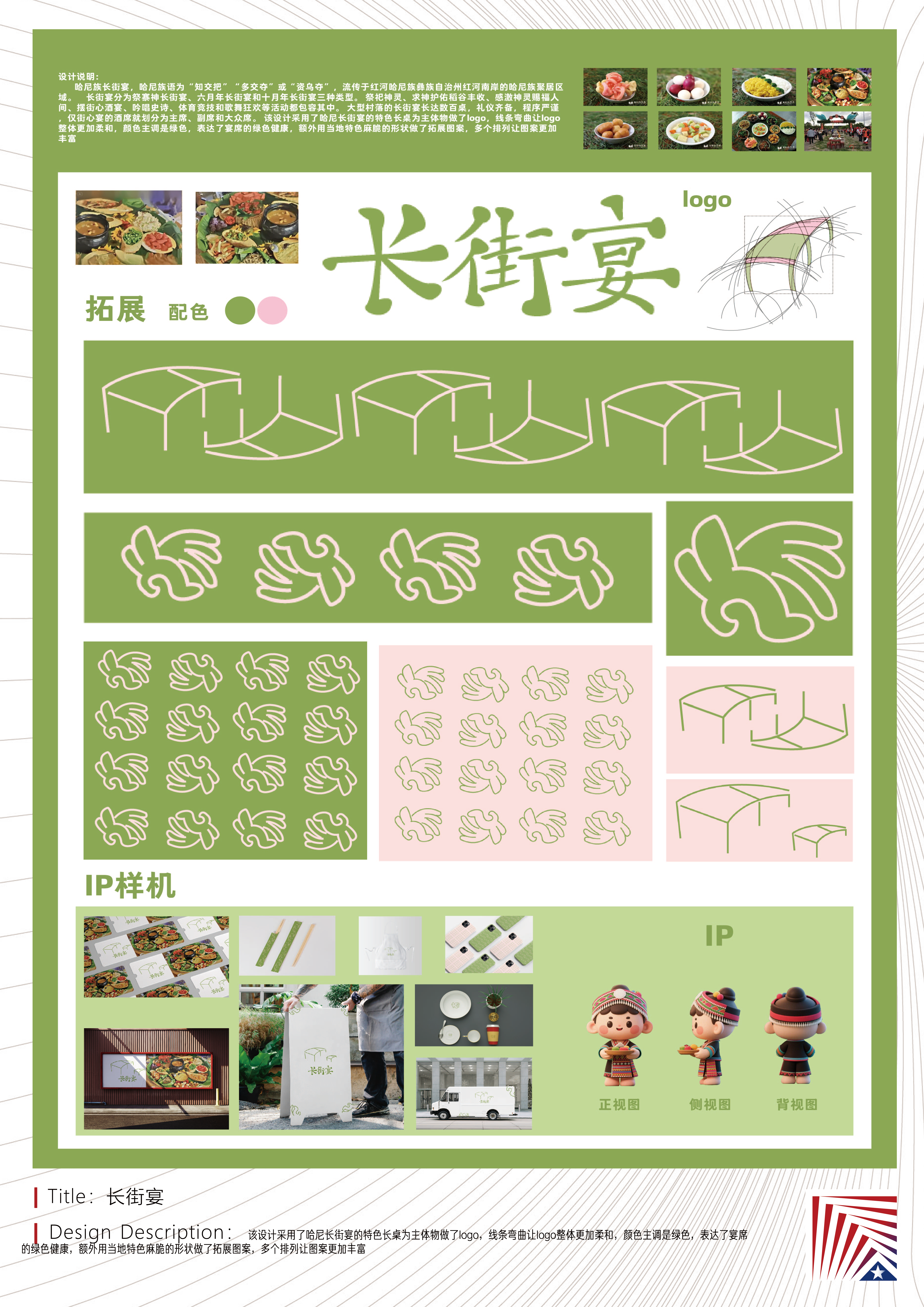 作品说明:哈尼族长街宴,哈尼族语为“知交把”“多交夺”或“资乌夺”,流传于红河哈尼族彝族自治州红河南岸的哈尼族聚居区域。 长街宴分为祭寨神长街宴、六月年长街宴和十月年长街宴三种类型。 祭祀神灵、求神护佑稻谷丰收、感激神灵赐福人间、摆街心酒宴、吟唱史诗、体育竞技和歌舞狂欢等活动都包容其中。 大型村落的长街宴长达数百桌,礼仪齐备,程序严谨,仅街心宴的酒席就划分为主席、副席和大众席。 该设计采用了哈尼长街宴的特色长桌为主体物做了logo,线条弯曲让logo整体更加柔和,颜色主调是绿色,表达了宴席的绿色健康,额外用当地特色麻脆的形状做了拓展图案,多个排列让图案更加丰富