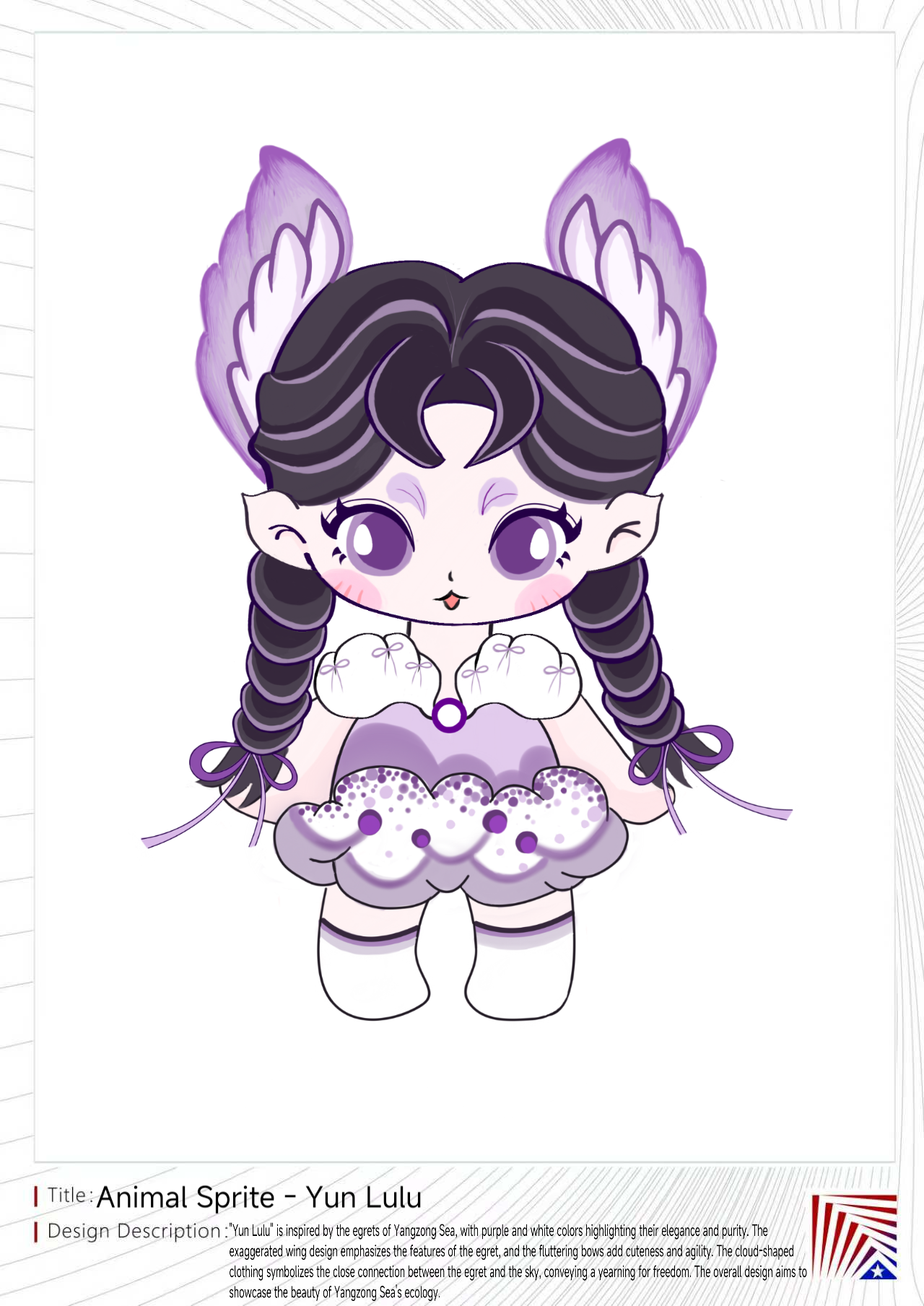 “云鹭鹭”以阳宗海白鹭为灵感,紫色与白色搭配,彰显其优雅与纯净。夸张的翅膀设计,突出白鹭特征,飘动的蝴蝶结增添可爱与灵动。云朵形状的服饰,象征白鹭与天空的紧密联系,传递对自由的向往。整体设计意在展现阳宗海生态之美。