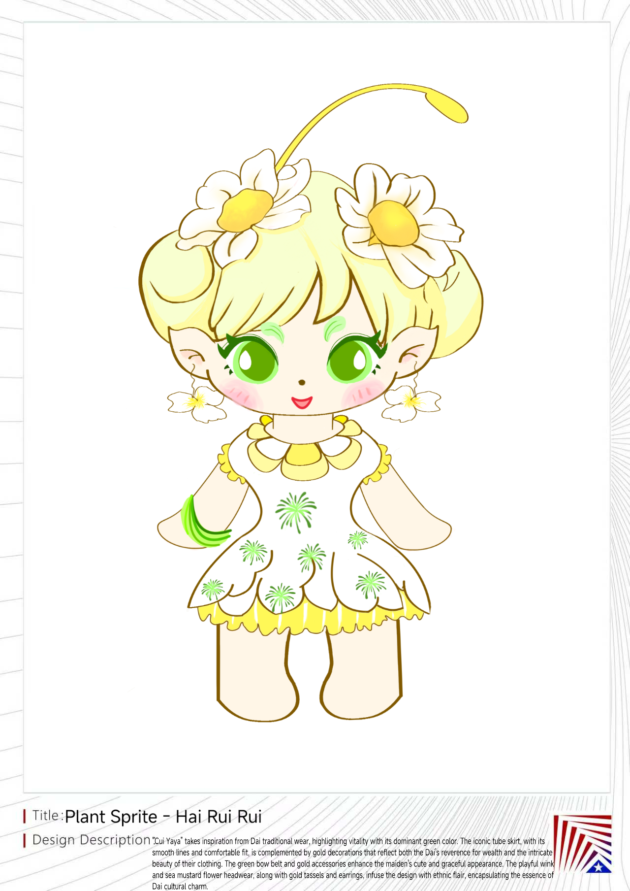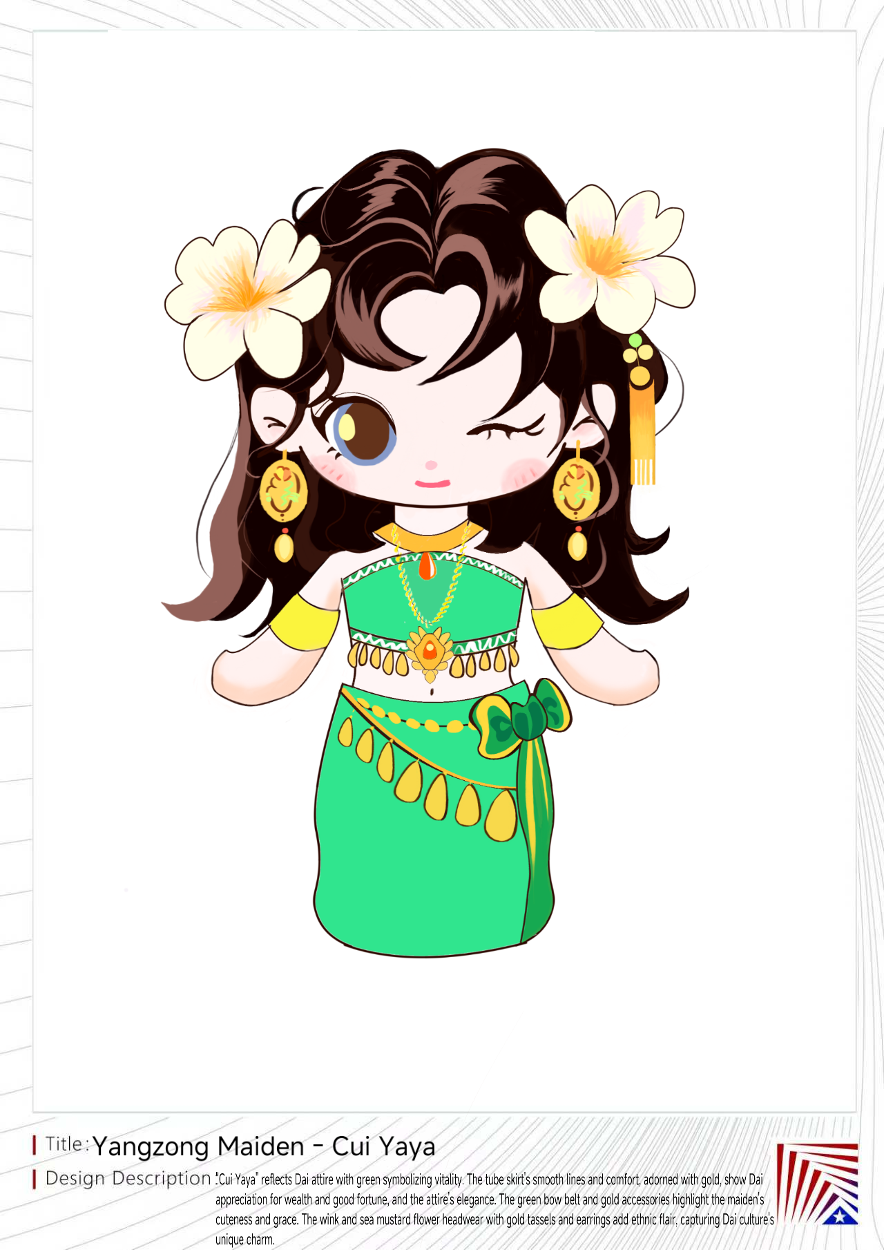 “翠雅雅”以傣族服饰为灵感,绿色主调象征生命力。筒裙作为傣族女性的传统服饰,以其流畅的线条和舒适的穿着体验著称,搭配金色装饰,不仅彰显出傣族对富贵吉祥的崇尚,也体现了服饰的精致与华丽。绿色蝴蝶结腰带与金色配饰相得益彰,突出傣族姑娘的可爱与优雅。wink的表情设计增添一丝灵动与海菜花头饰和金色流苏和耳环,增添民族风情,意在诠释傣族文化的独特魅力。