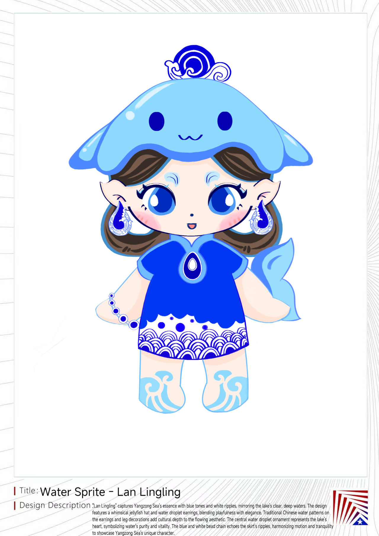 “澜灵灵”,象征阳宗海的清澈与灵动。以蓝色为主调,白色波纹点缀,映射湖水的纯净与深邃。水母帽与水滴耳饰俏皮可爱,耳环和腿部装饰融入中国传统水纹样,流动美感中蕴含文化韵味。胸前水滴装饰,象征湖泊之心,凝练表达水的纯净与生命力。蓝白珠链与裙装波纹相映成趣,动静结合,尽显阳宗海特色。