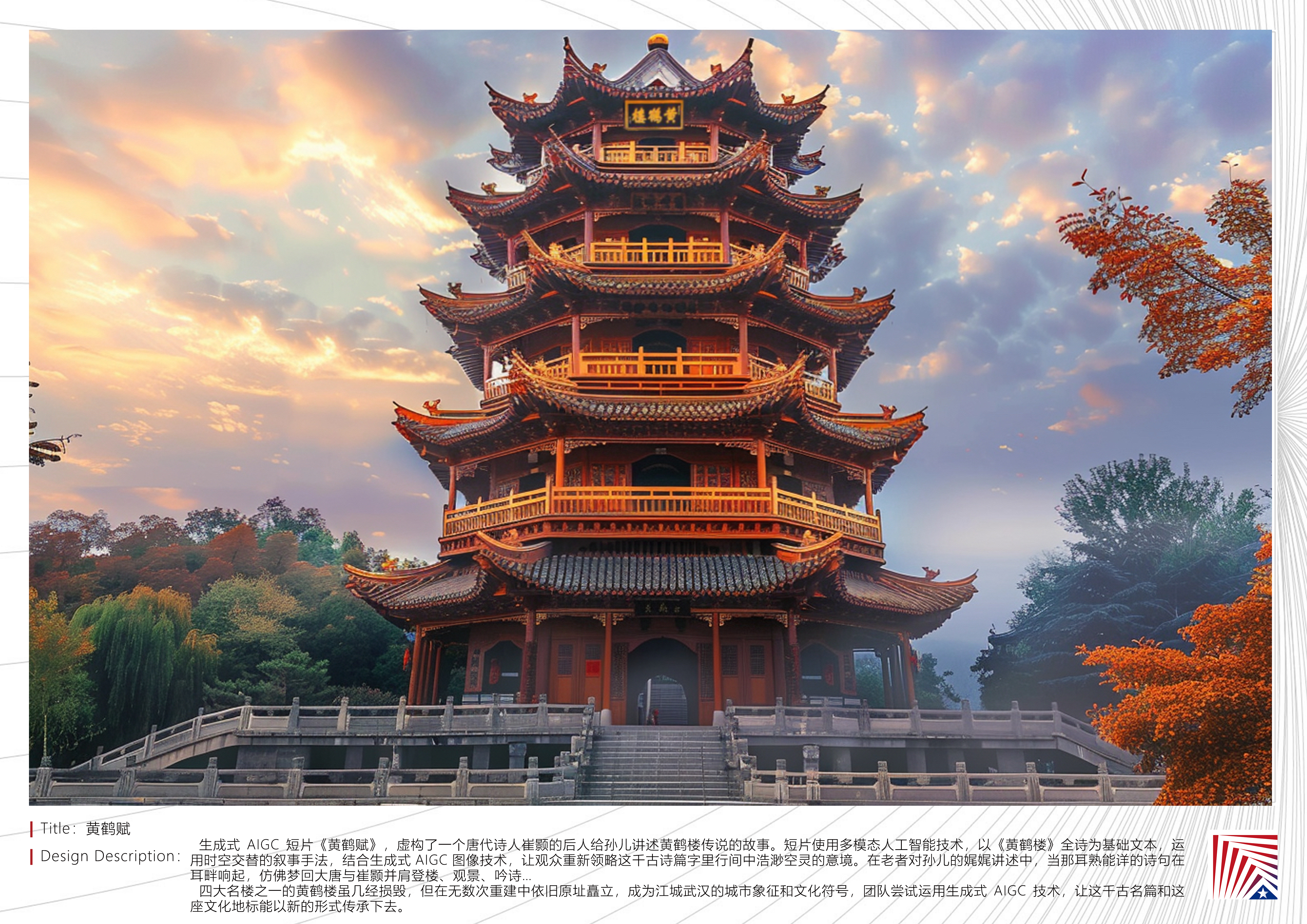四大名楼之一的黄鹤楼虽几经损毁,但在无数次重建中依旧原址矗立,成为江城武汉的城市象征和文化符号,团队尝试运用生成式 AIGC 技术,让这千古名篇和这座文化地标能以新的形式传承下去。